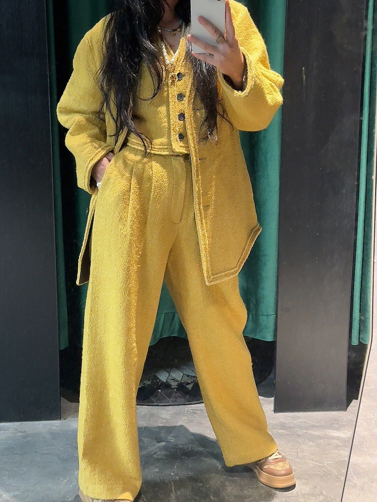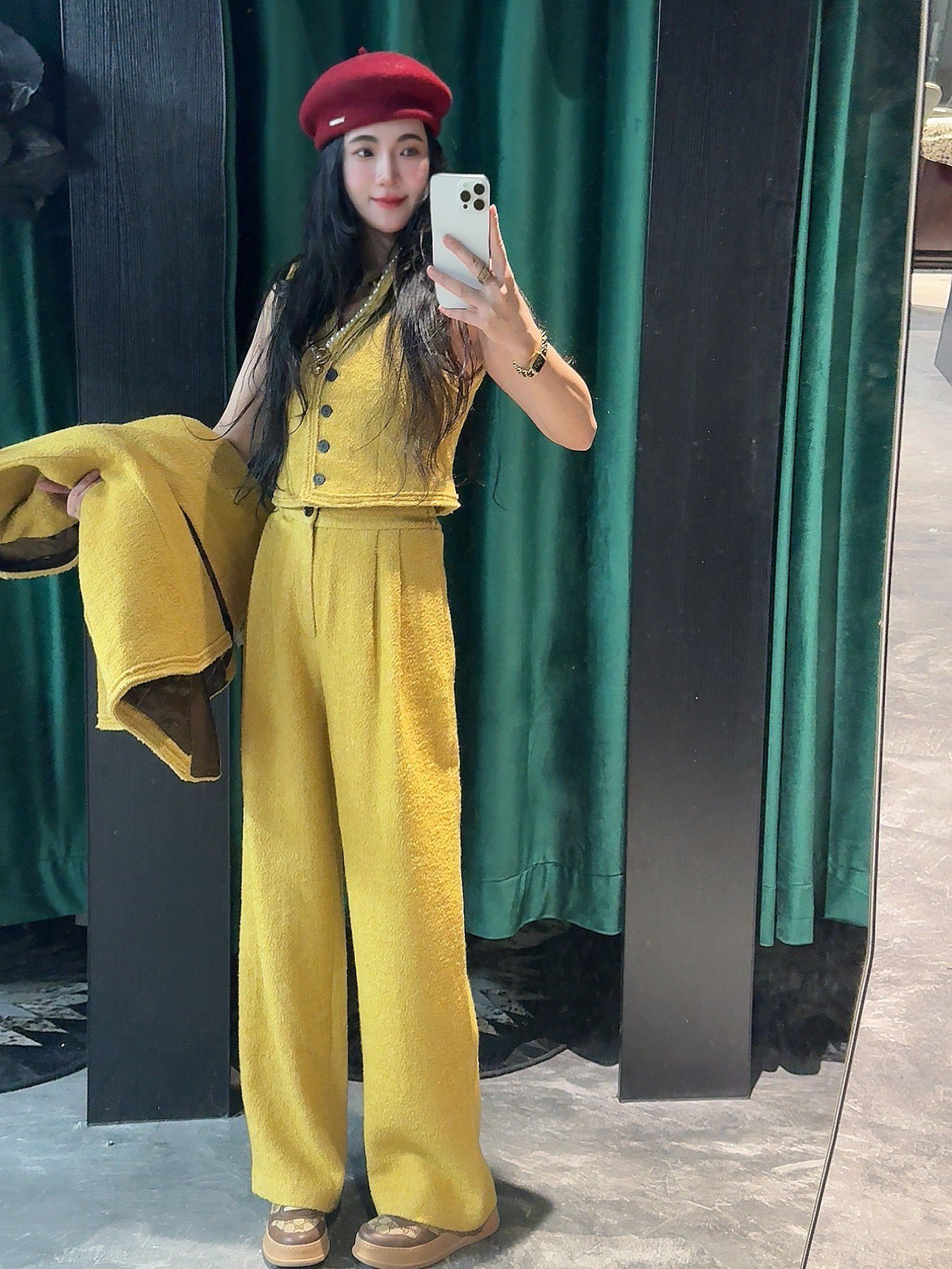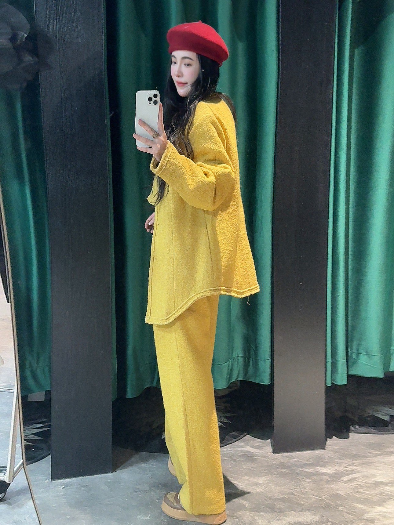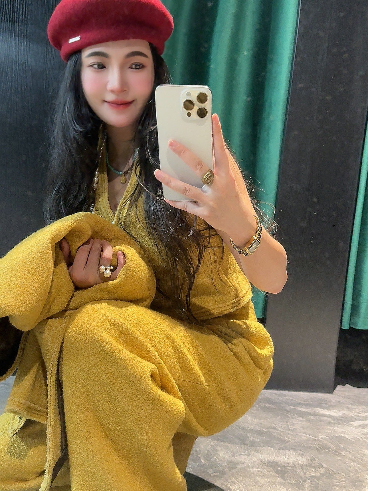 秋冬必不可少的当然是这套暖暖的黄色套装,上衣是简洁大方的西装剪裁 宽松挺阔的版型 上身气场⑩足