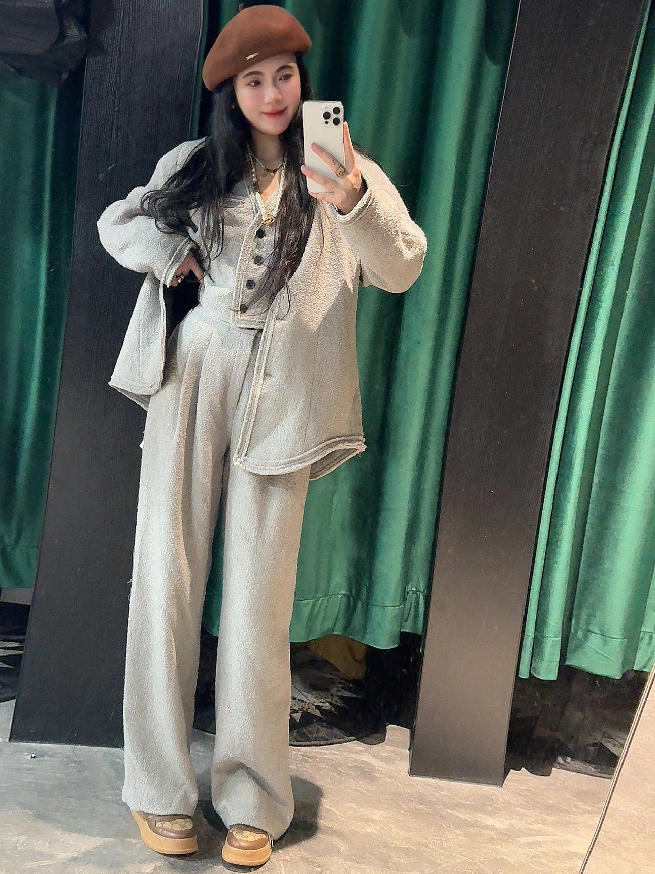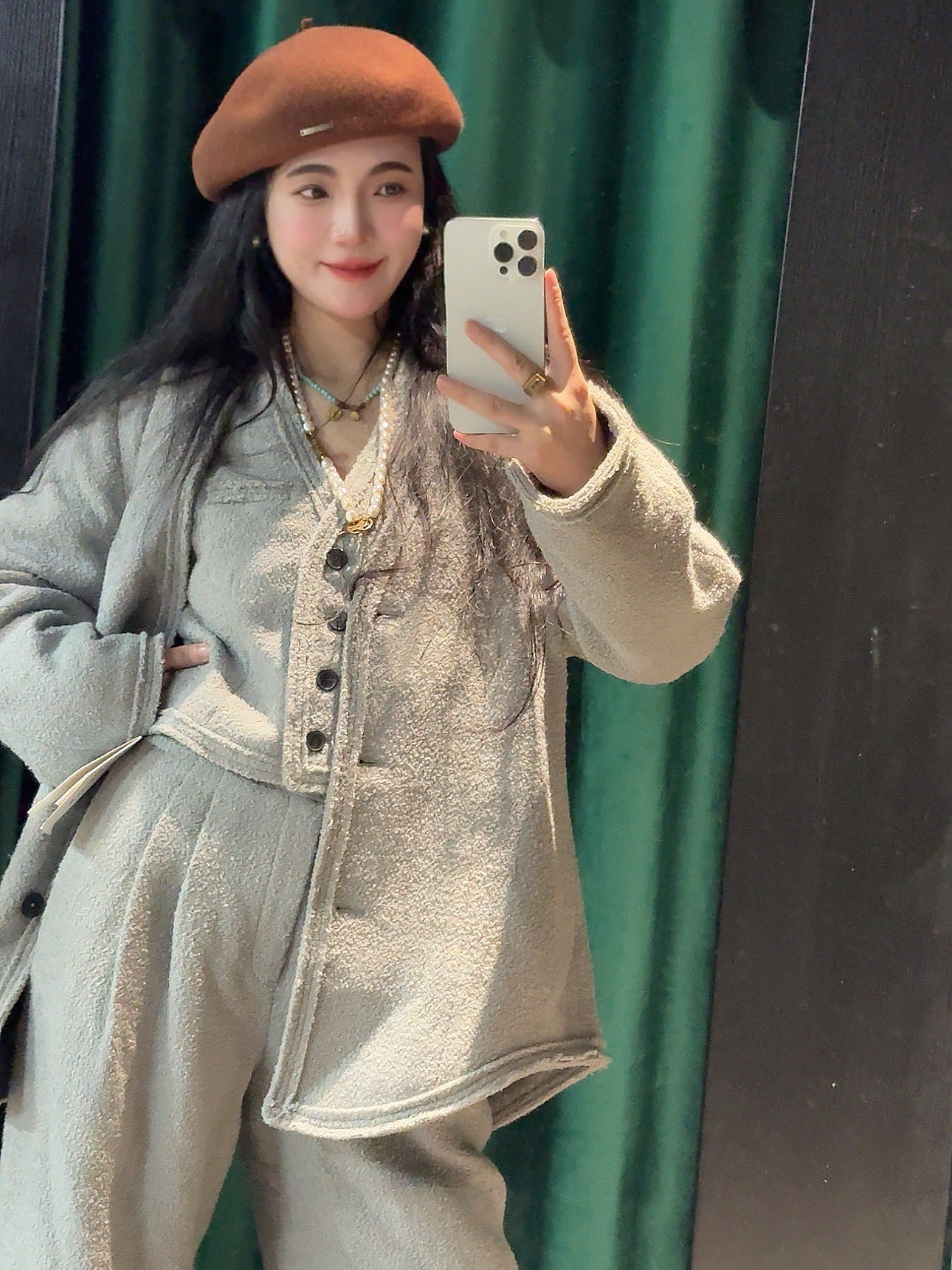 内里夹棉 不显臃肿 包容度也很友好哦~肩部微垫肩设计 轻松穿出直角肩效果 利落的平驳领很有气质 单排扣设计 方便日常穿脱 下身经典的直筒裤。遮跨显瘦 视觉上收拢臀腿 上身温柔知性 高级感满满