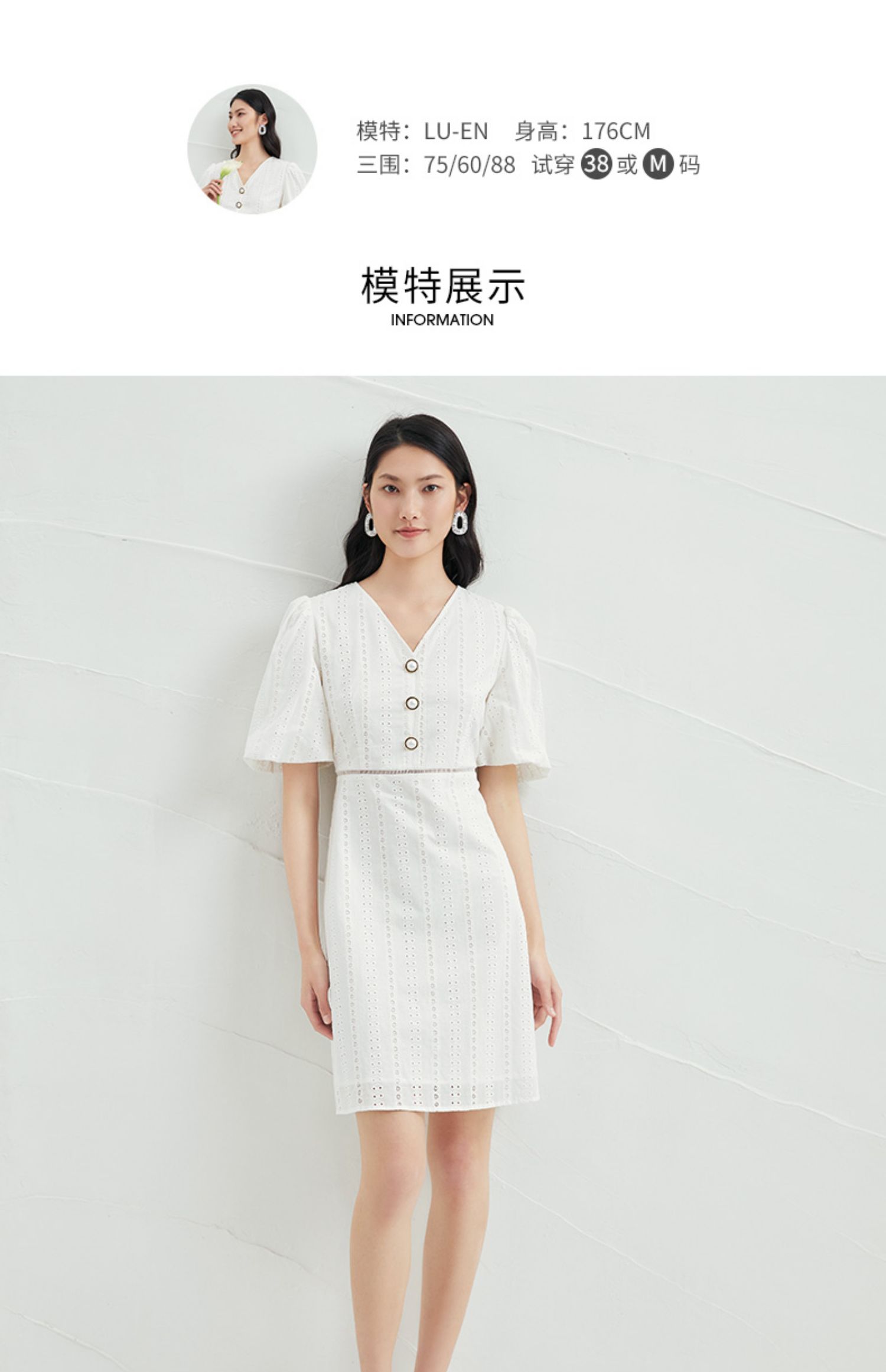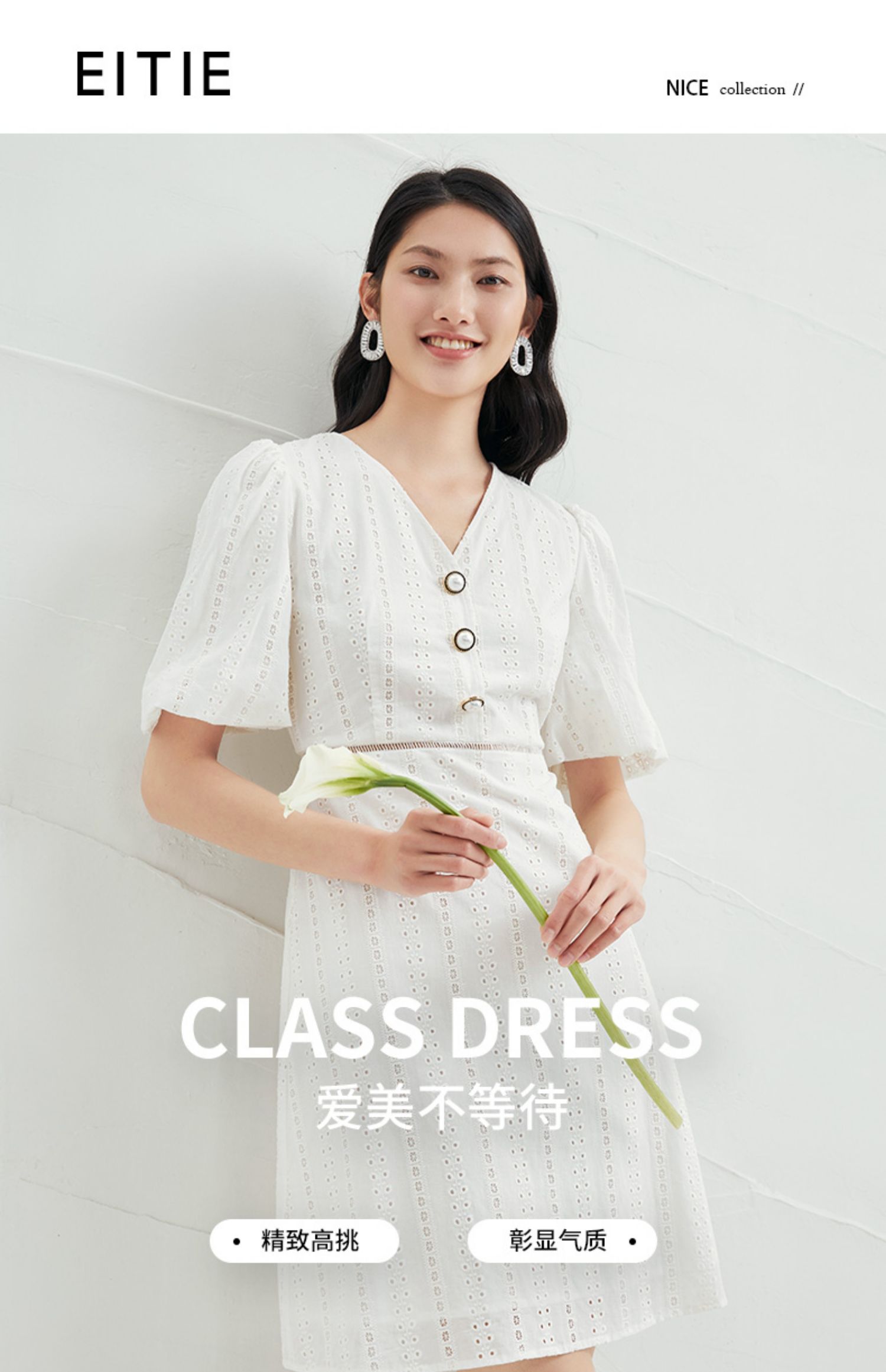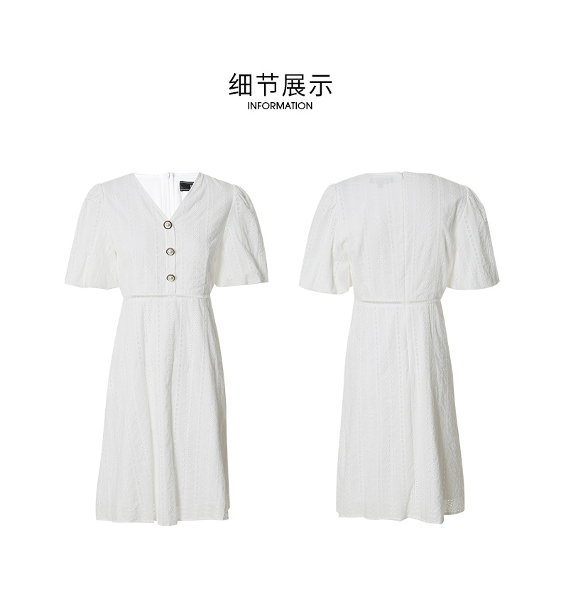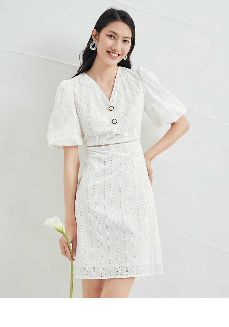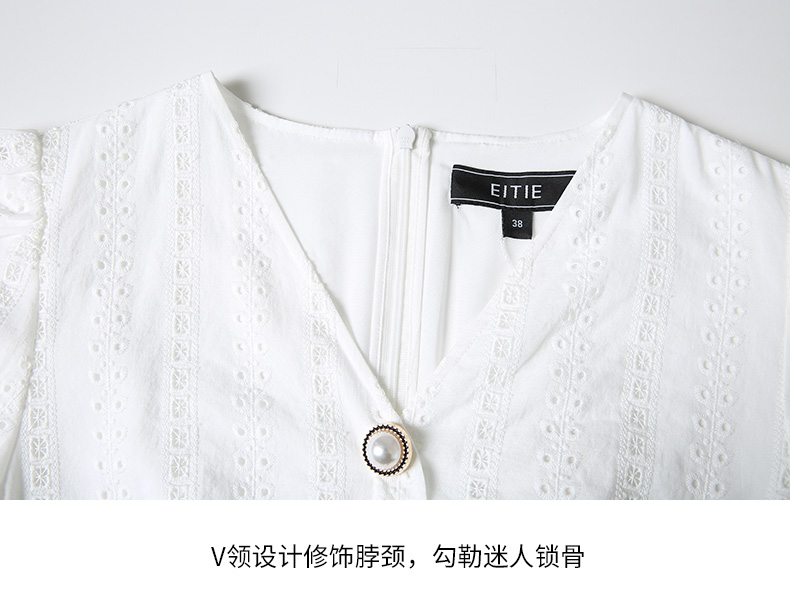 EITIE爱特爱夏季新款V领泡泡袖复古显瘦白色镂空纯棉连衣裙B2207946
