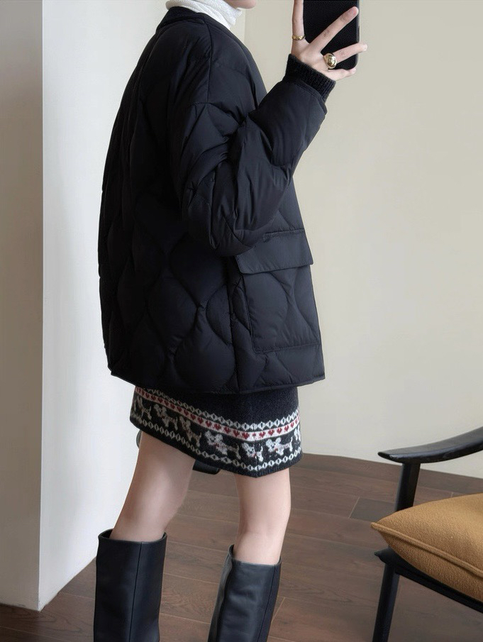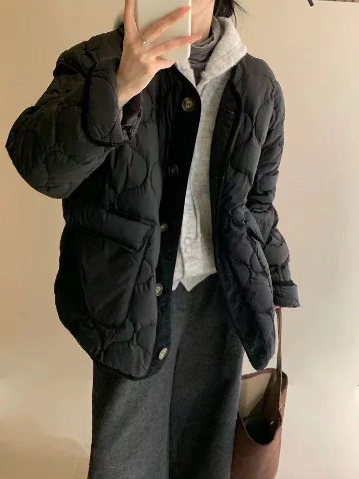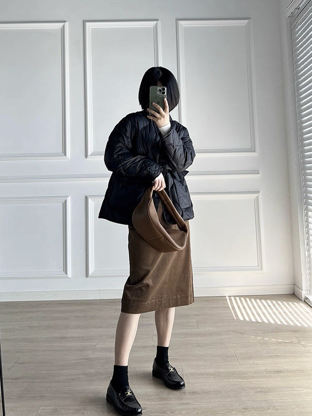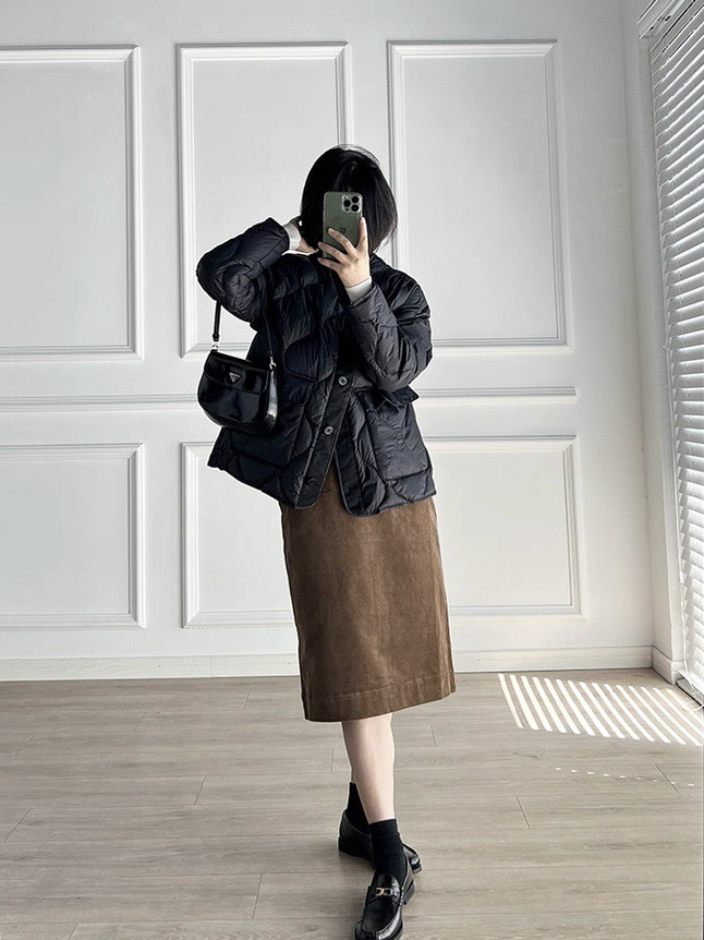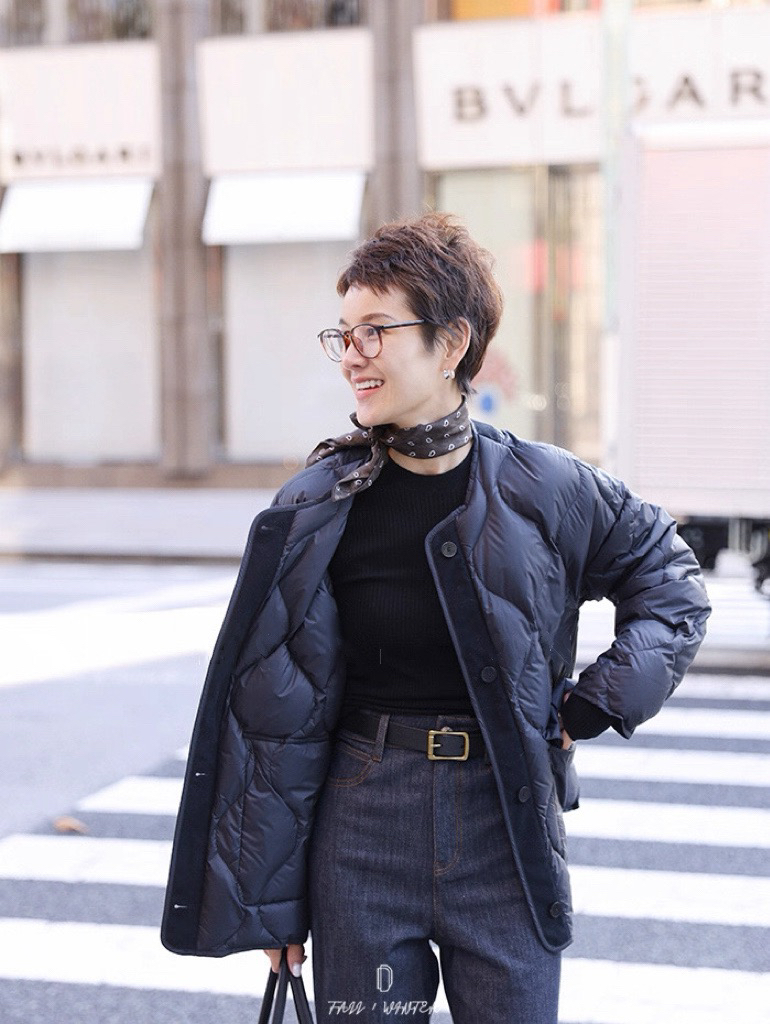 轻量羽绒裹住凉意,宽腿牛仔衬出随性,丝巾与拼色包太点缀了 把通勤的节奏,穿成不费力的时髦