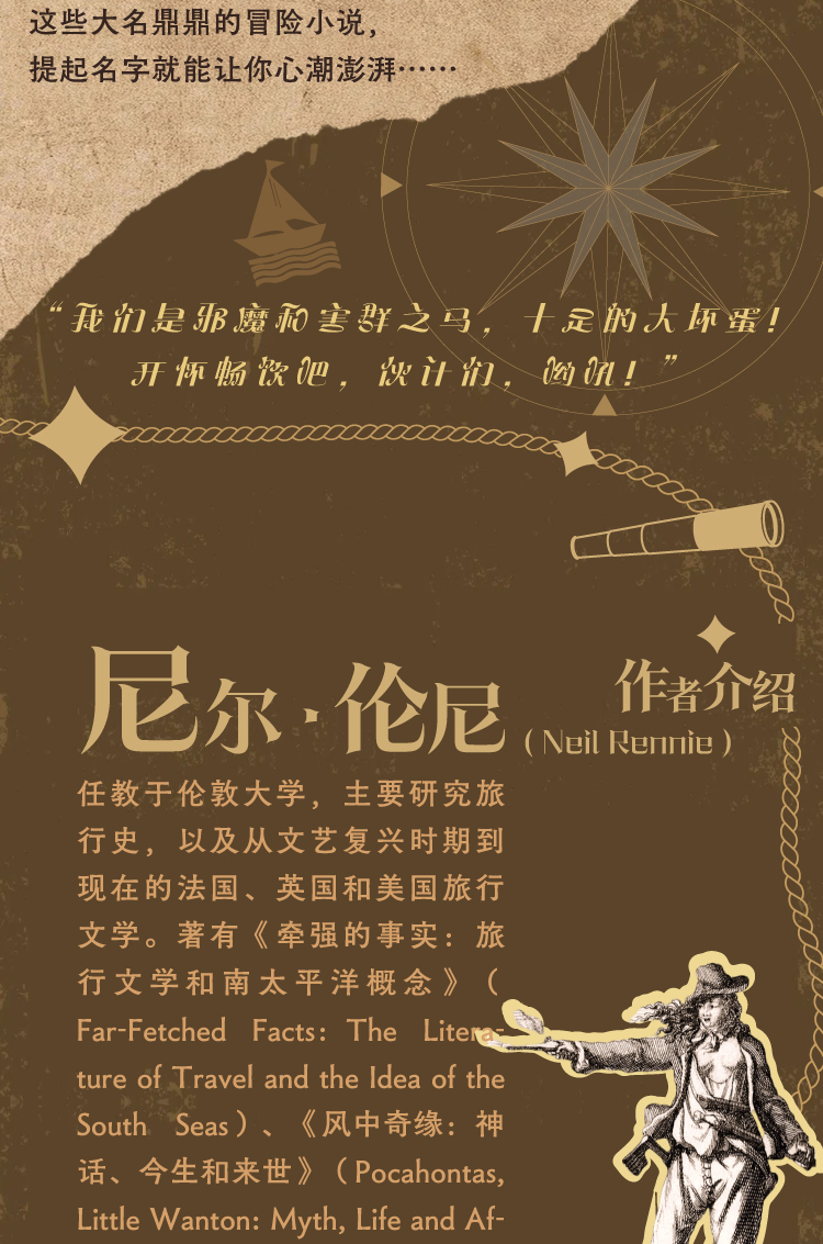 尼尔·伦尼(Neil Rennie),任教于伦敦大学,主要研究旅行史,以及从文艺复兴时期到现在的法国、英国和美国旅行文学。著有《牵强的事实:旅行文学和南太平洋概念》(Far-Fetched Facts:The Literature of Travel and the Idea of the South Seas)、《风中奇缘:神话、今生和来世》(Pocahontas, Little Wanton: Myth, Life and Afterlife)、《寻宝梦幻岛:海盗生活的真实与虚构》。