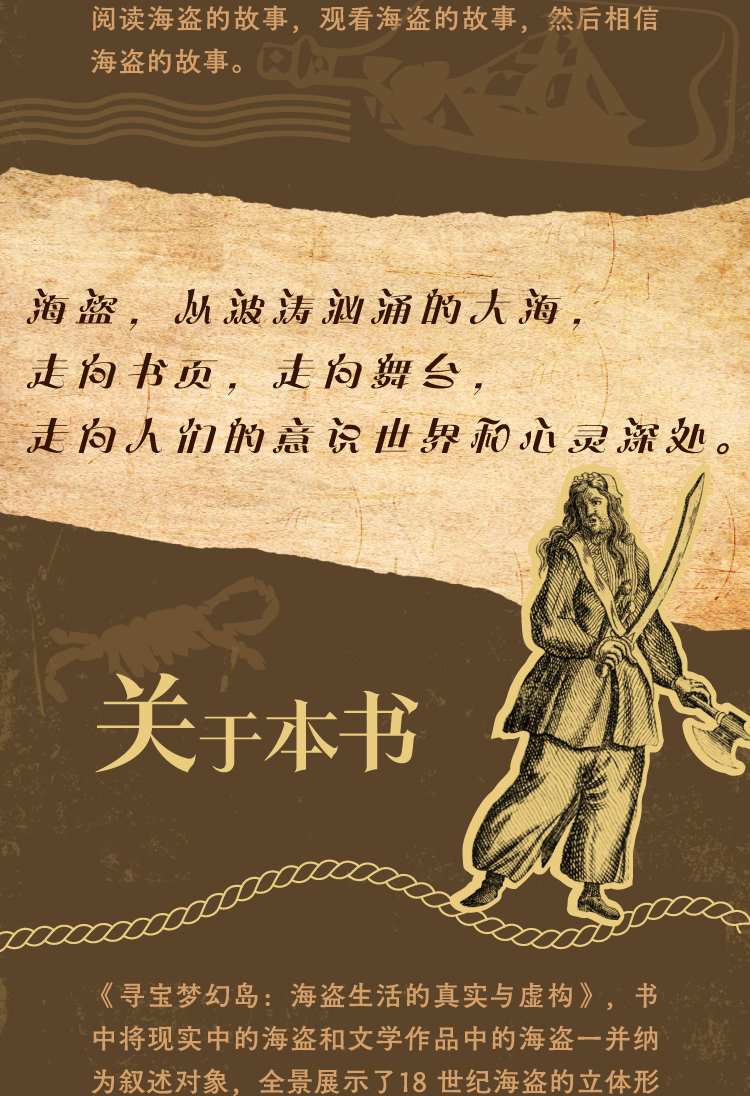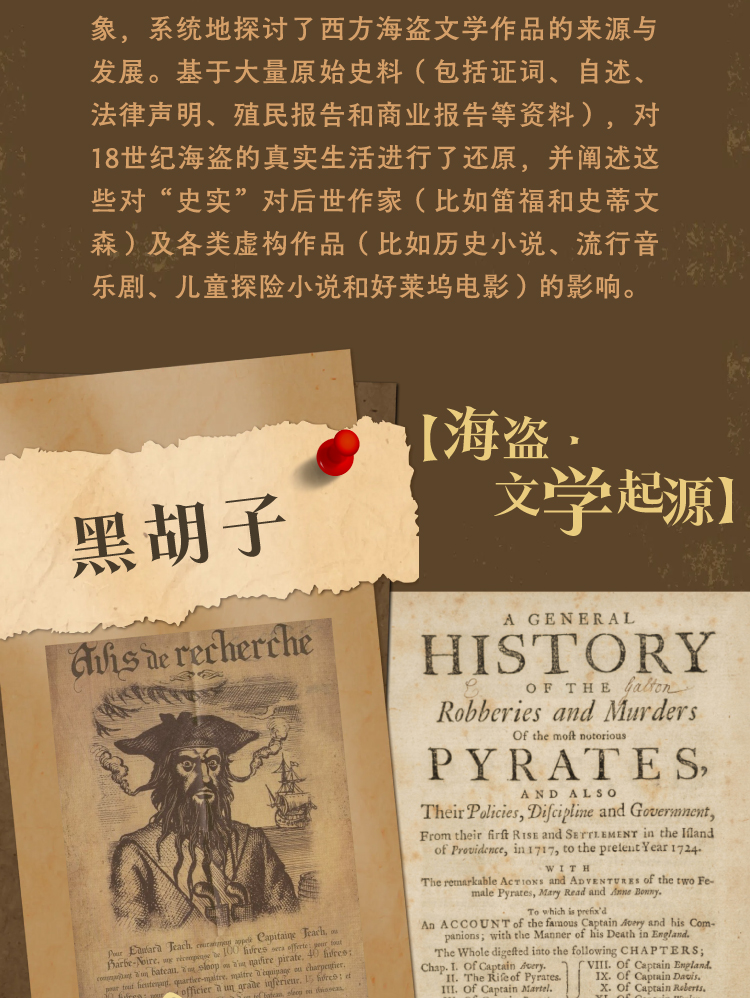 作者尼尔·伦尼将实中的海盗和文学作品中的海盗一并纳为叙述对象,全景展示了18世纪海盗的立体形象,系统地探讨了西方海盗文学作品的来源与发展。通过对大量原始史料(包括他人证言、相关故事、法律声明、殖民史料和商业记录等资料)的研究,本书对18世纪海盗的真实生活进行了还原,并阐述这些对“史实”对后世作家(比如笛福和史蒂文森)及各类虚构作品(比如历史小说、流行音乐剧、儿童探险小说和好莱坞电影)的影响。