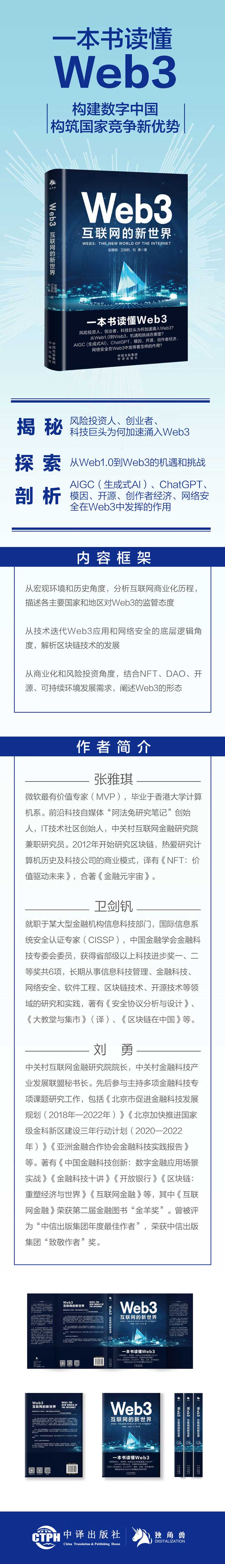 Web3的发展,不仅仅基于技术,还是人文社会思潮与金融经济共同作用的结果。加密文化的诞生、处于金融危机的大背景之下、人们对于传统金融模式的反思等因素催生了个体的新选择,而近年来区块链技术及加密应用的普及,为Web3的流行奠定了基础。互联网与加密经济进一步碰撞、融合所带来的大量去中心化应用的普及,又使得很多用户对“**权”这个概念有了新的认识。无聊猿(BAYC)NFT的成功、很多去中心化自治组织的蓬勃发展的秘诀在于它们集齐了天时、地利、人和。《Web3:互联网的新世界》这本书围绕技术(网络安全、开源等)、创业、金融、监管和可持续发展、国际产业格局等角度,对Web3进行了全面的介绍,以“技术实操+商业视角+生动案例”的方式,理论结合实践,对Web3的进化、概念、技术基础和应用进行了讲述。