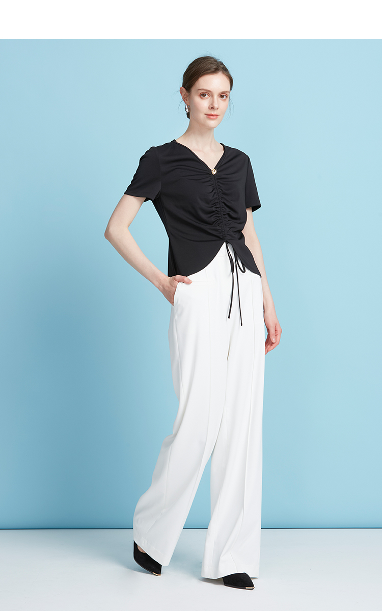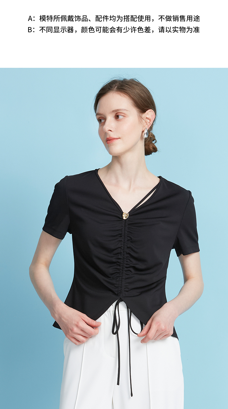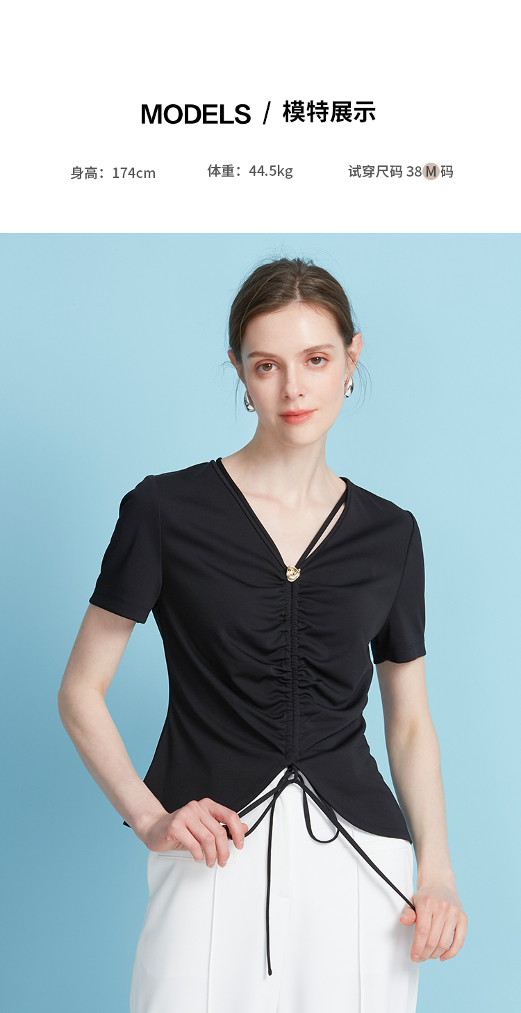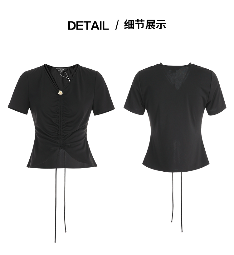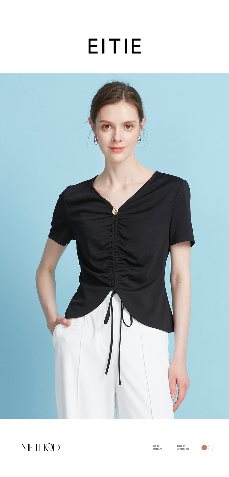 EITIE爱特爱夏季新款时尚显瘦V领抽绳褶皱露脐T恤上衣7802523