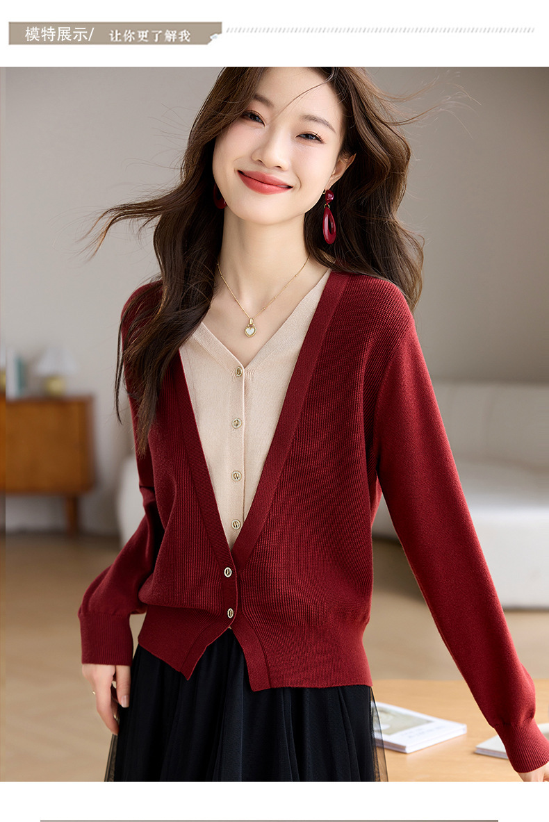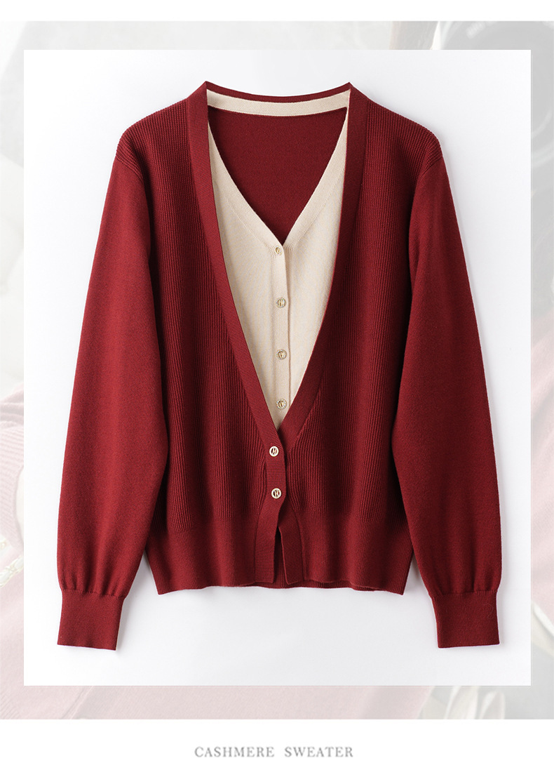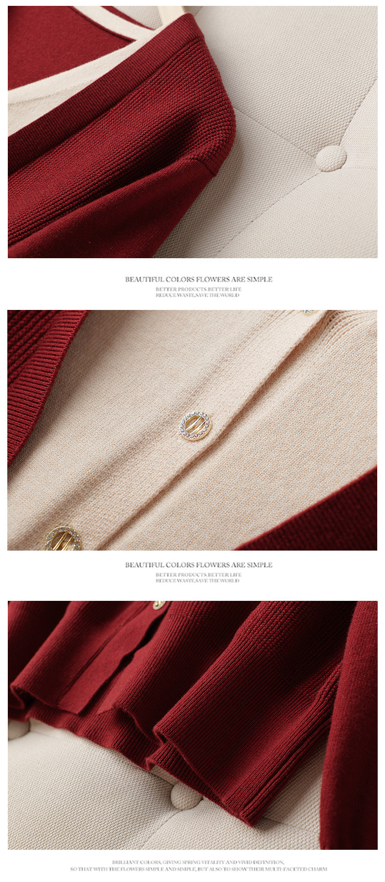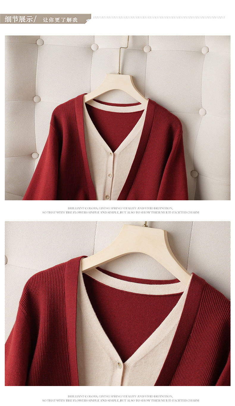 CC-J417秋冬薄款羊毛短款撞色拼接2024新款红色毛衣v领假两件针织衫外套