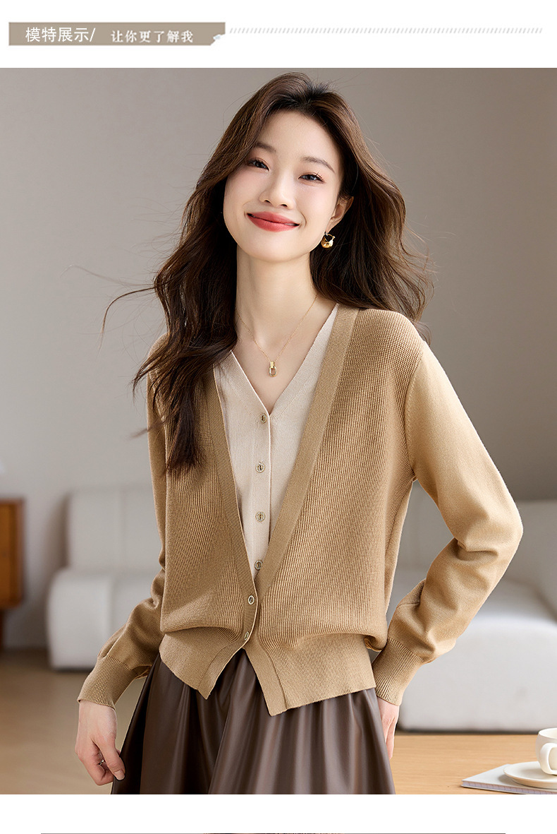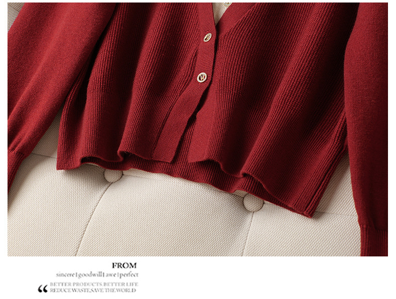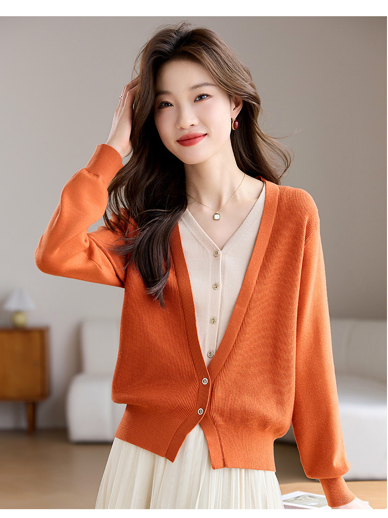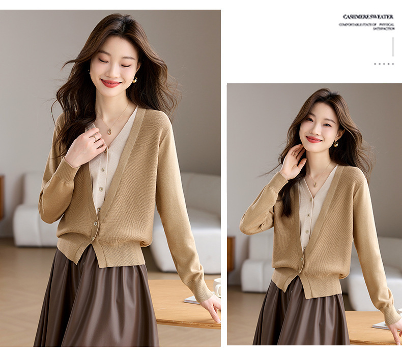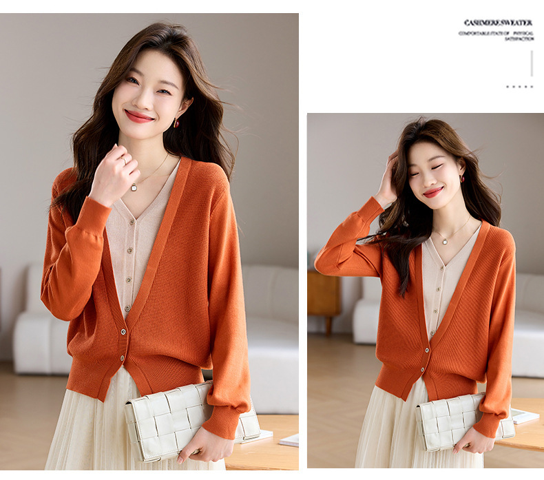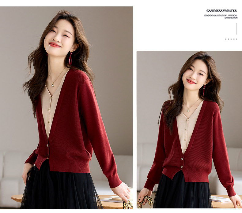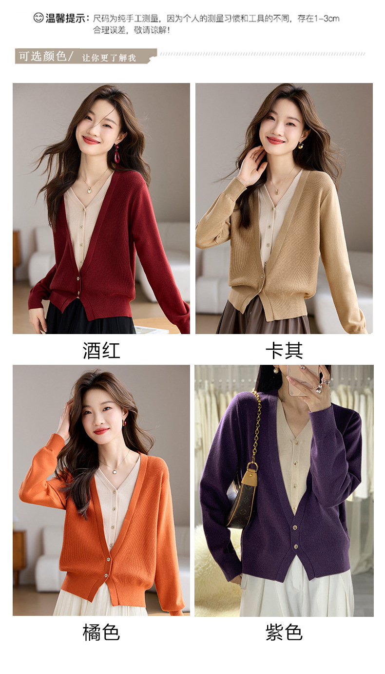 CC-J417秋冬薄款羊毛短款撞色拼接2024新款红色毛衣v领假两件针织衫外套