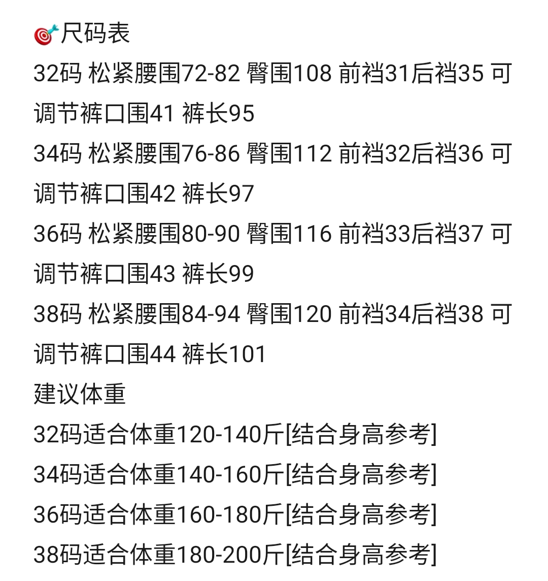34码 松紧腰围76-86 臀围112 前裆32后裆36 可调节裤口围42 裤长97