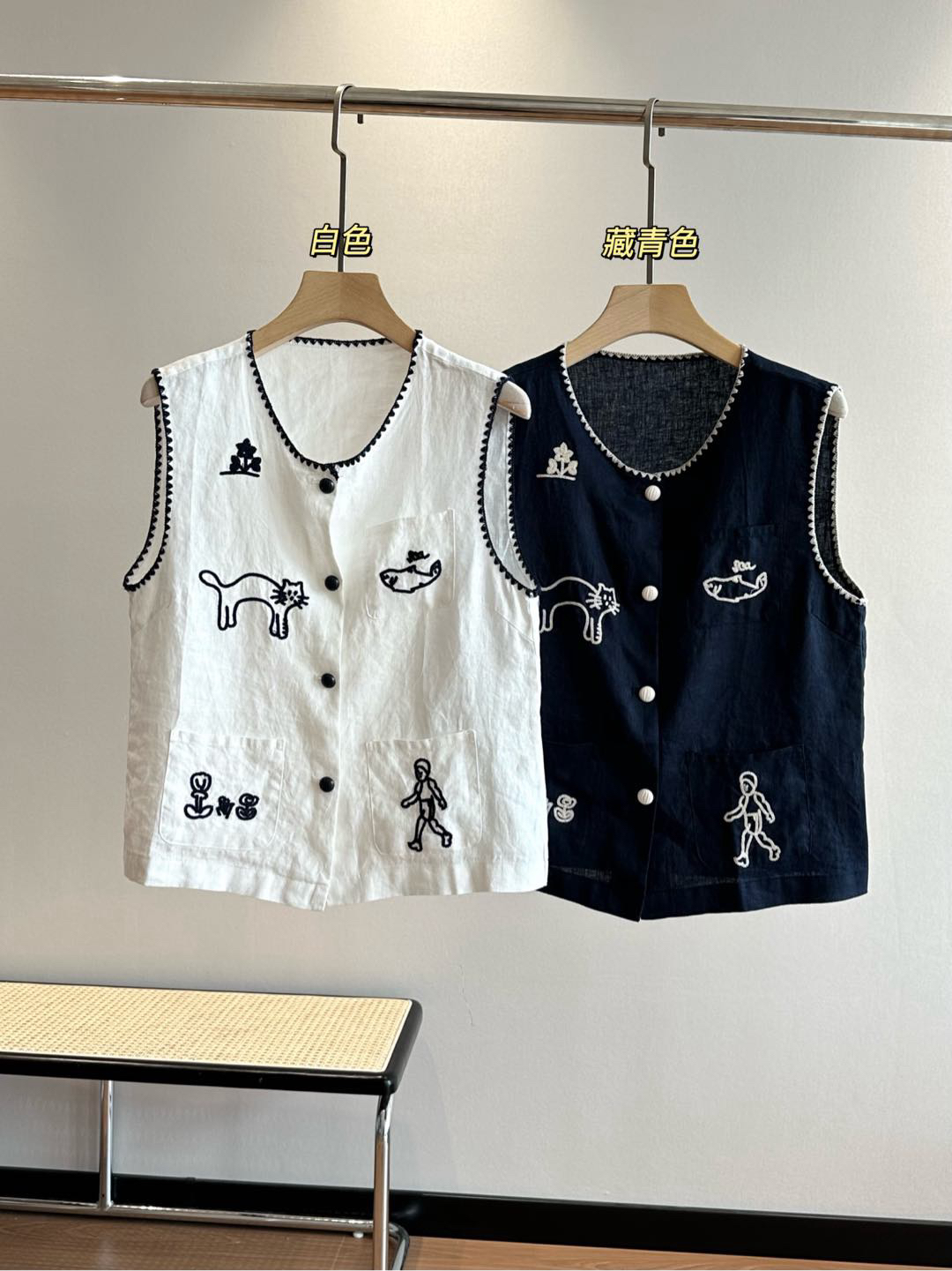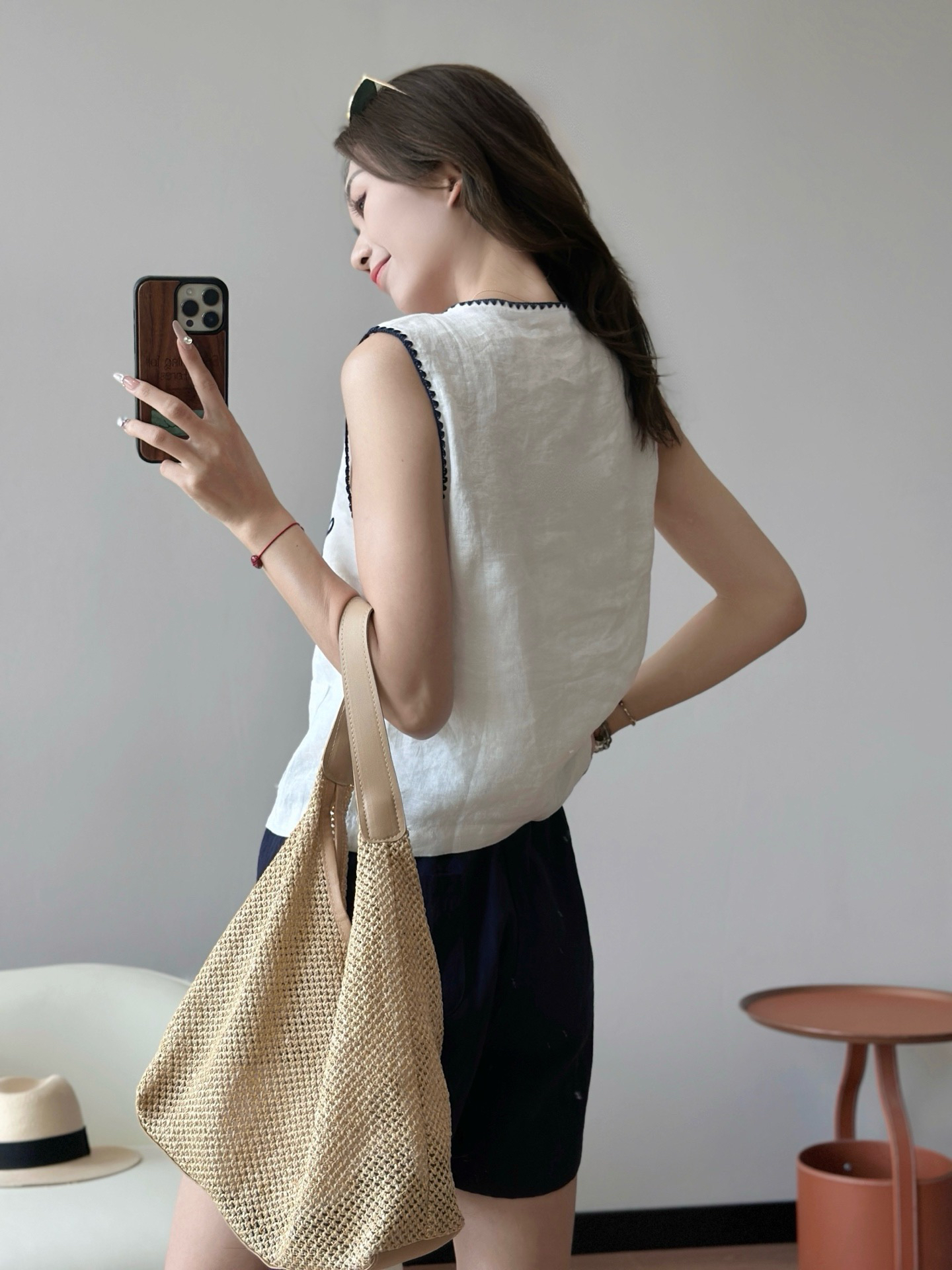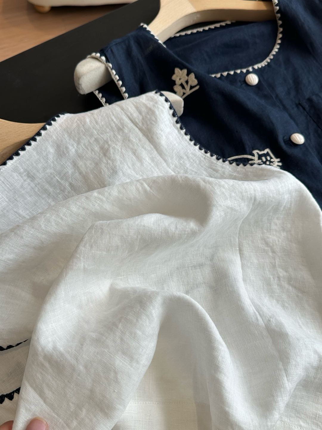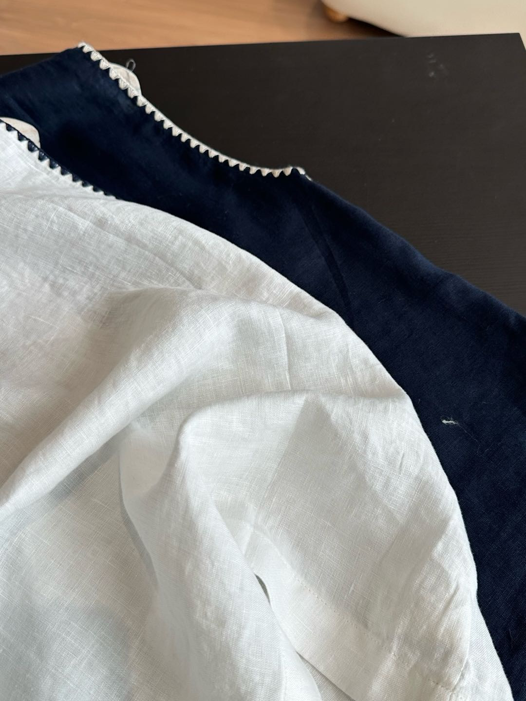 有点小香风的味道,简约大方有设计感,版型也很藏肉哦~亚麻面料 成本高 上身舒服