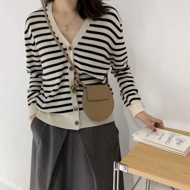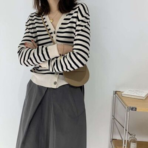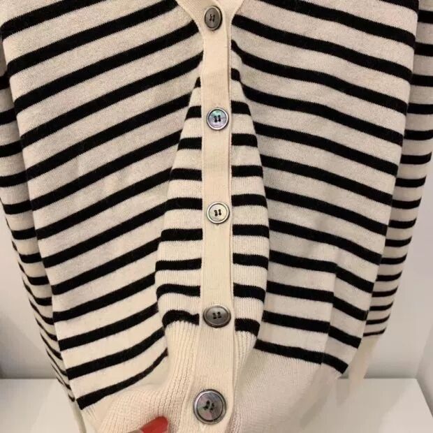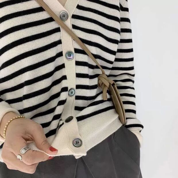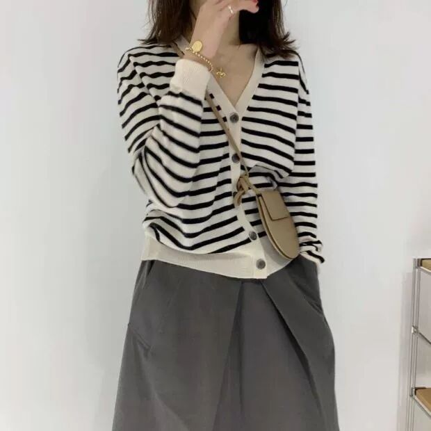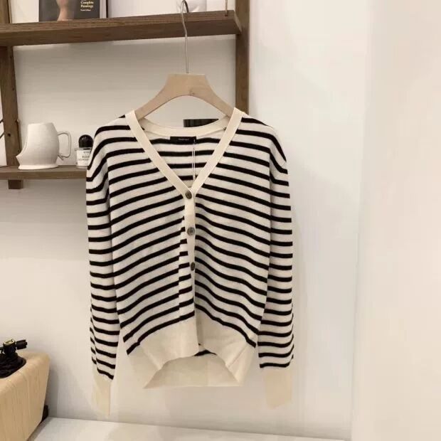 雀说 韩版复古羊毛针织开衫女春秋款宽松外穿V领薄款条纹毛衣外套上衣4ZF-41504