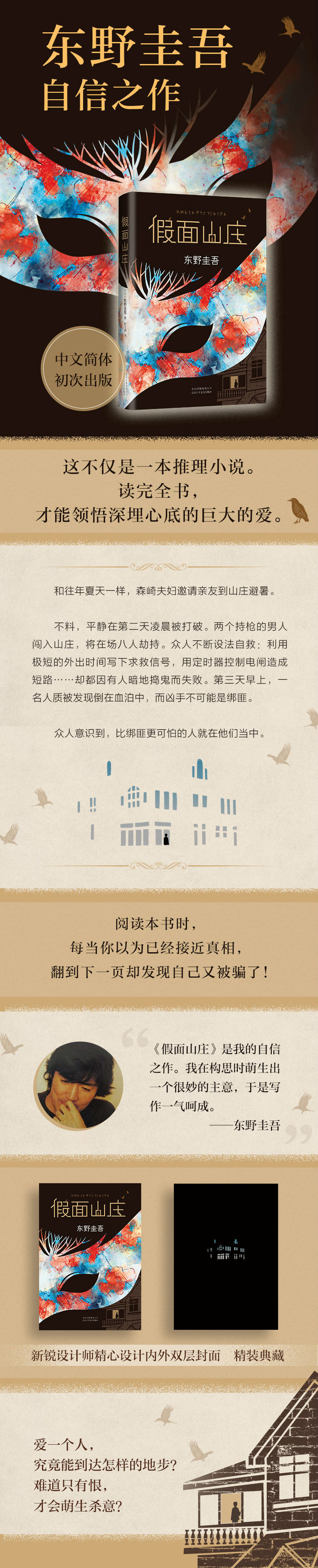 ★《假面山庄》是我的自信之作。我在构思时萌生出一个很妙的主意,于是写作一气呵成。——东野圭吾