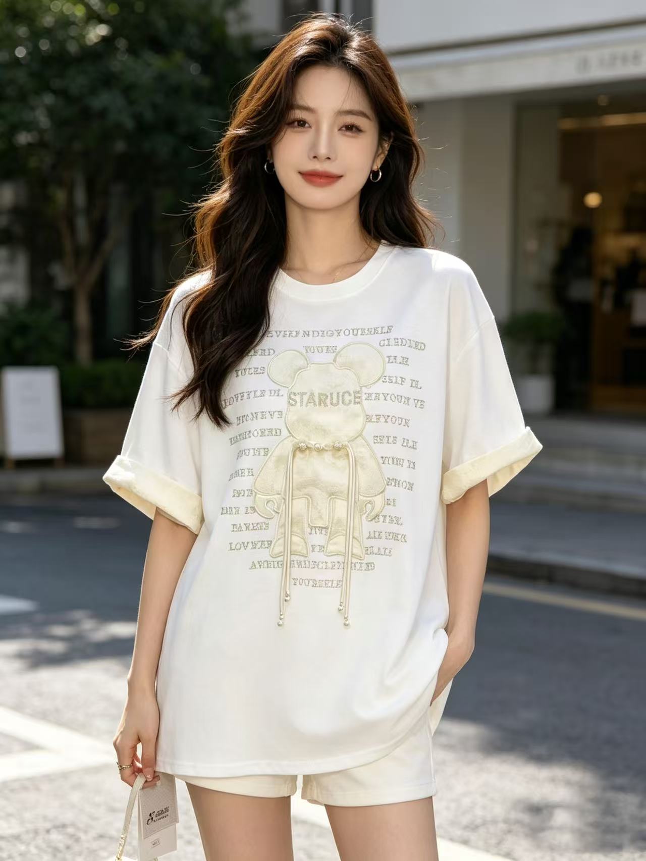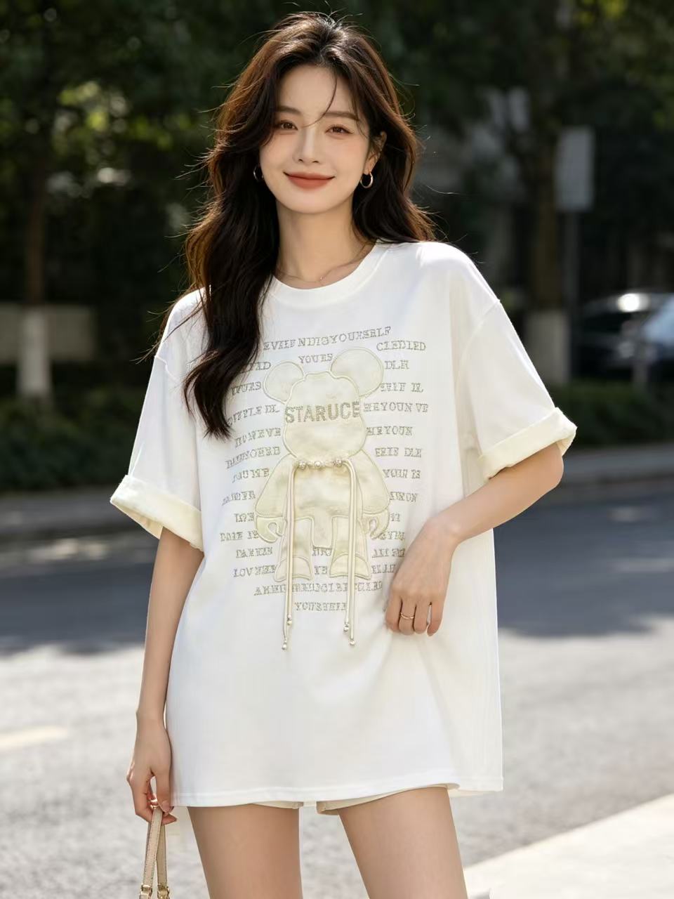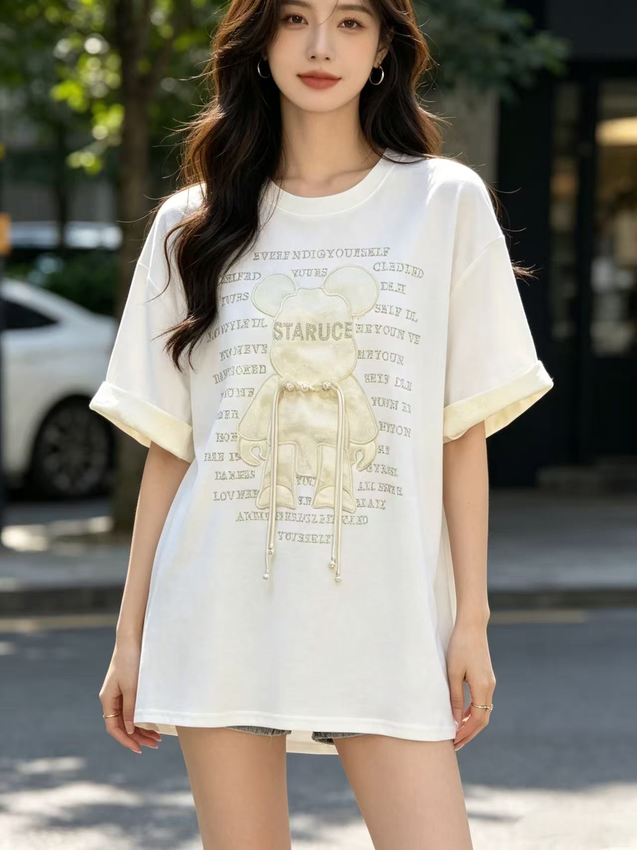 大版【自营】工艺/重工!彩钻➕提花盘扣小熊!潮牌复古宽松设计感中长短袖T恤-喜出
