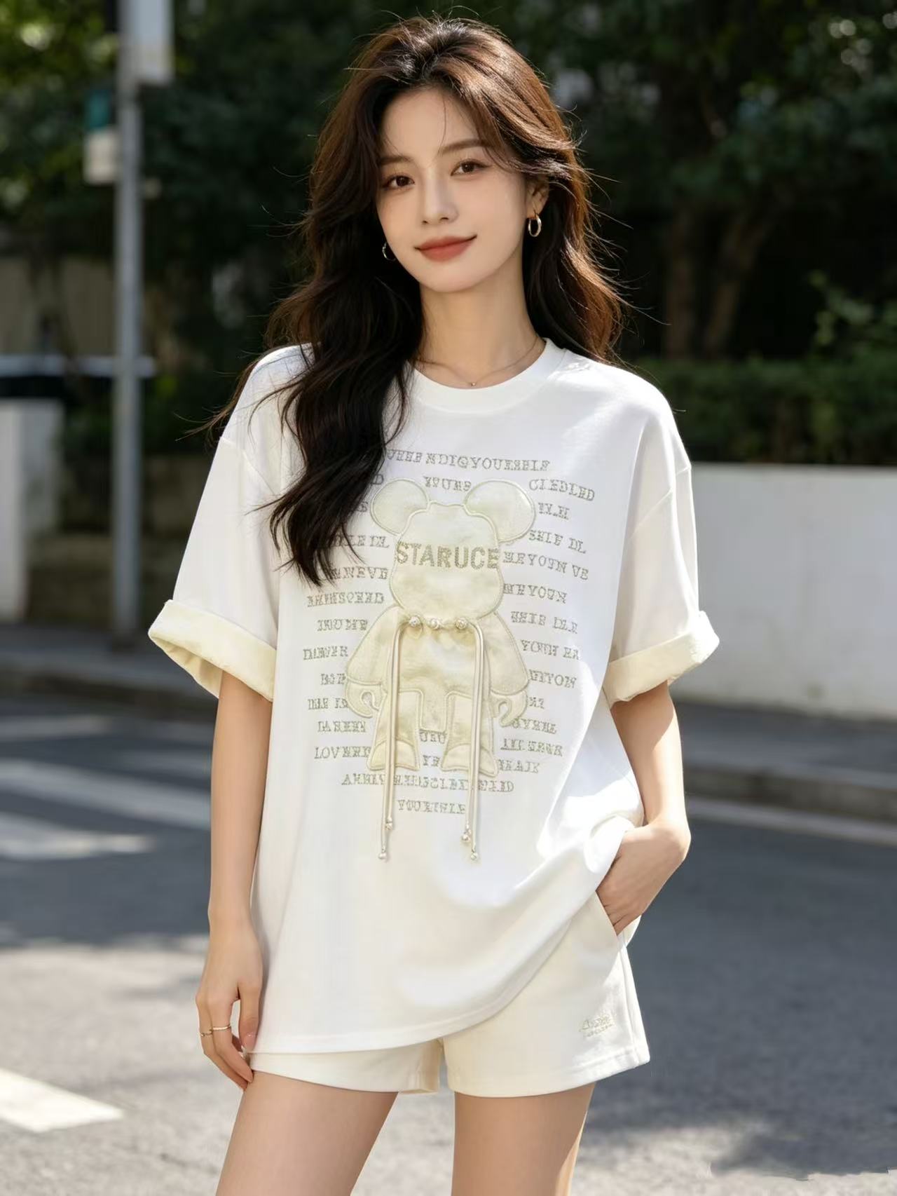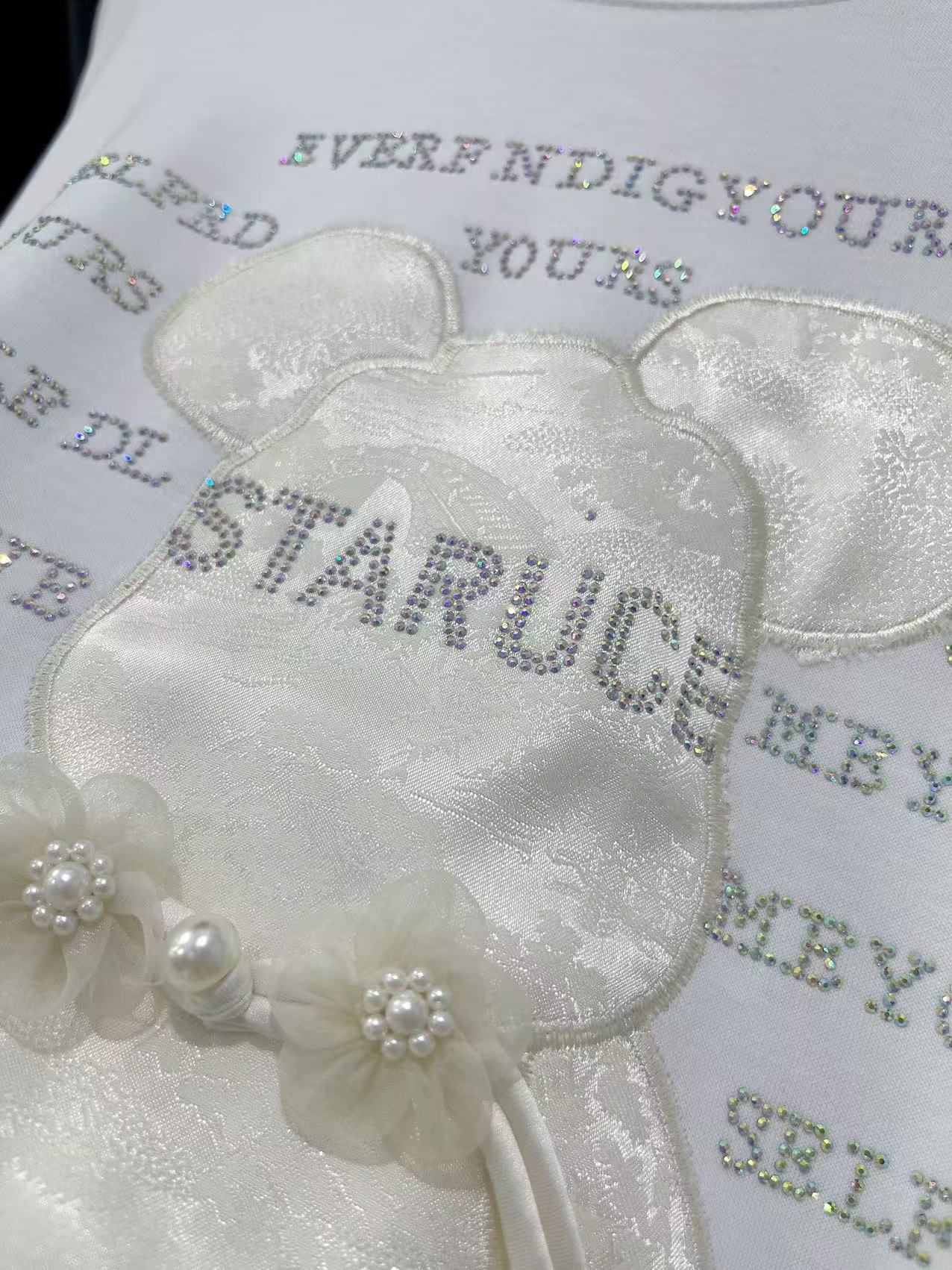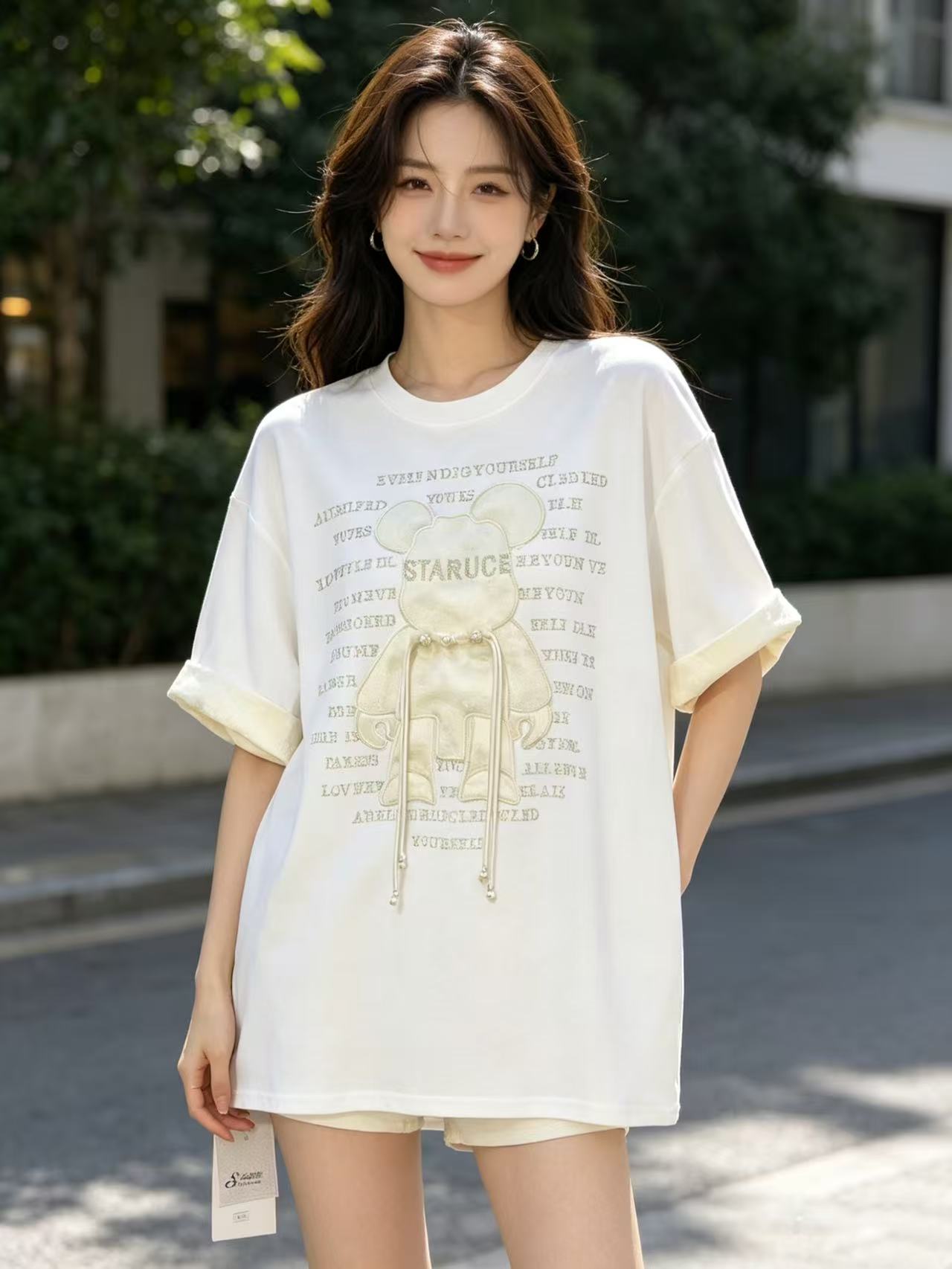 大版【自营】工艺/重工!彩钻➕提花盘扣小熊!潮牌复古宽松设计感中长短袖T恤-喜出