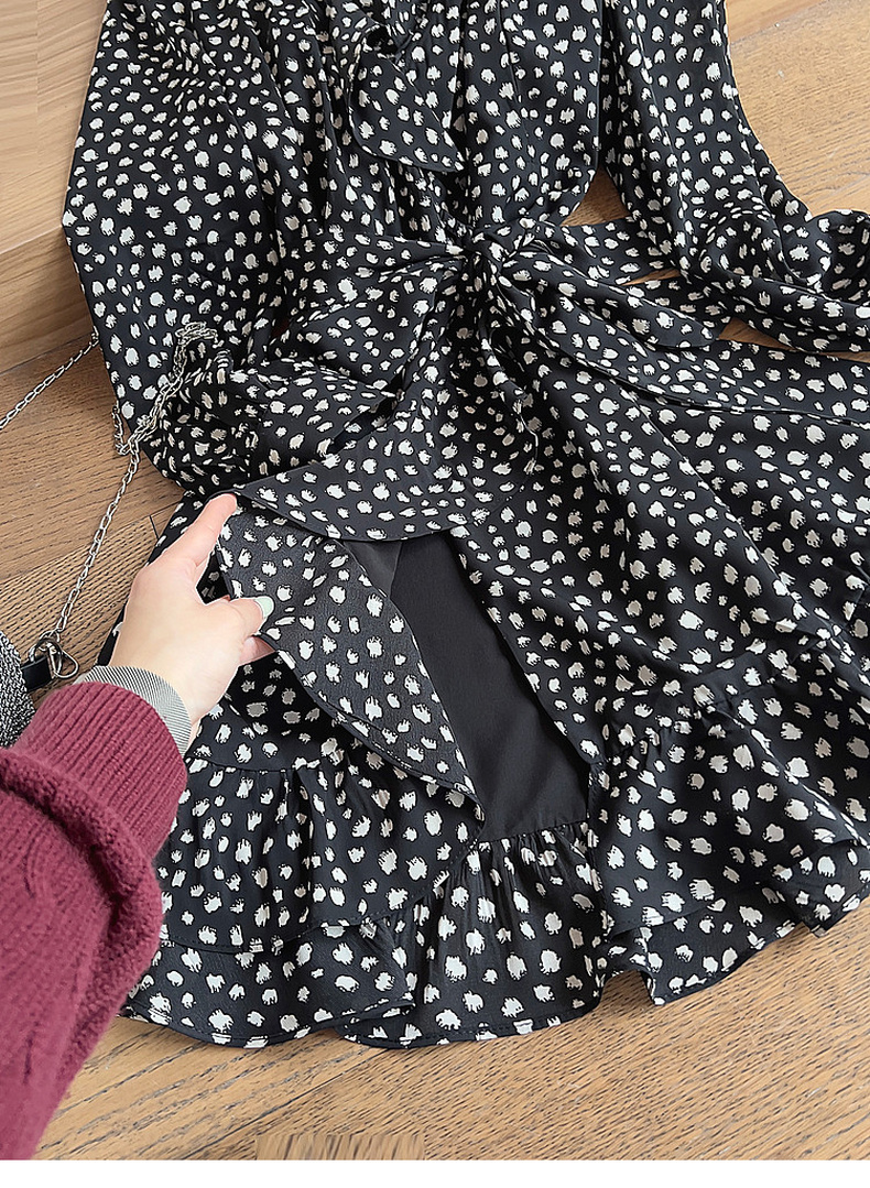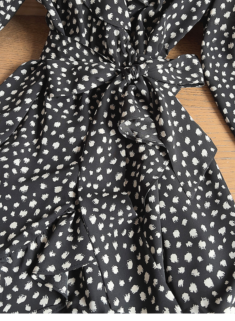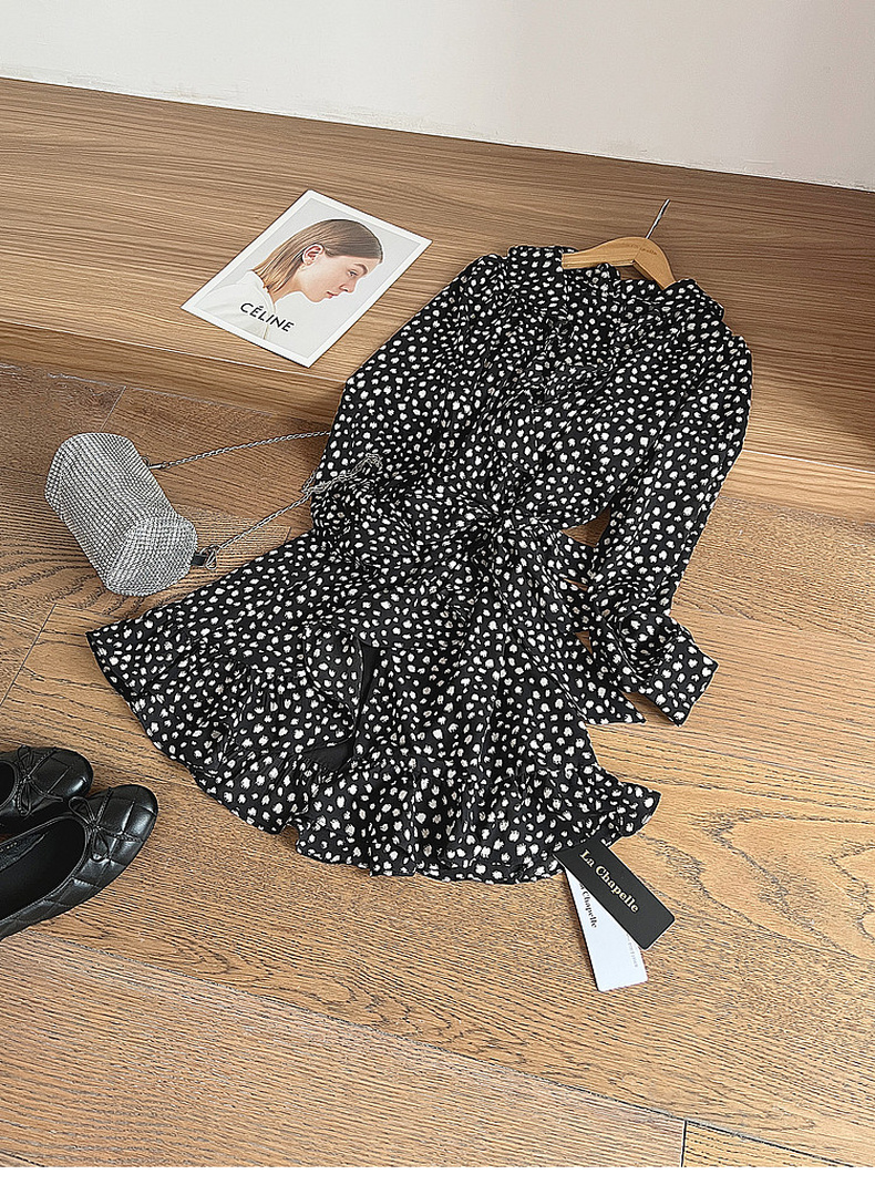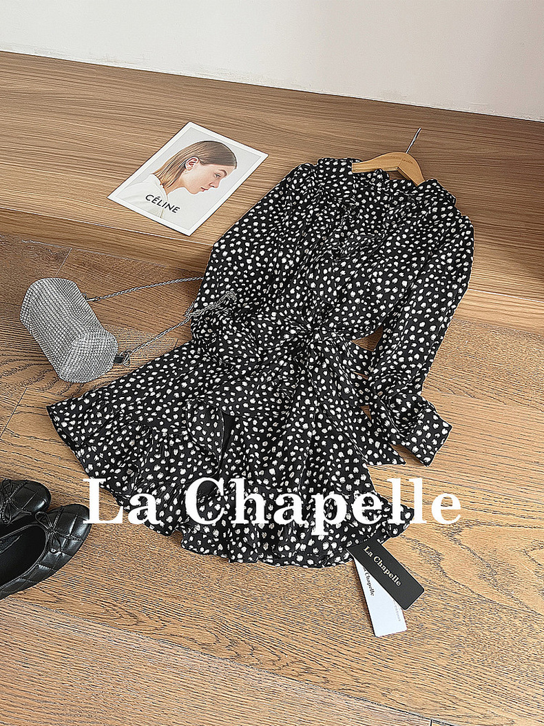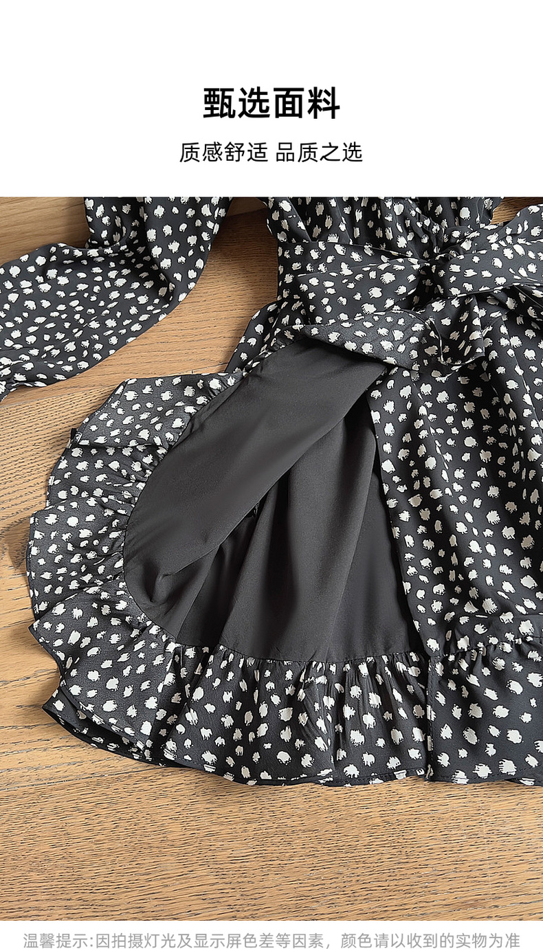 专柜实拍【法式波点茶歇】拉夏贝尔/La Chapelle复古性感V领木耳边气质显瘦系带波点长袖荷叶边短裙