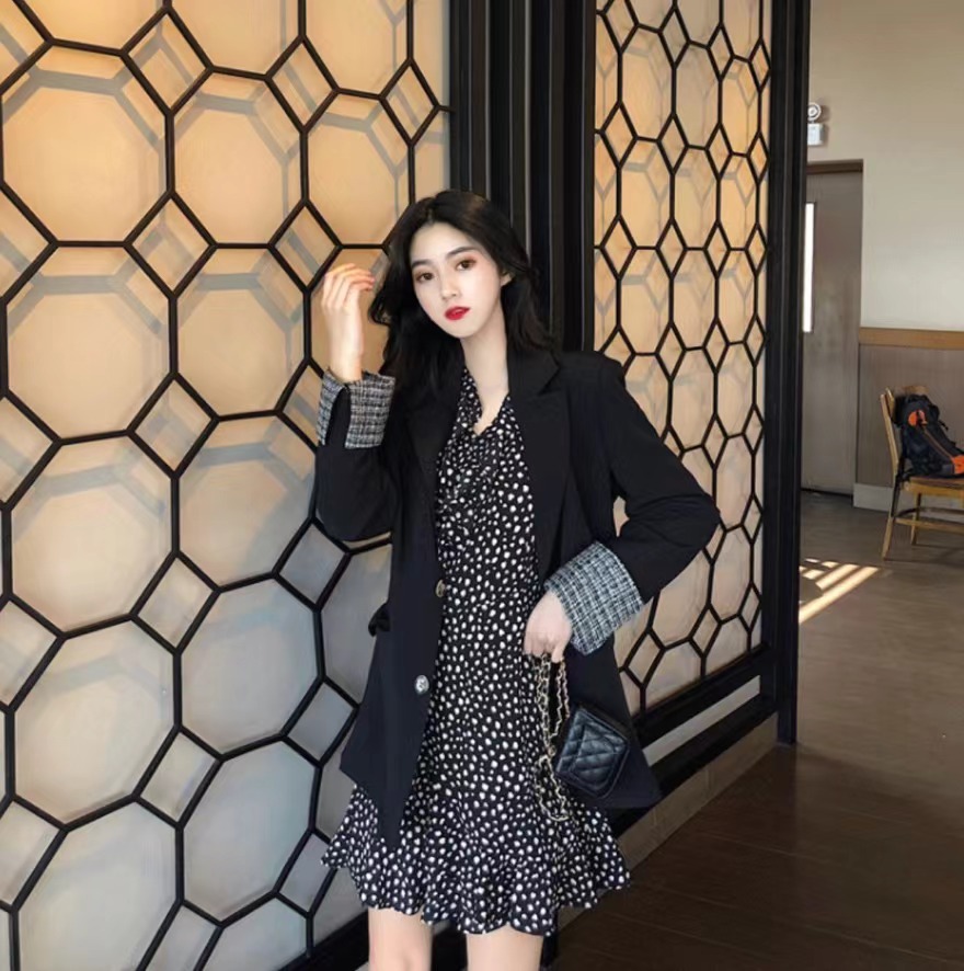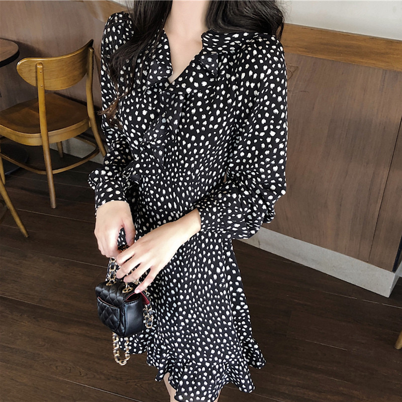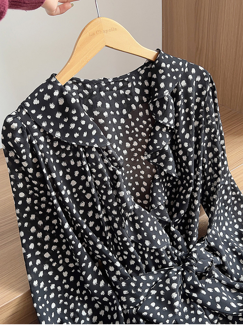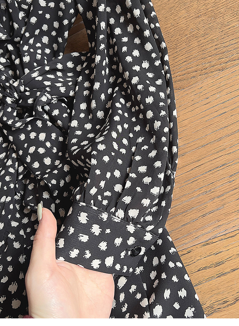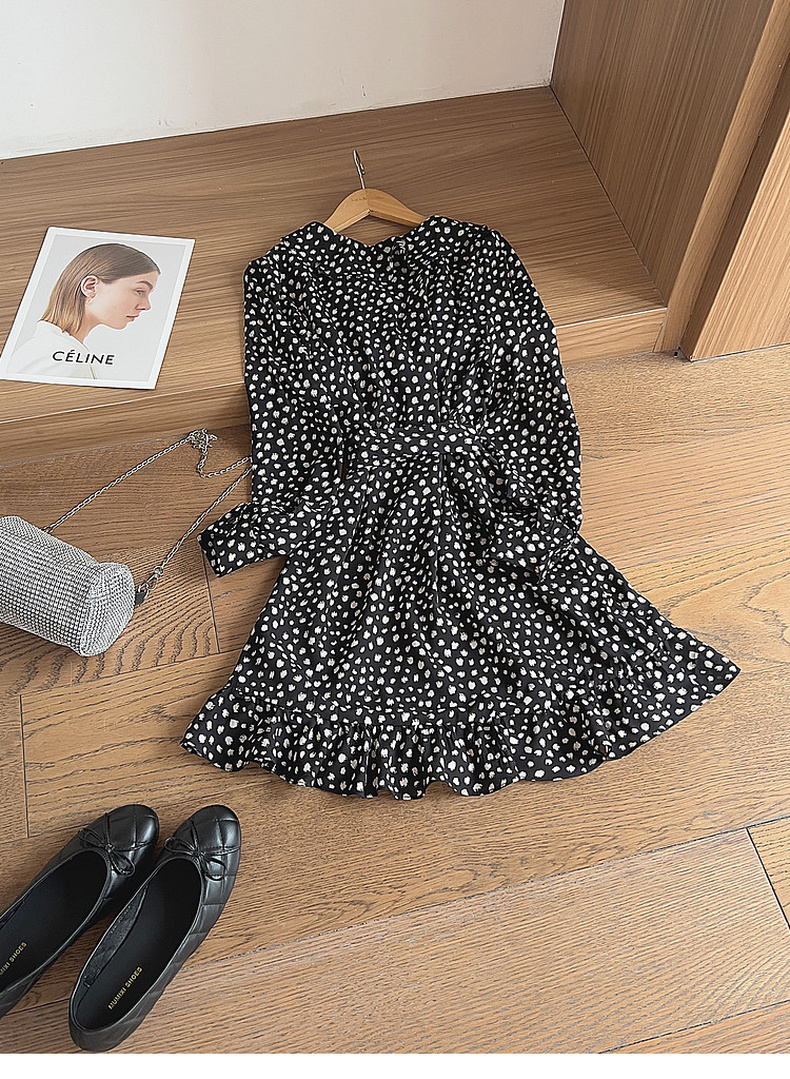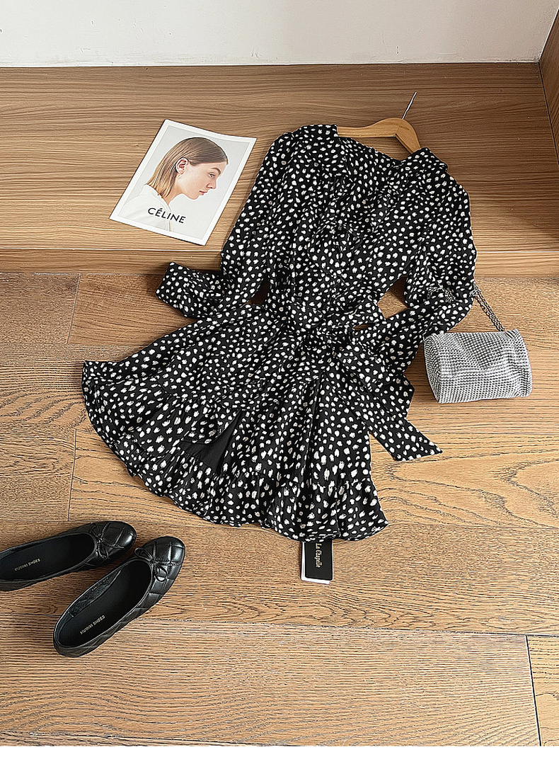 专柜实拍【法式波点茶歇】拉夏贝尔/La Chapelle复古性感V领木耳边气质显瘦系带波点长袖荷叶边短裙