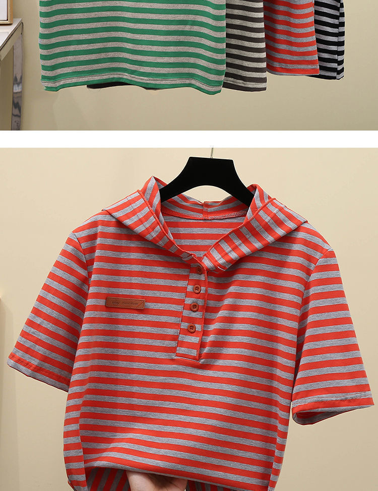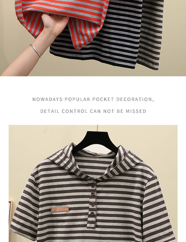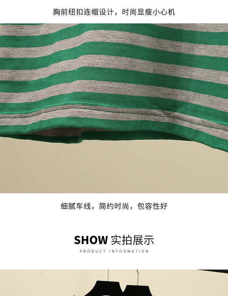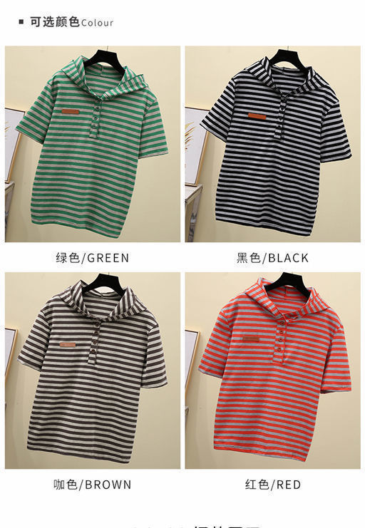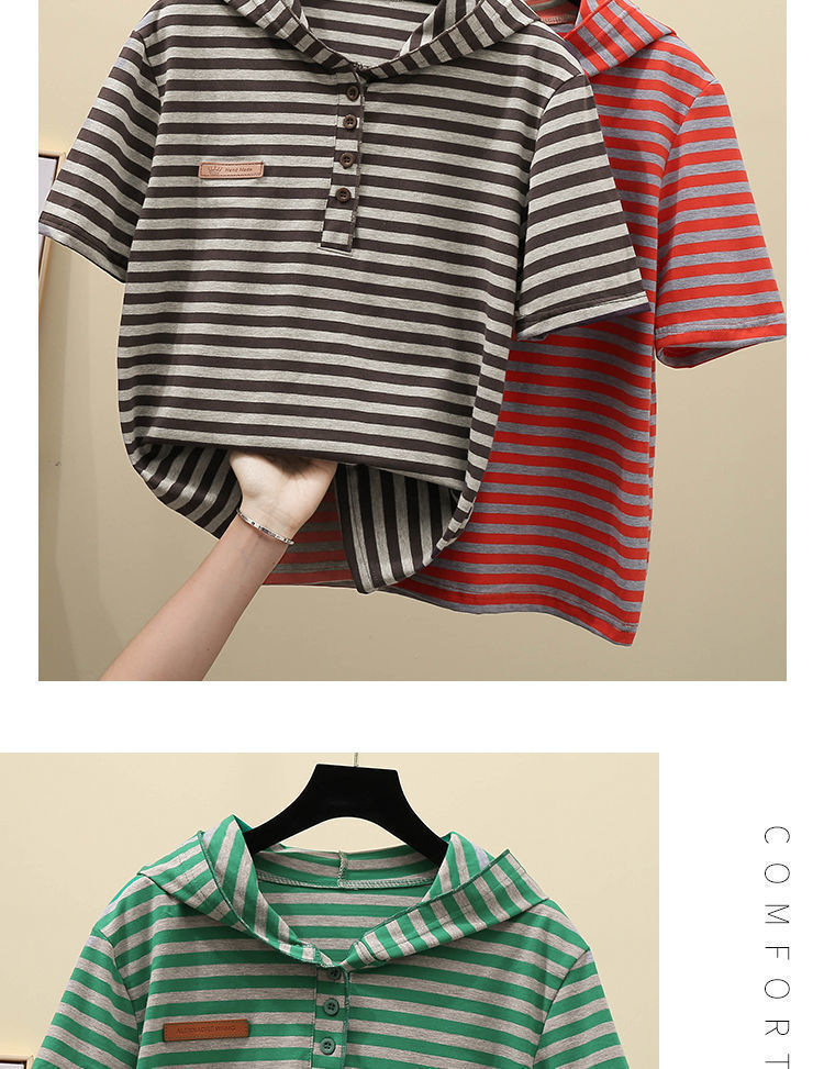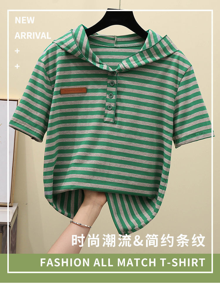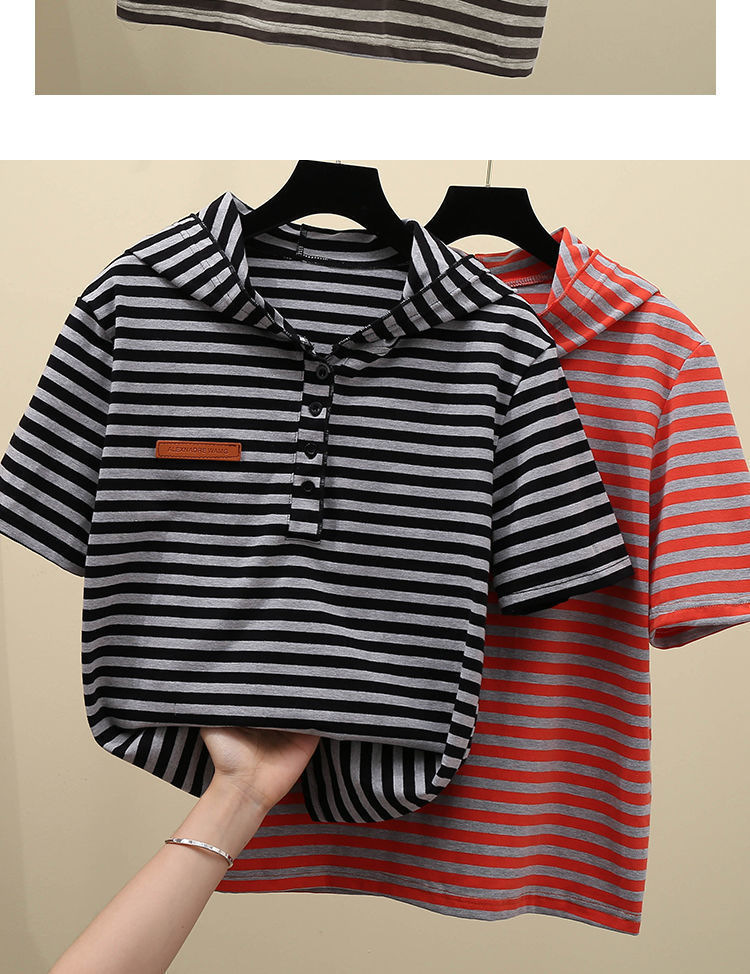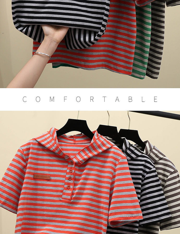 XSF2253新款时尚气质休闲连帽短袖条纹T恤衫