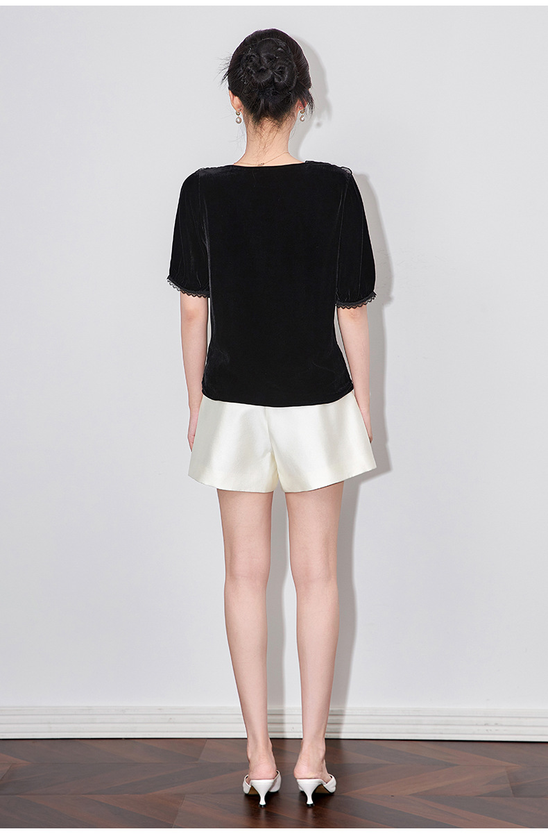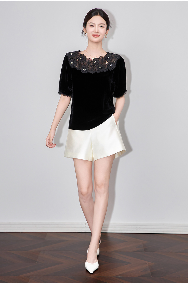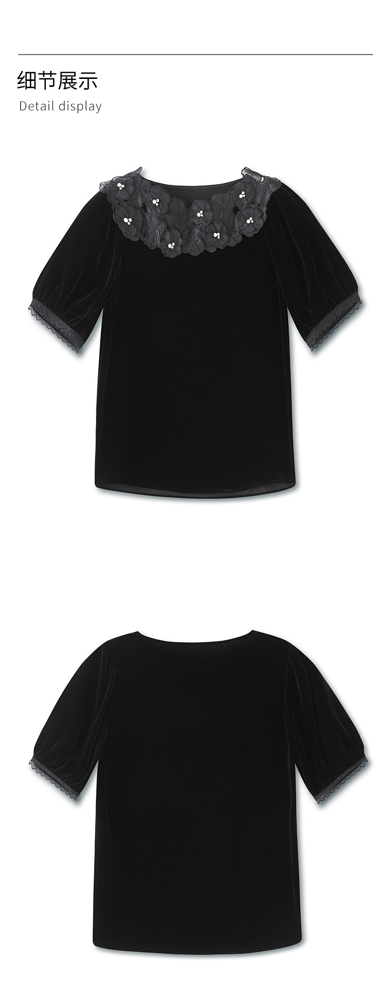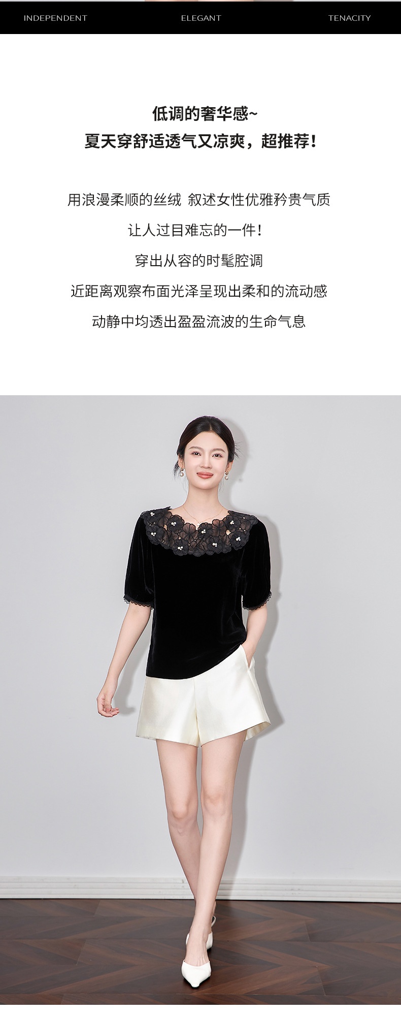 「高货wl」全新升级【铂金会员293/天猫389/差价96】(00030)洛诗琳法式花朵钉珠上衣2025夏季优雅真丝丝绒短袖上衣