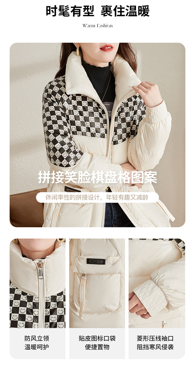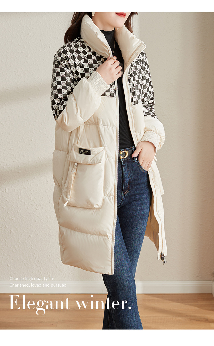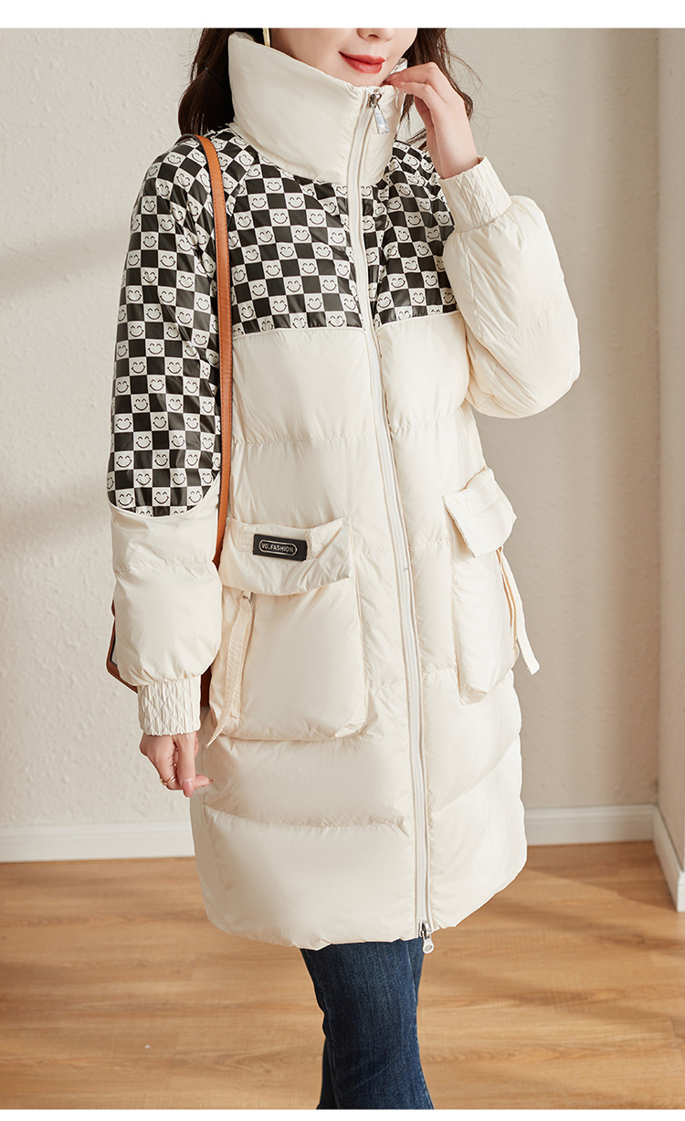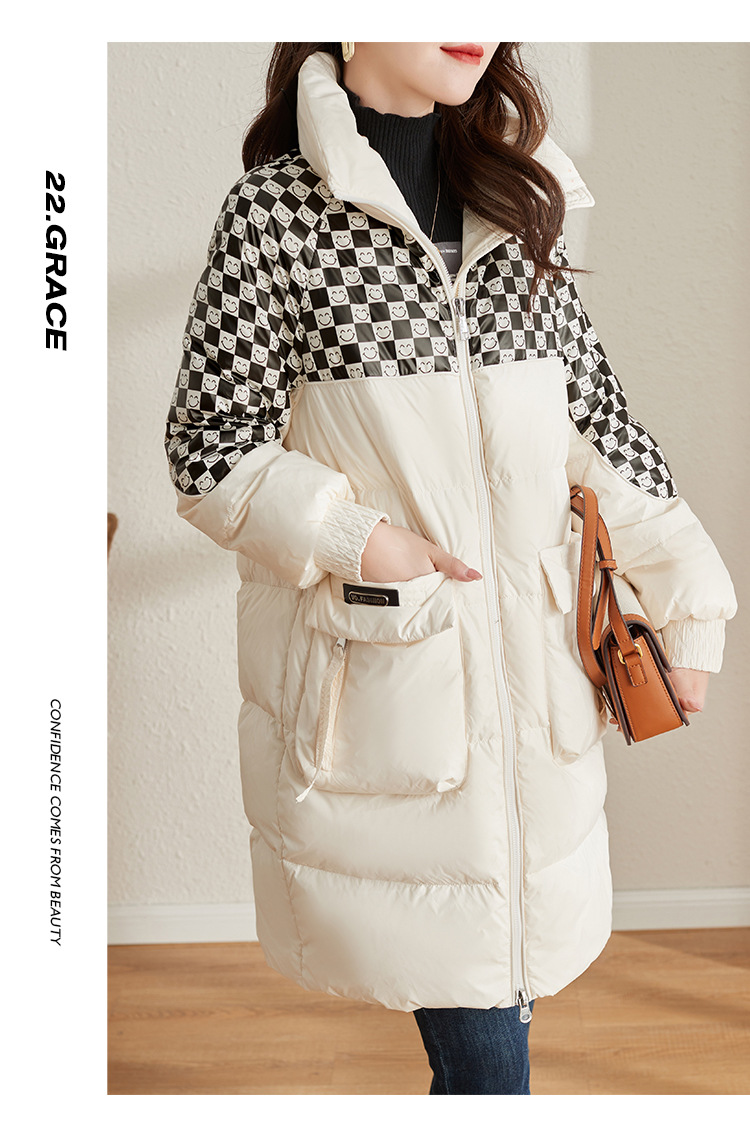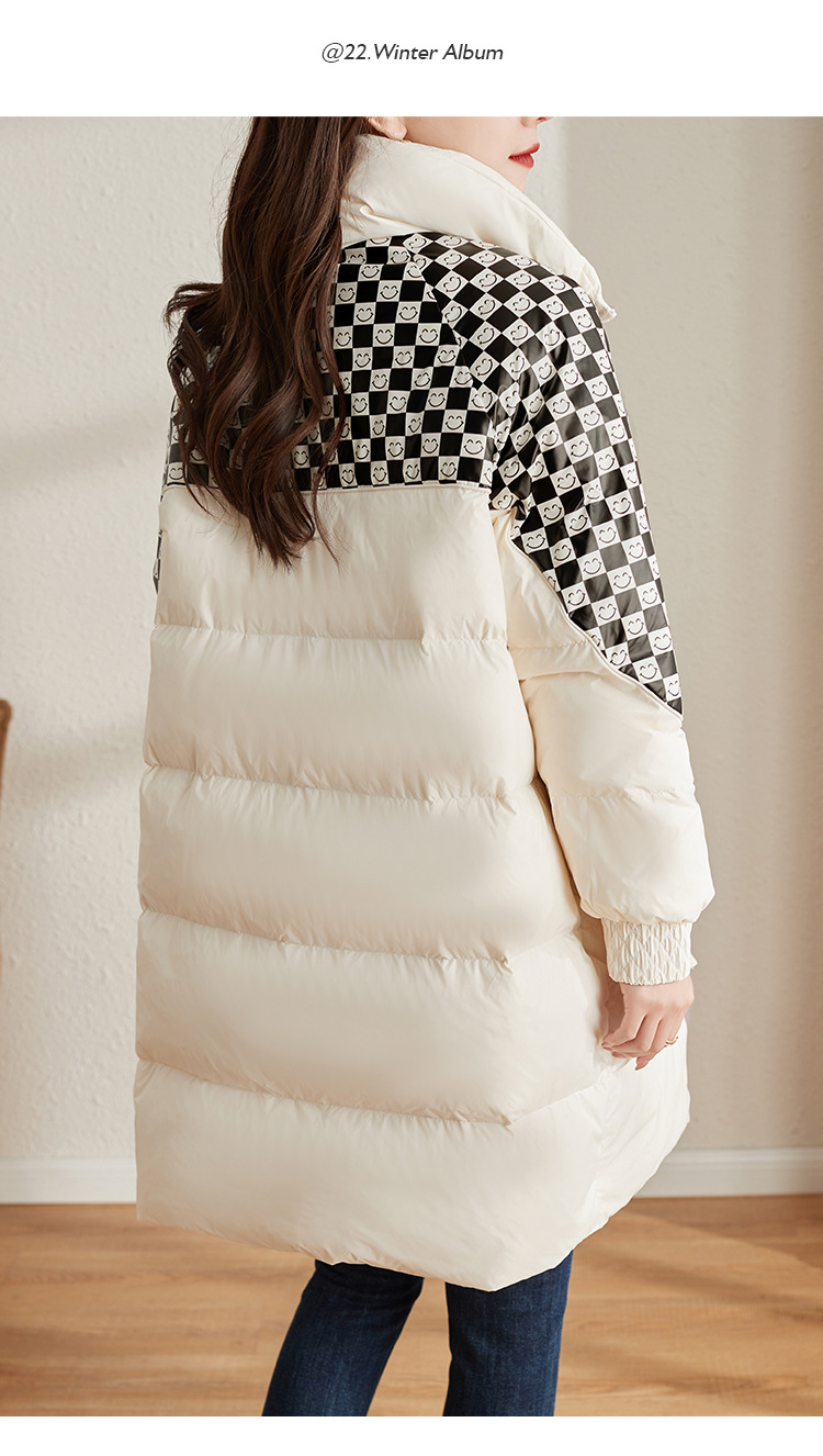 白鸭绒羽绒服冬季中长笑脸棋盘过膝格保暖立领厚外套ZS-7006