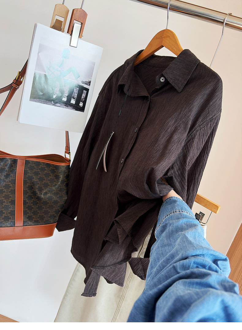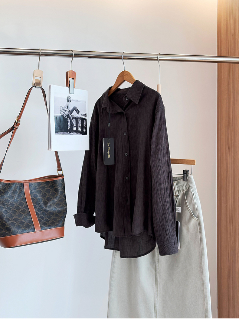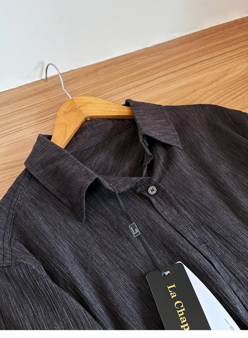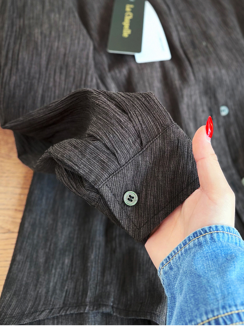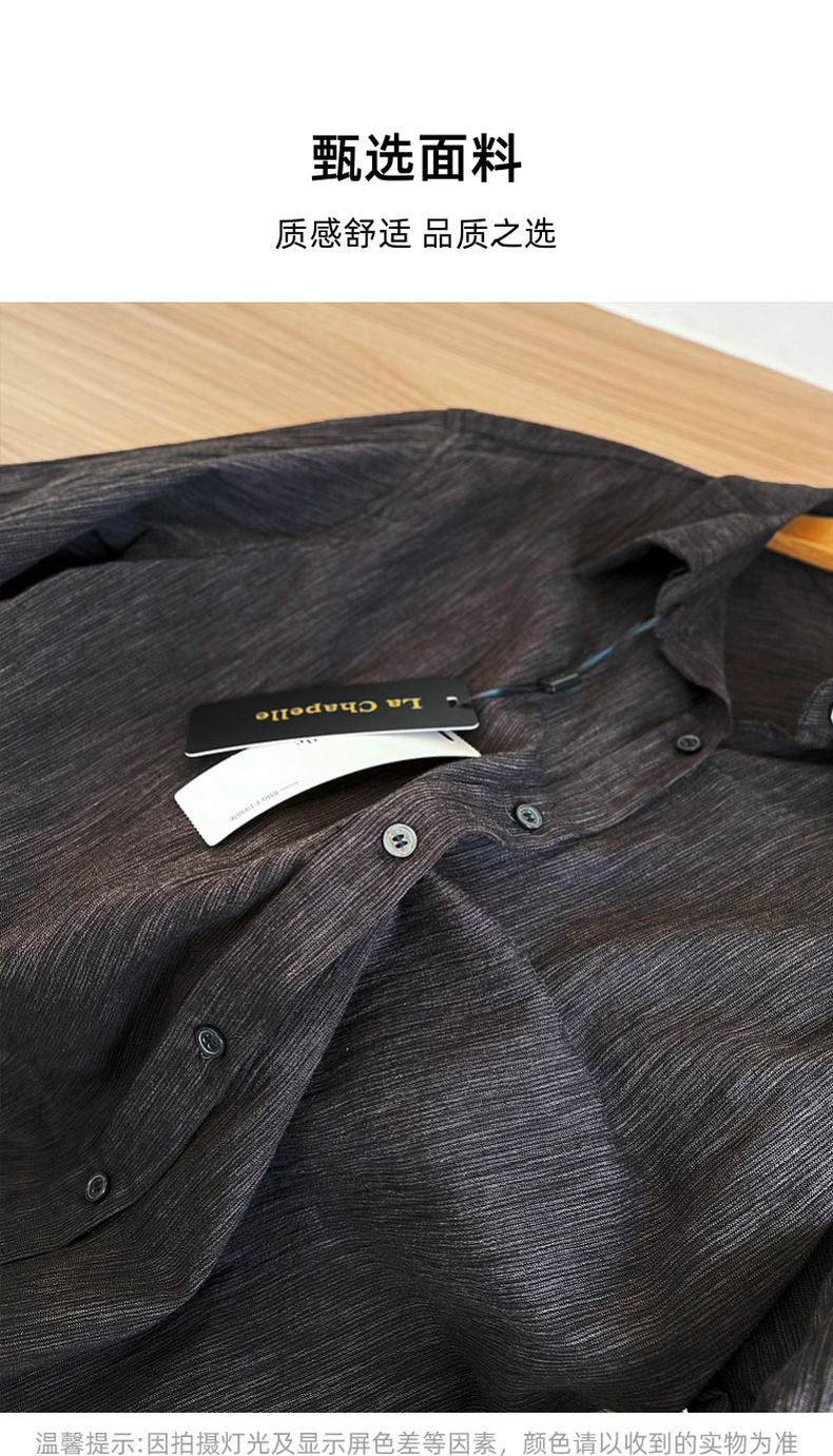 专柜实拍【亚麻+棉/透气舒适】拉夏贝尔/La Chapelle轻奢质感复古翻领排扣别致压皱气质老钱风长袖衬衣