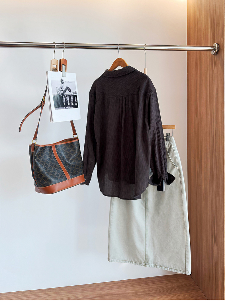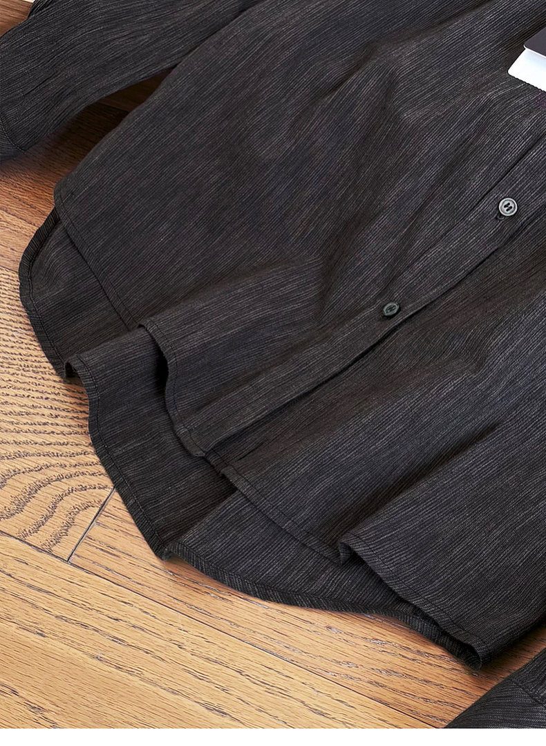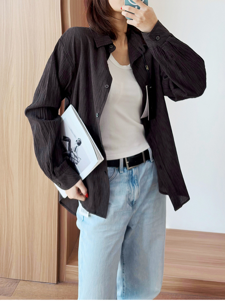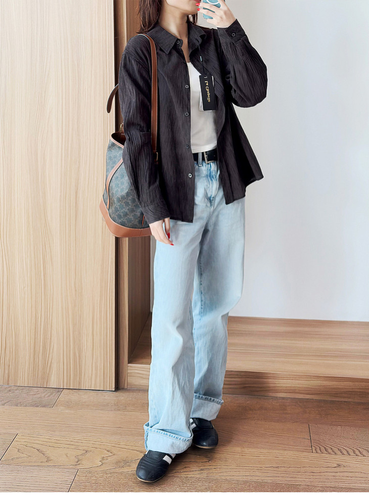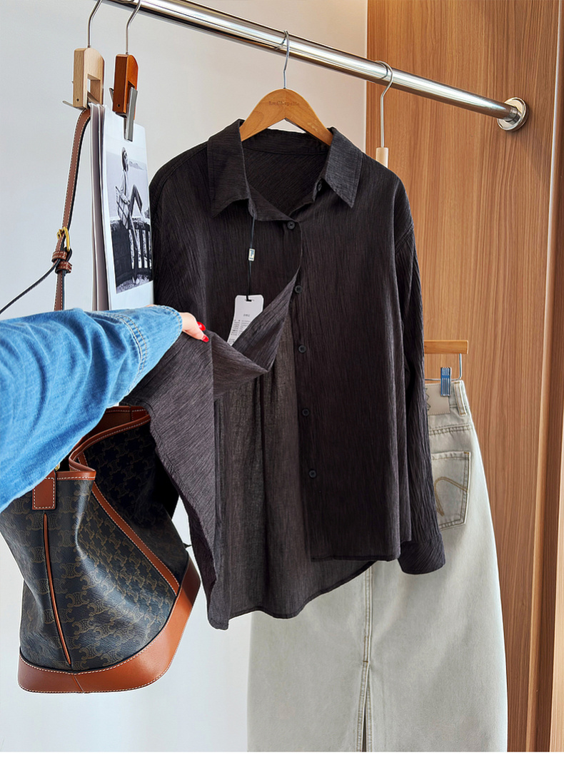 专柜实拍【亚麻+棉/透气舒适】拉夏贝尔/La Chapelle轻奢质感复古翻领排扣别致压皱气质老钱风长袖衬衣
