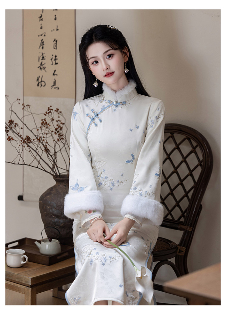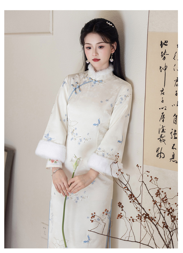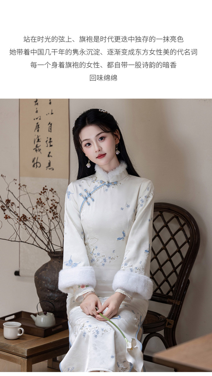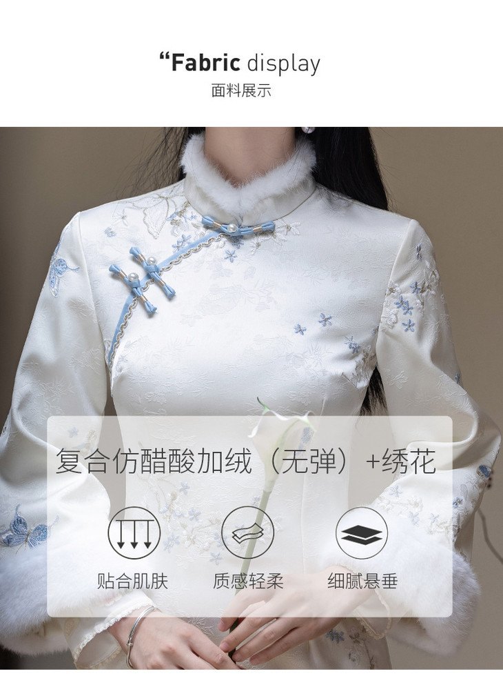 白色旗袍加绒加厚冬装刺绣改良新中式LSB4129 商品图1