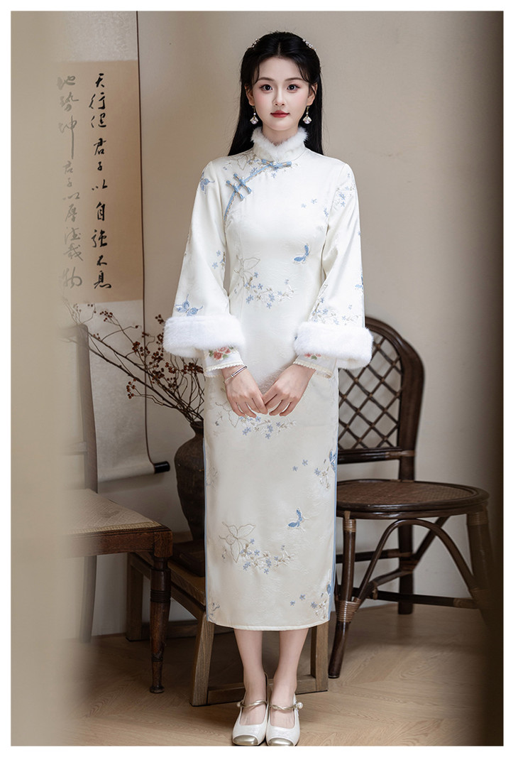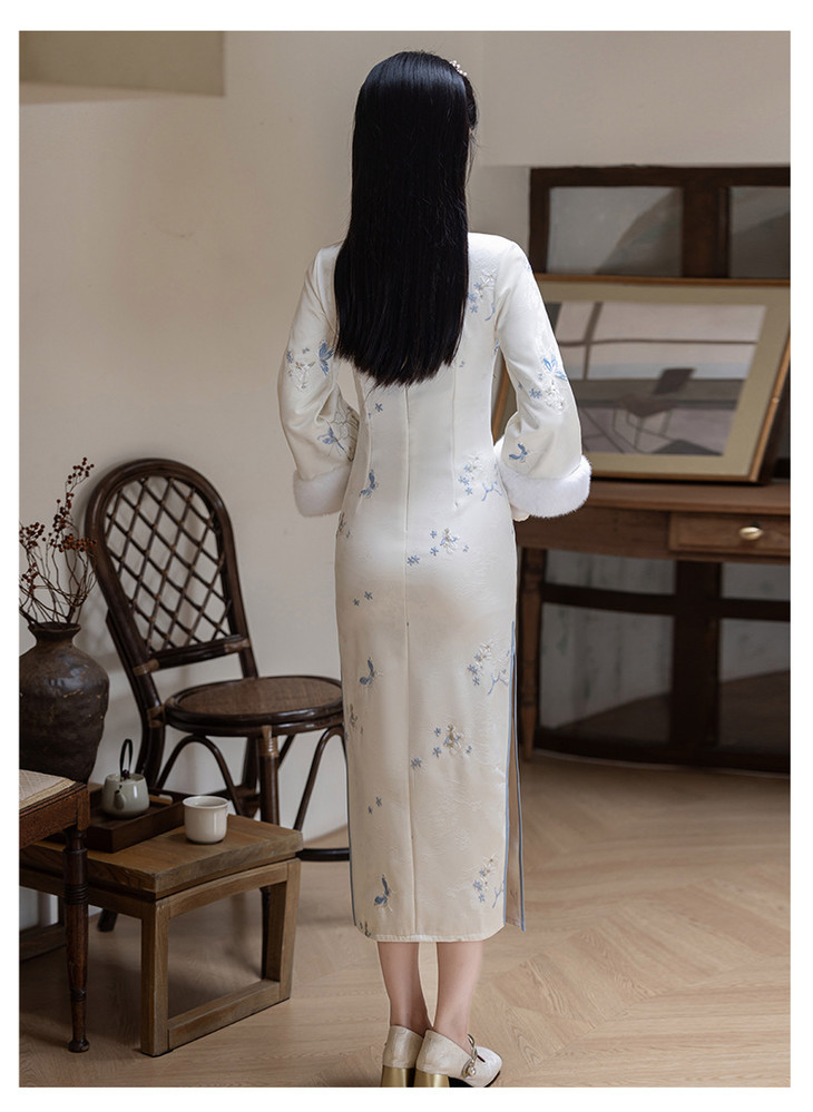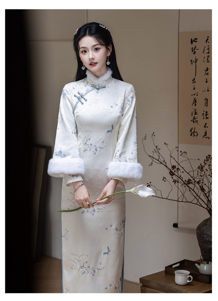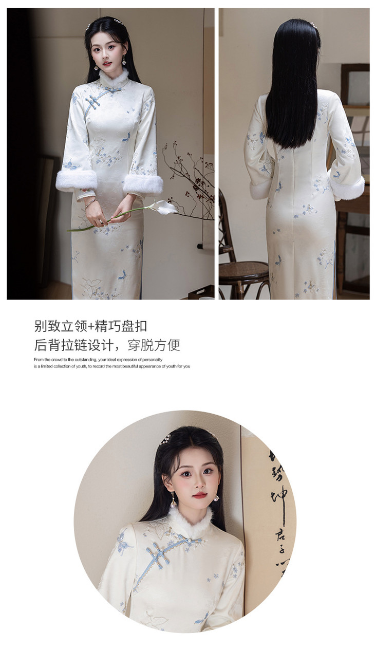 白色旗袍加绒加厚冬装刺绣改良新中式LSB4129 商品图1
