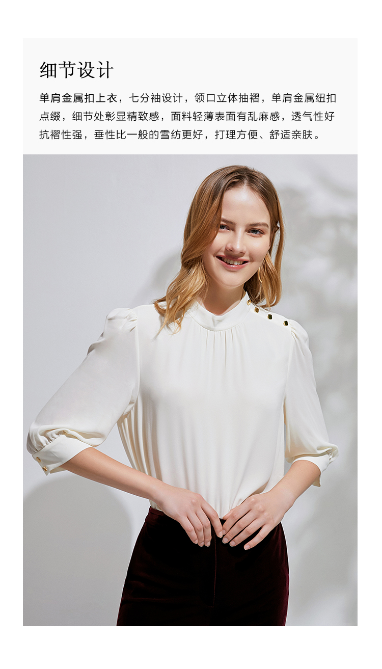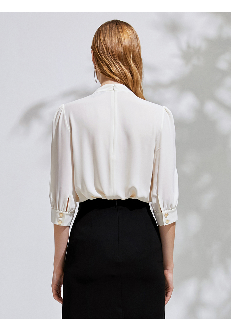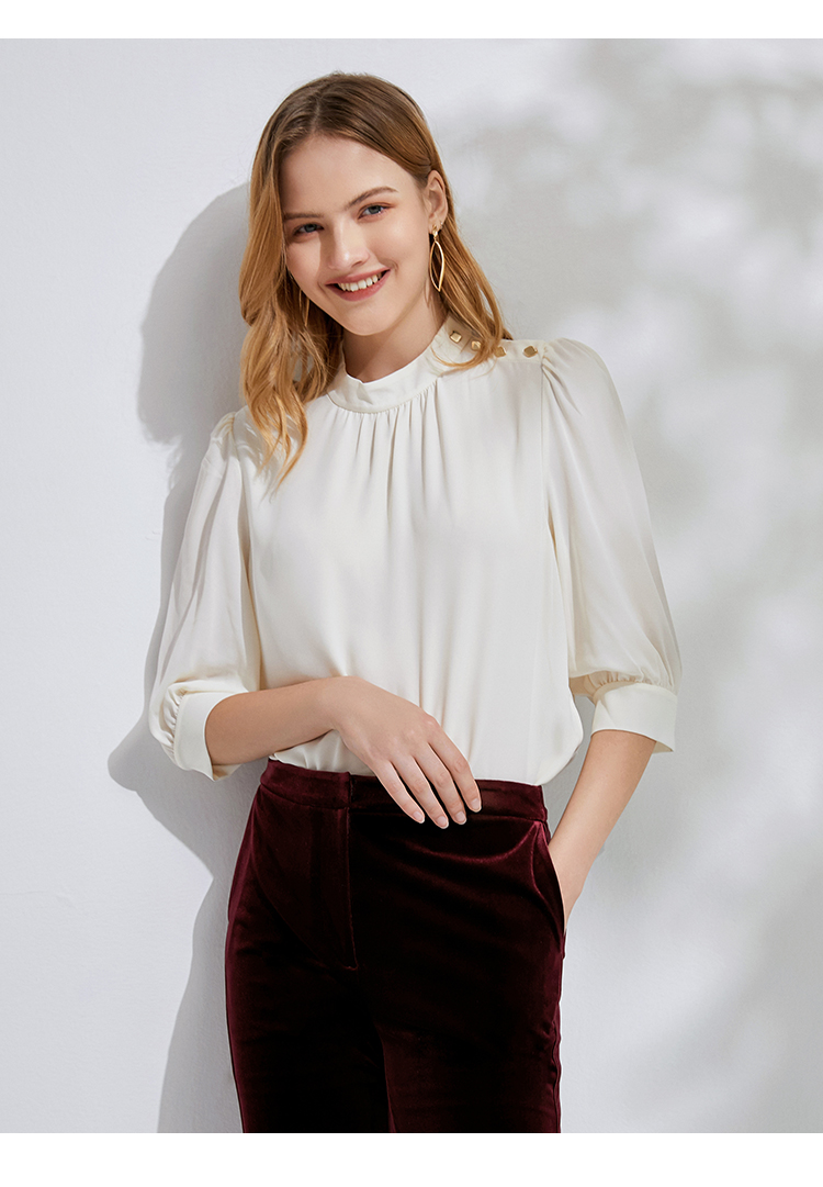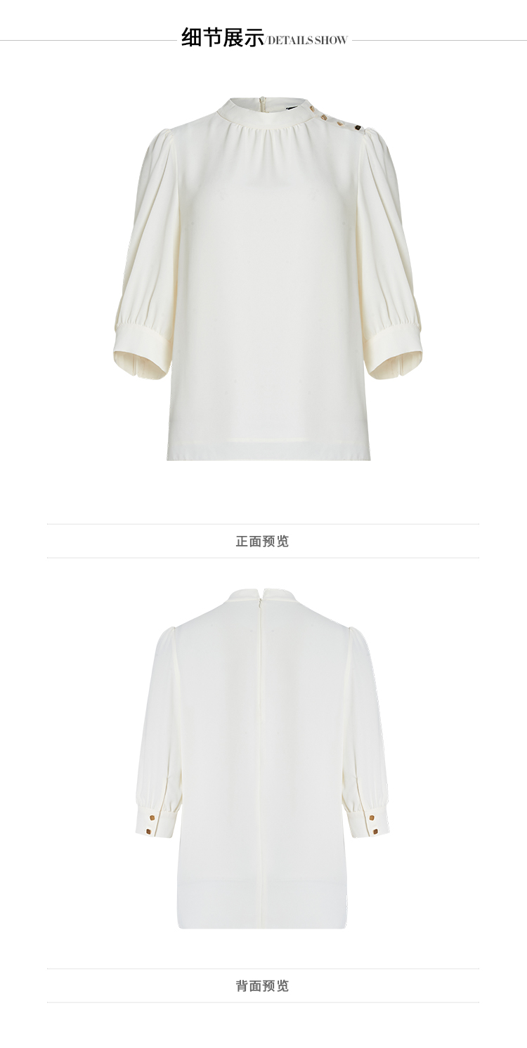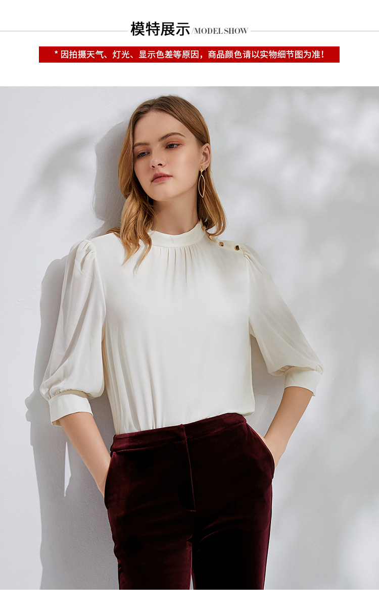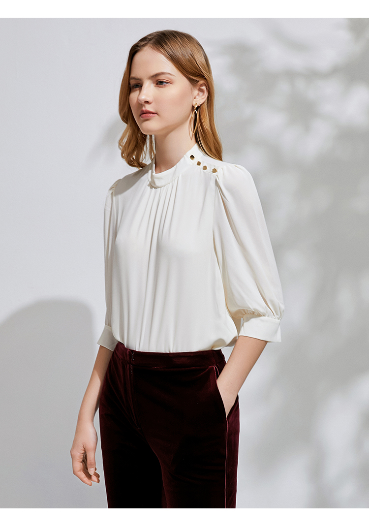 EITIE爱特爱春季新款通勤气质半高领灯笼五分袖雪纺女上衣6313008