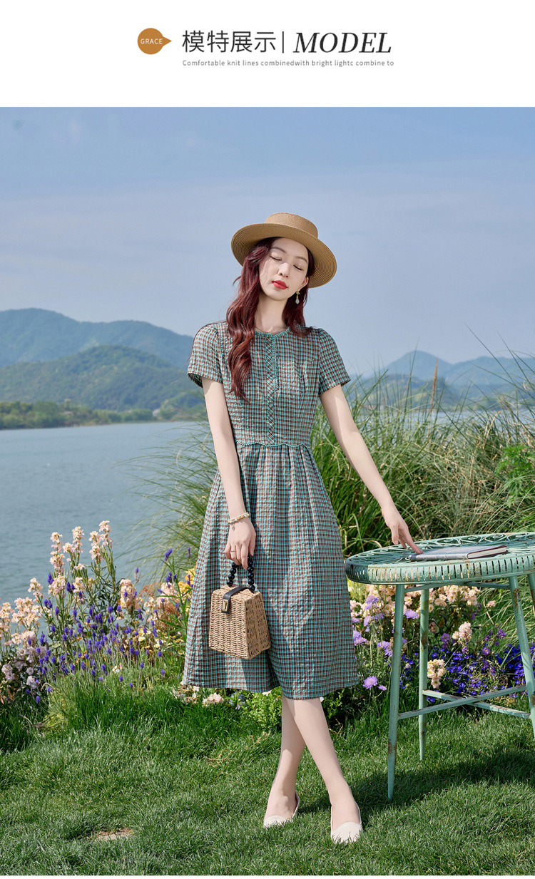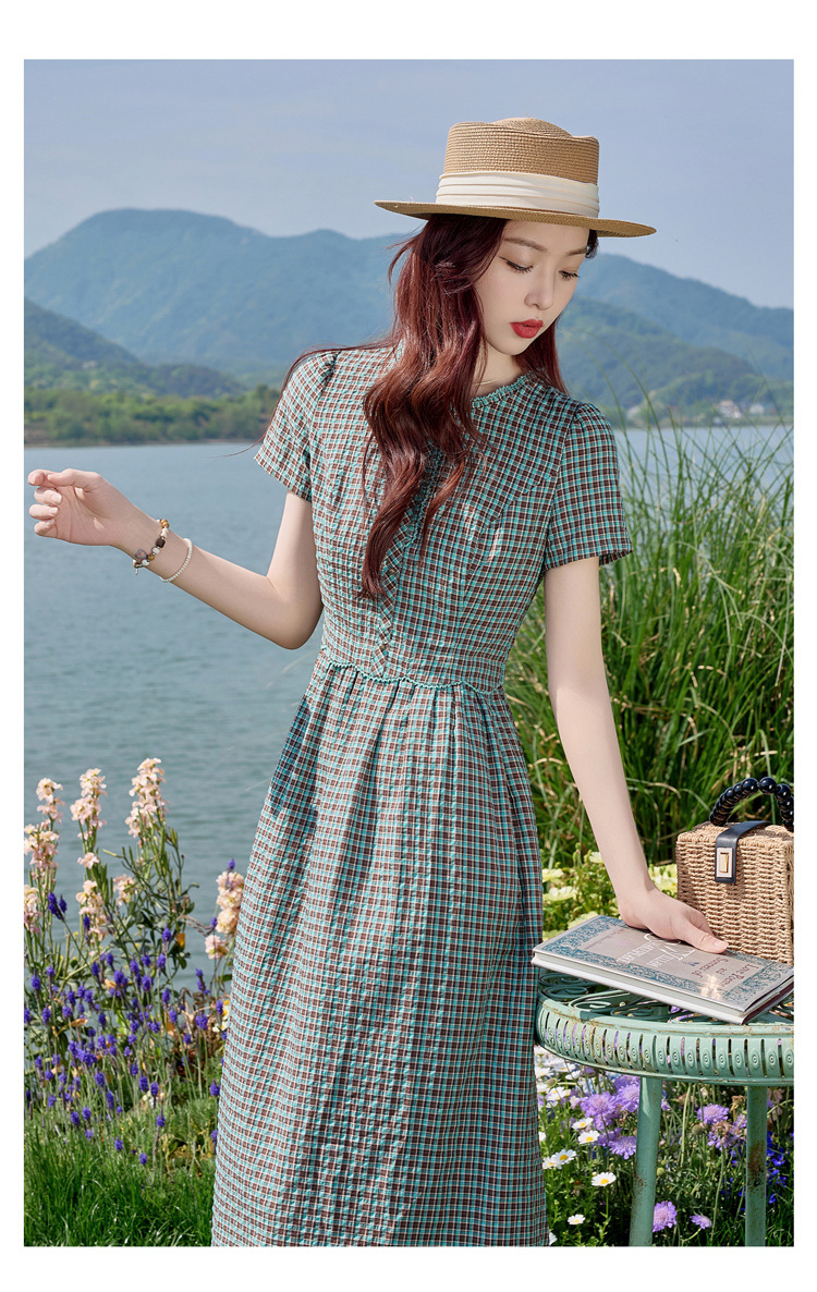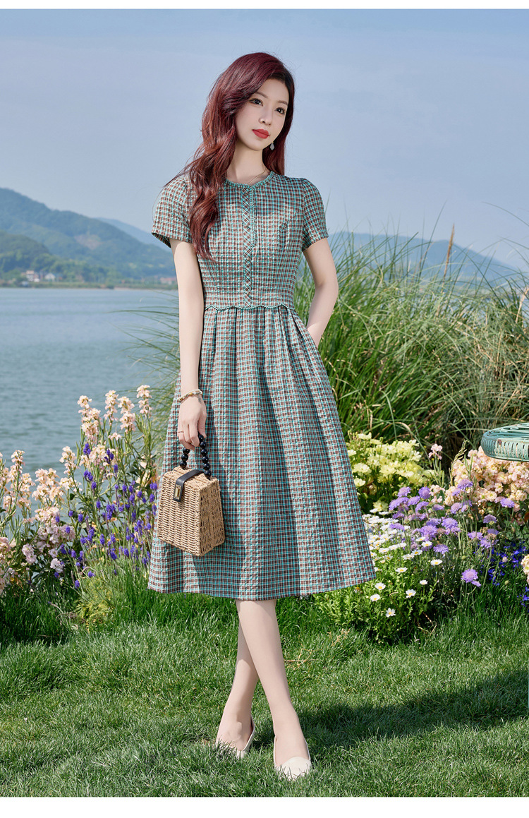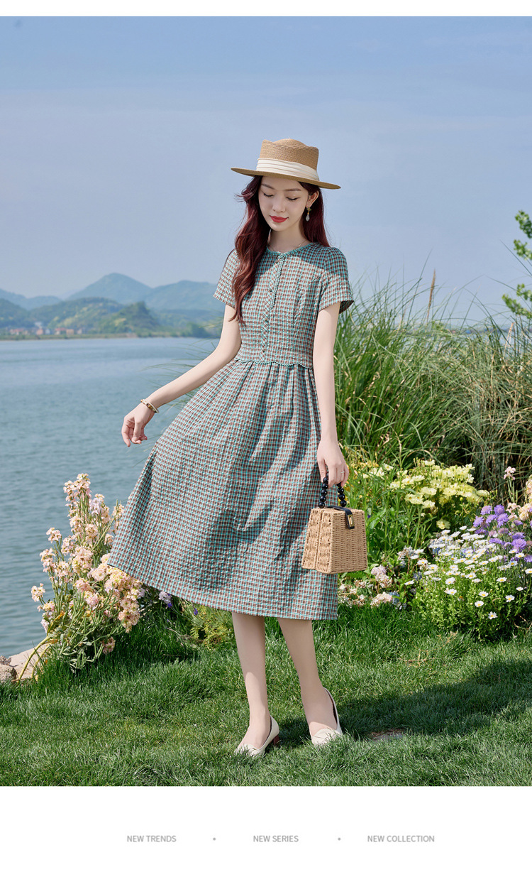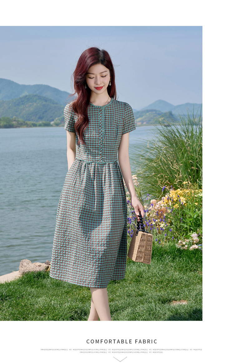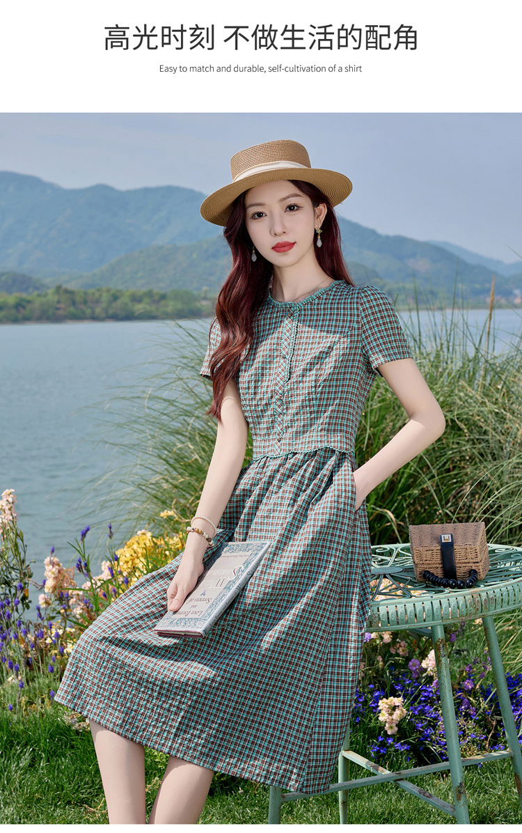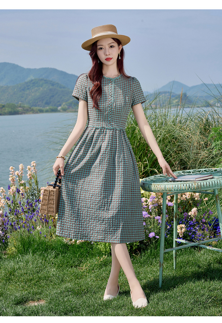HR SYY2708蕾丝镶边秀气中长款格子连衣裙田园风休闲裙