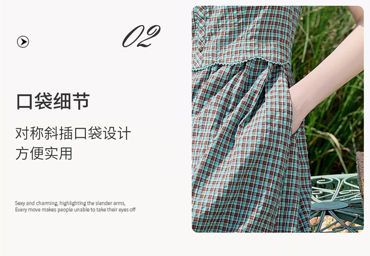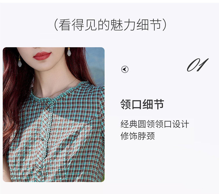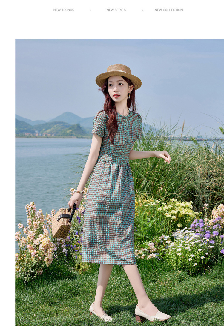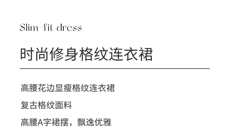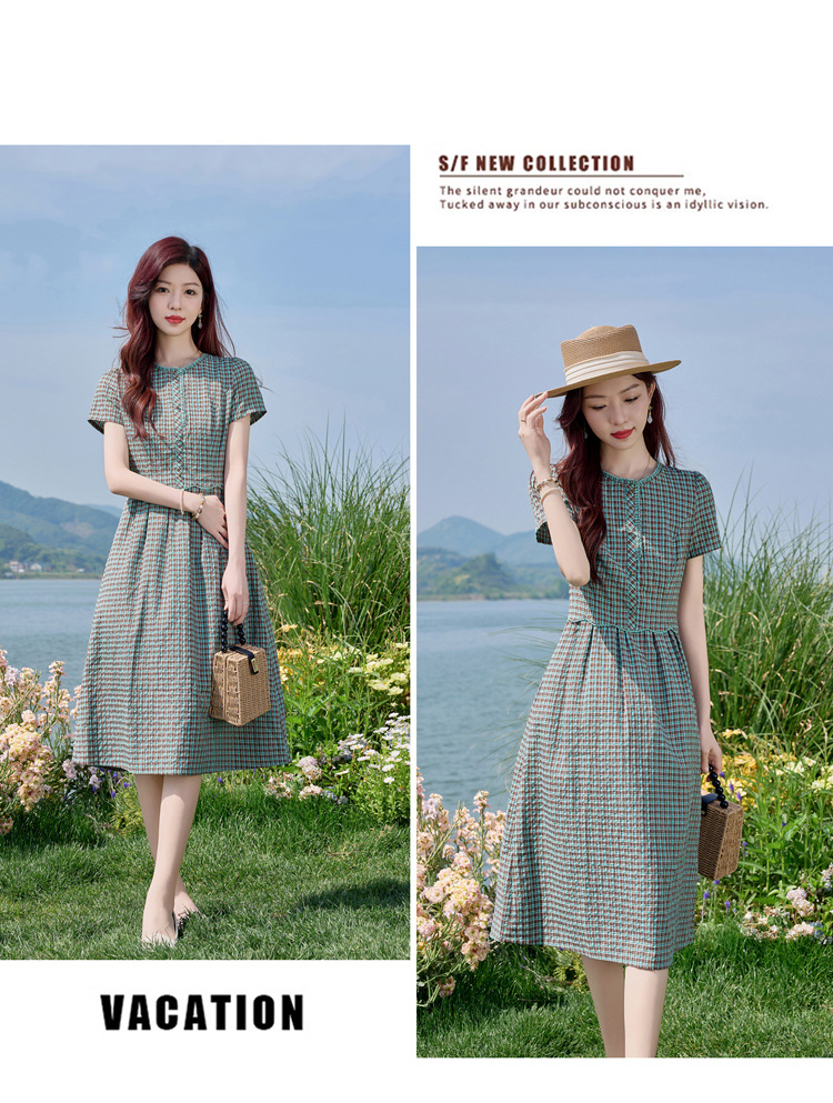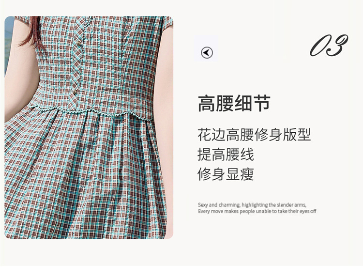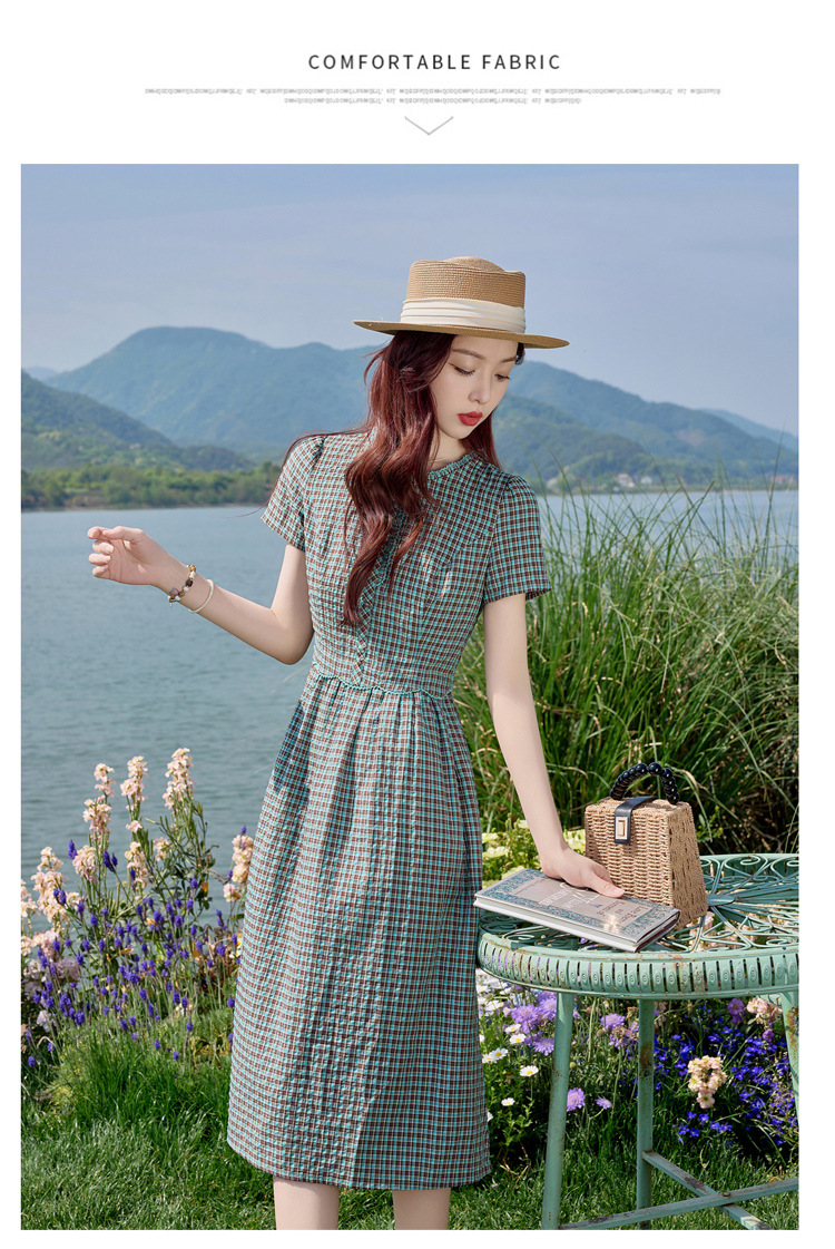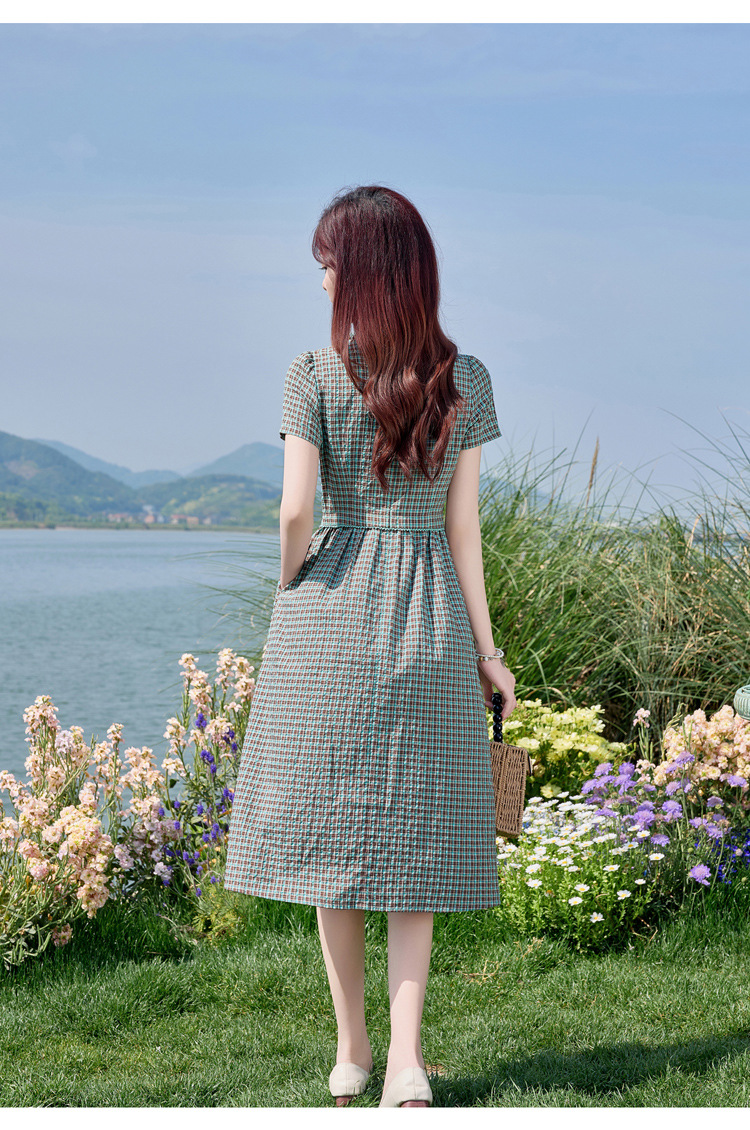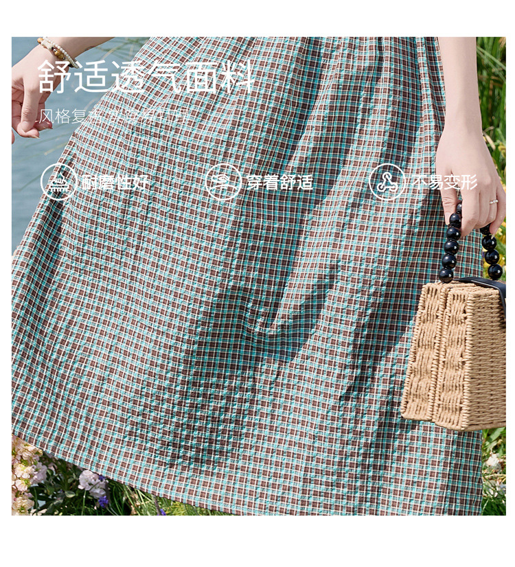 HR SYY2708蕾丝镶边秀气中长款格子连衣裙田园风休闲裙