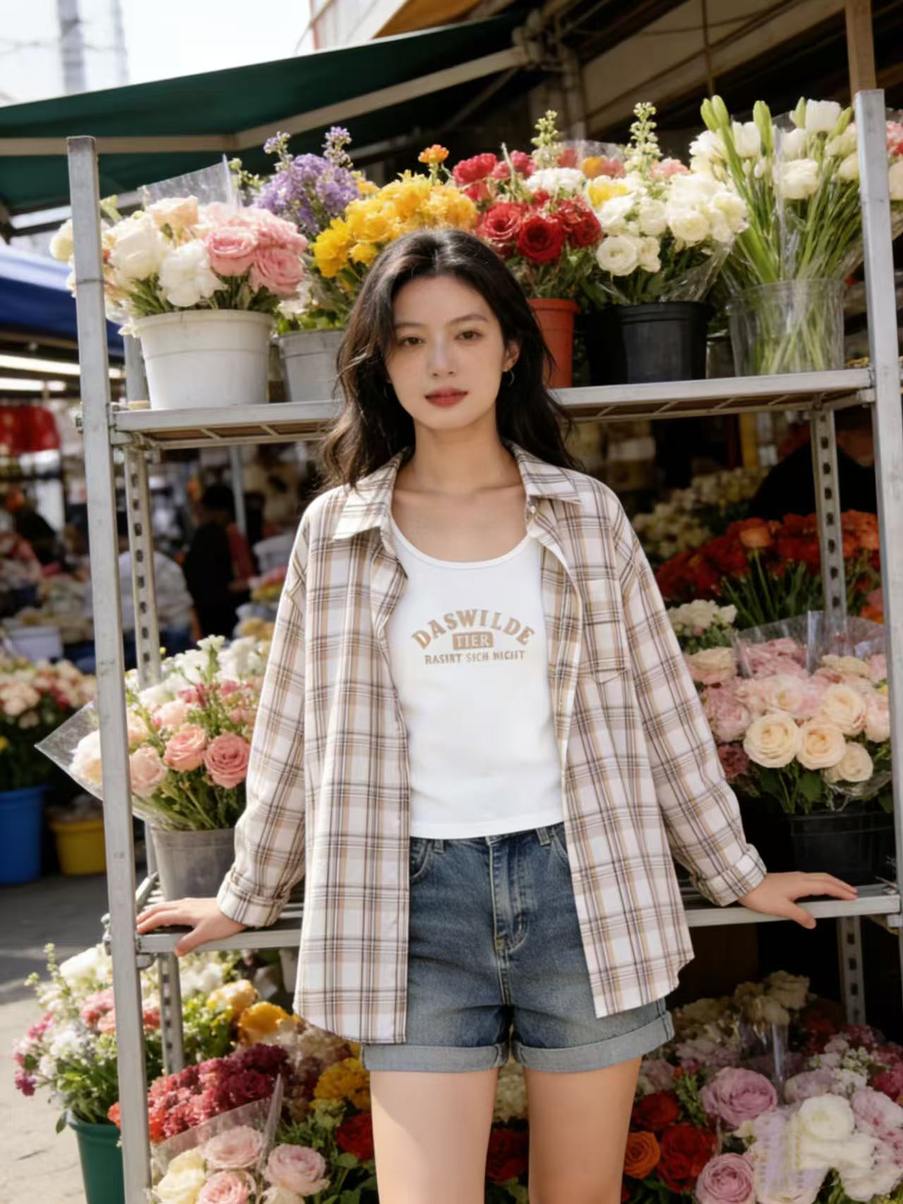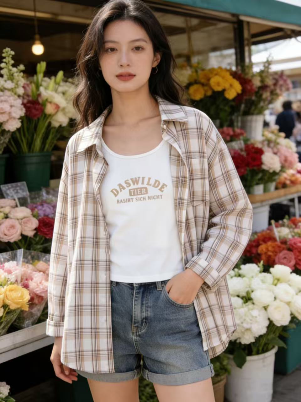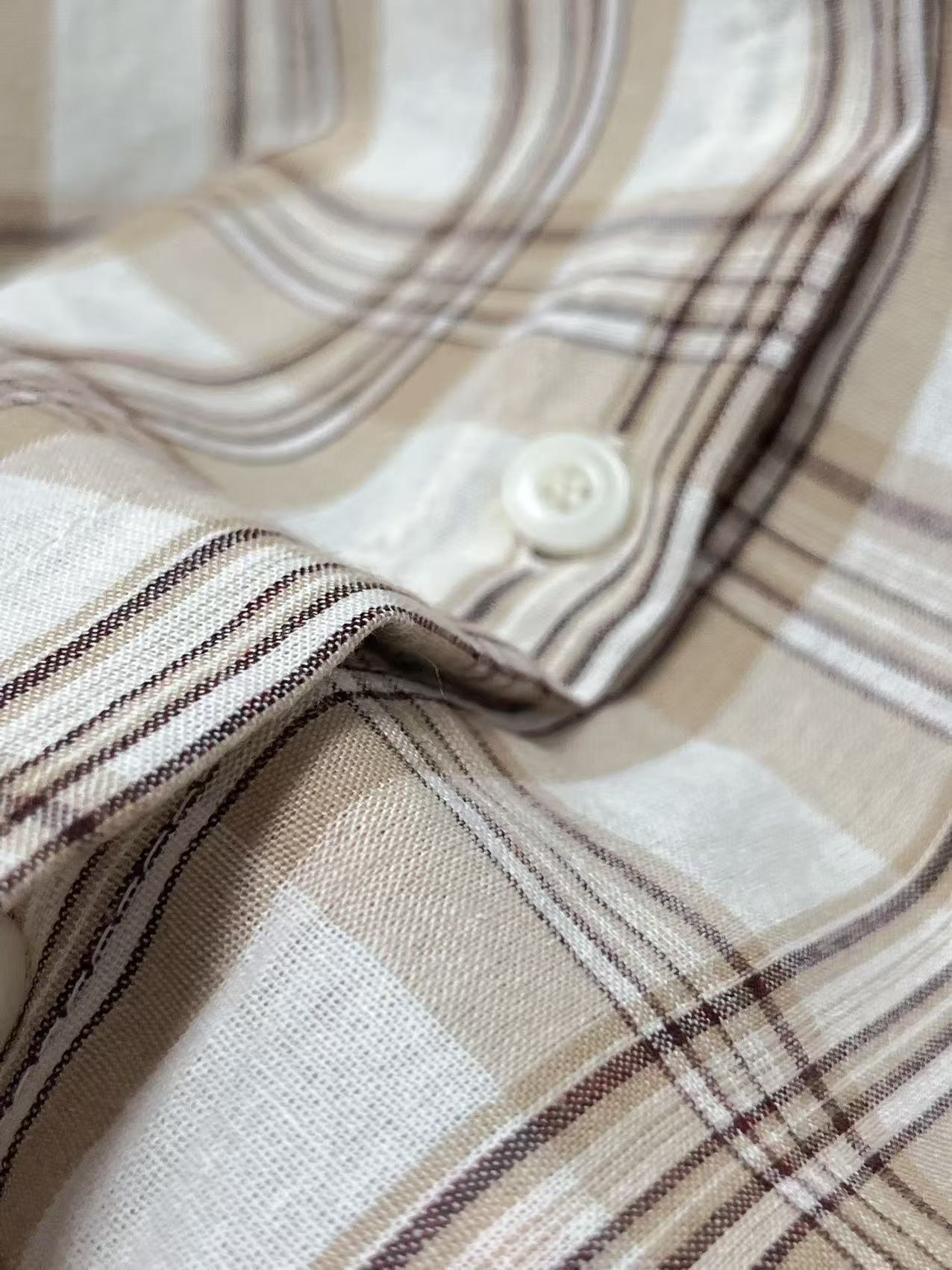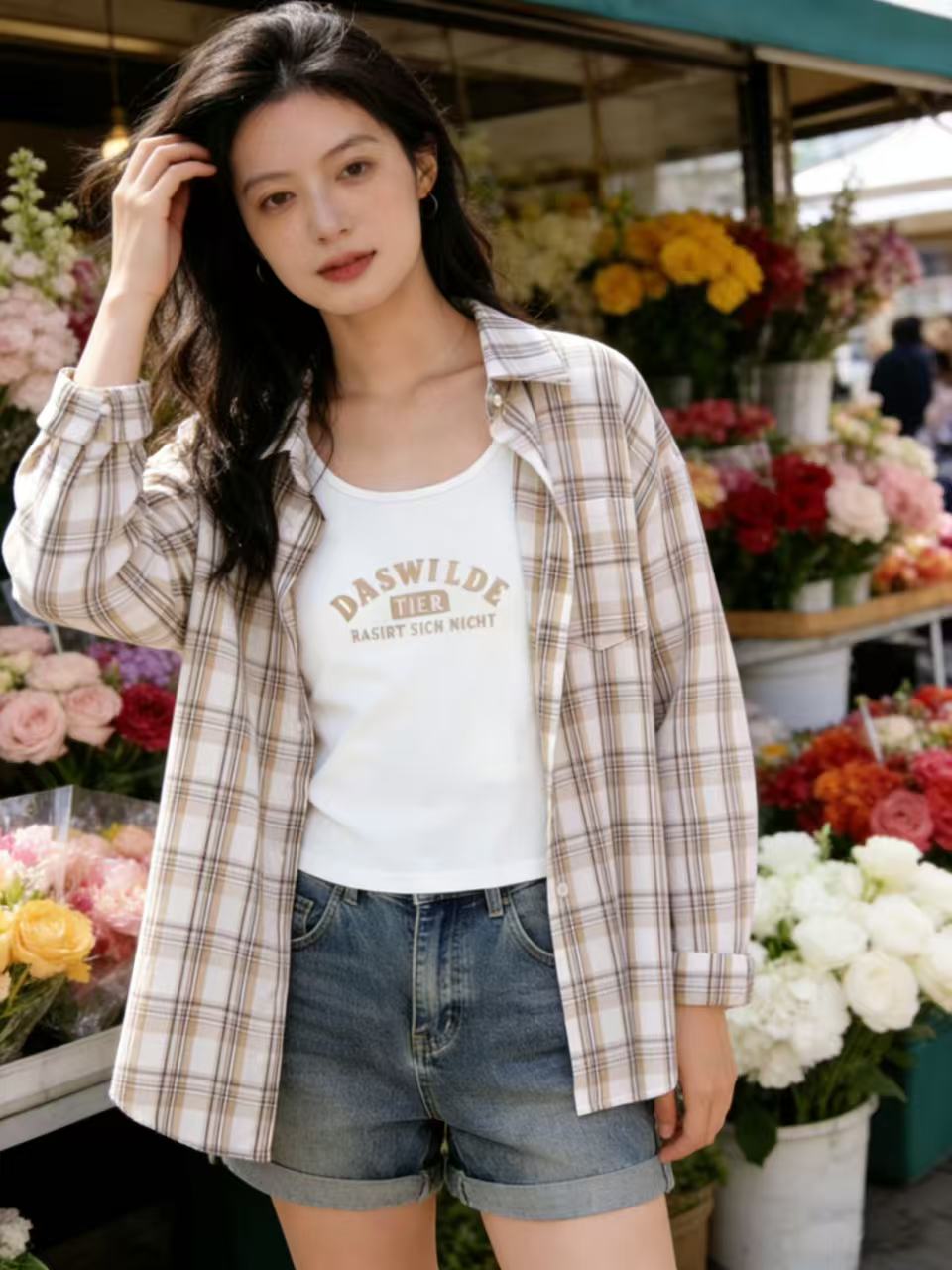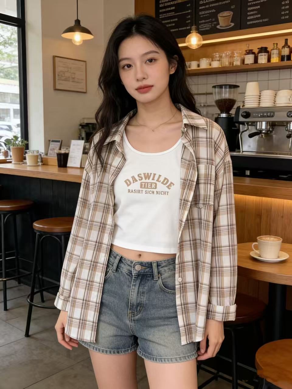 品牌促【自营】衣周期 (两件套)春夏薄款~100%棉9131卡其格子衬衫➕背心套装上衣-喜出