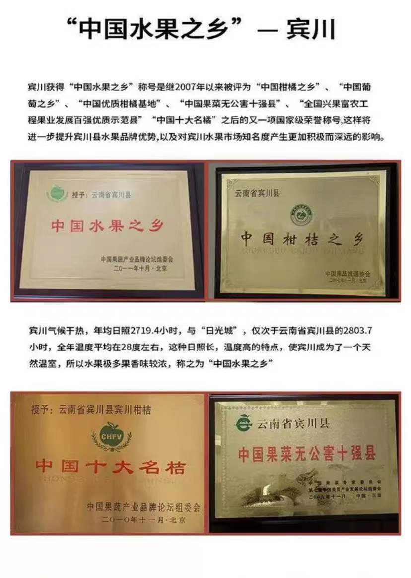 宾川气候资源得天独厚,素有“天然温室”之称,由于柑橘产区处于气温高、日照长、昼夜温差大、土壤肥厚等优越环境,造就了宾川柑橘优良的品质。