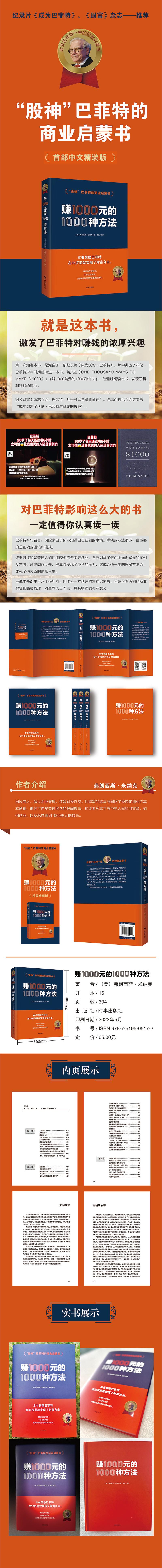 对巴菲特影响这么大的书,一定值得你认真读一读。 巴菲特有句名言:风险来自于你不知道自己在做的事情。赚钱的方法很多,最重要的是正确的逻辑和模式。 该书讲述的是普通人如何用较少的资本去创业,全书列举了数百个通俗易懂的案例及方法。通过阅读此书,巴菲特发现了复利的魔力,这成为他一生的投资方法论,成就了他传奇的财富人生。 虽说本书诞生于八十多年前,但作为一本创造财富的启蒙书,它蕴含着深刻的商业逻辑和赚钱哲理,对商界人士而言,具有很强的参考意义。