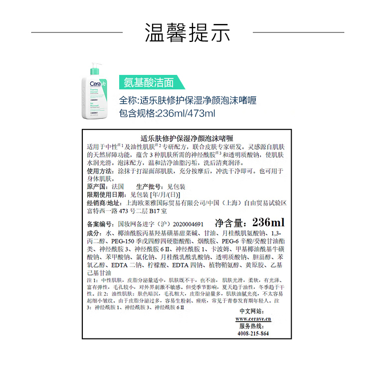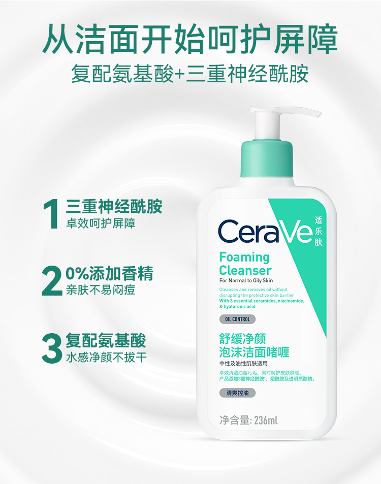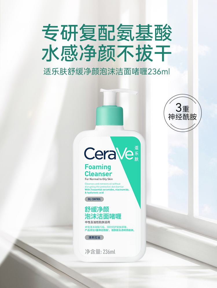 适乐肤舒缓净颜泡沫洁面啫喱 236ml 氨基酸洁面 温和净颜不拔干 三重神经酰胺