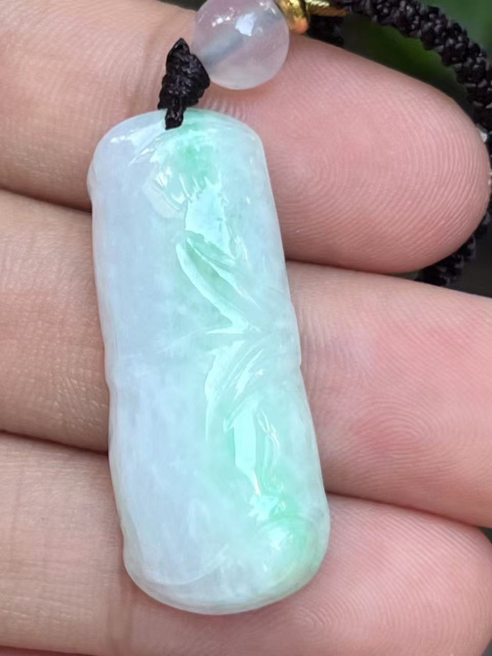 这一手是白底青的料子,也是我们几千件翡翠中唯一的欧白底青。白底青是一种以白色为底色,带有绿色的翡翠。千金难买一抹绿,白底青要的就是这一抹绿,非常吸睛~