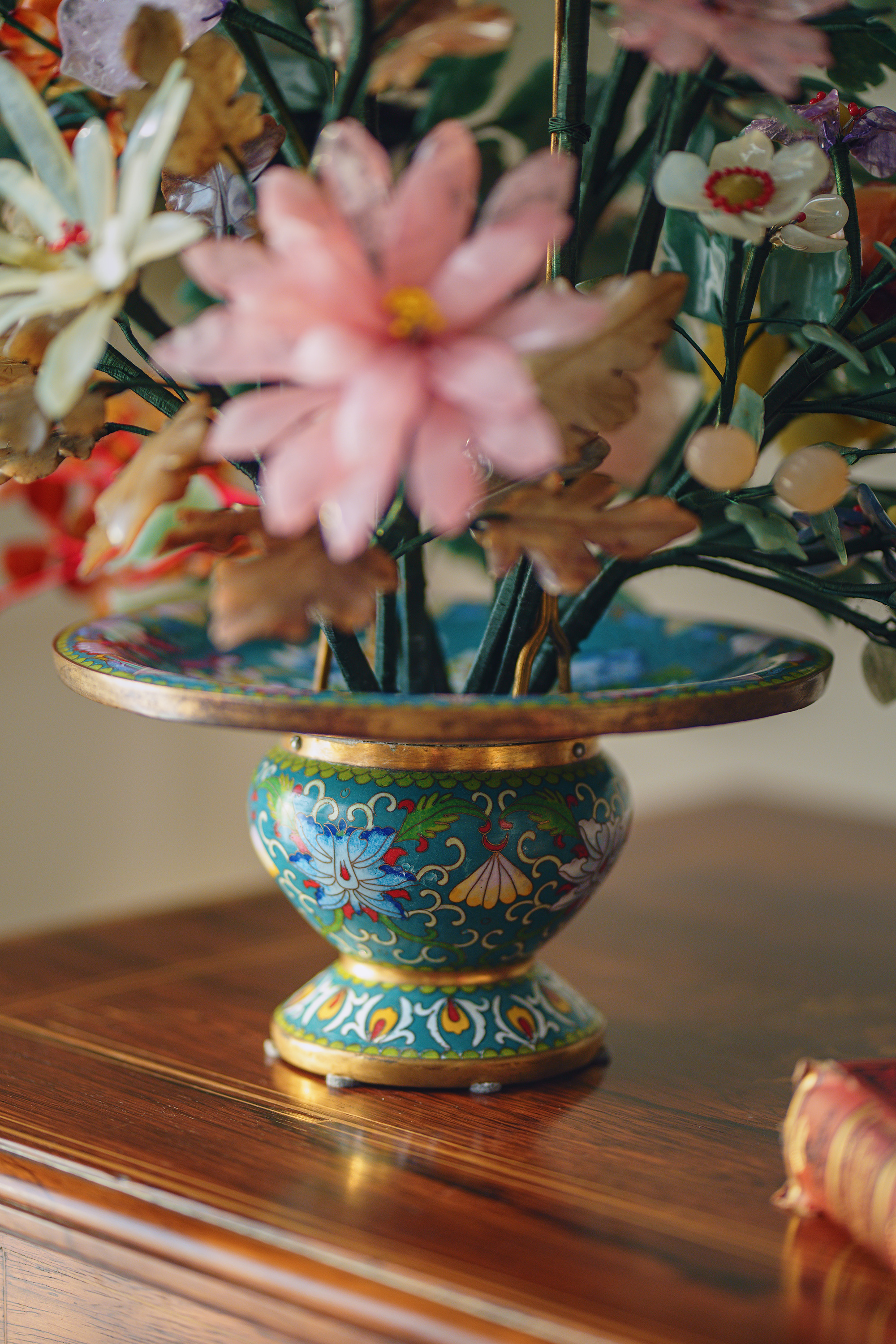 【已售】独角鹿西洋古董20世纪中国出品传统东方花卉纹景泰蓝盆装饰「春色满园」珍宝像生盆景