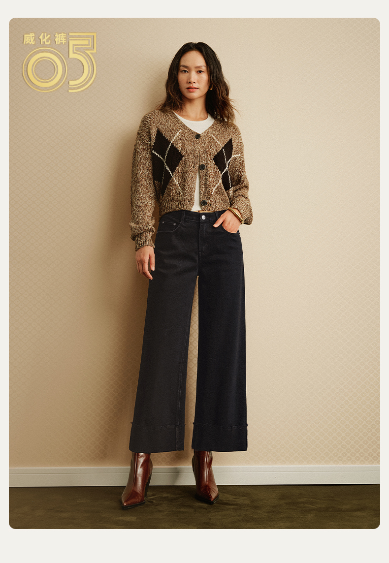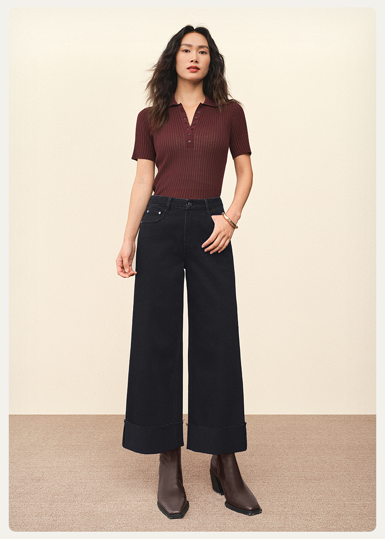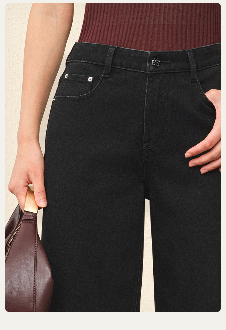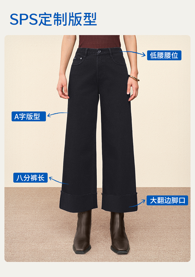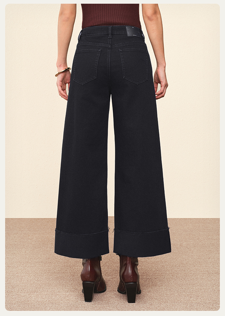 【八分威化裤】simplepieces秋新款SPS牛仔裤女黑色大翻边阔腿裤