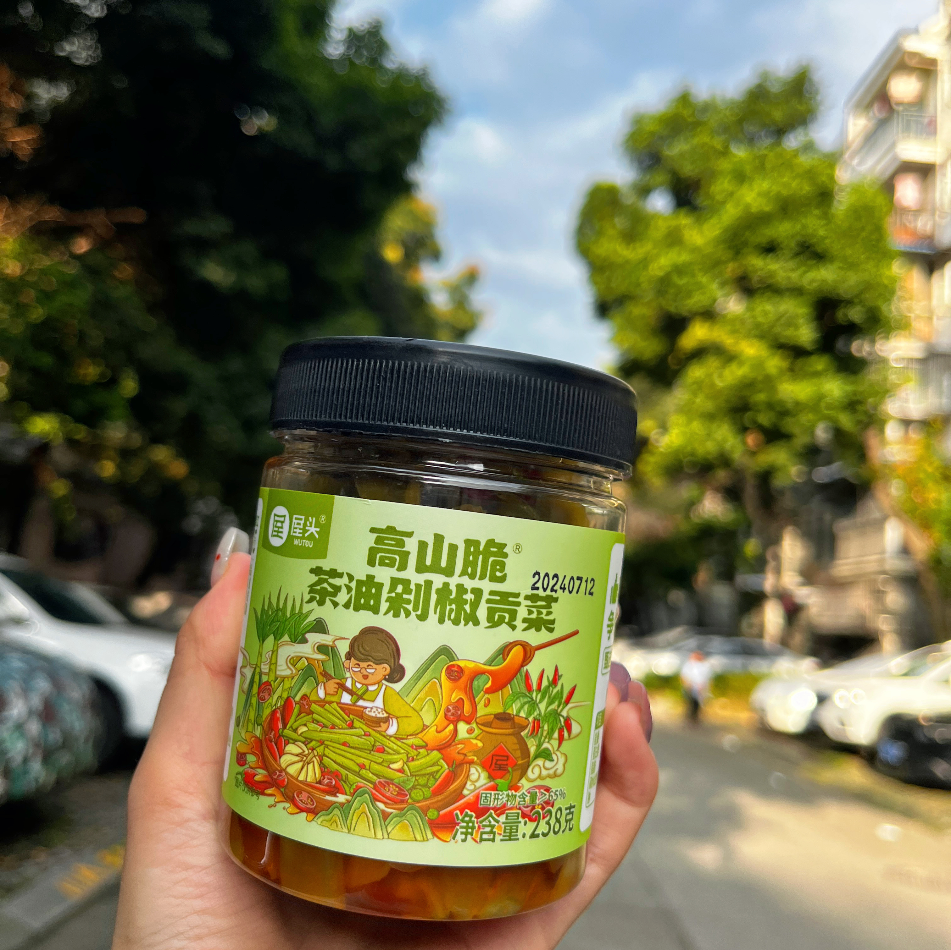 【品名】屋头 茶油剁椒贡菜&屋头 剁椒萝卜干 【口味】剁椒味 【品牌】屋头 【产品类型】即食腌制蔬菜制品 贡菜【配料】贡菜、剁椒、饮用水、食用盐、植物油、茶油、味精、香辛料、食醋、食品添加剂(甜蜜素、安赛蜜、柠檬酸、柠檬酸钠等等) 萝卜干【配料】萝卜、剁辣椒(辣椒、食用盐)、饮用水、食用盐、植物油、香辛料、食品添加剂(甜蜜素、安赛蜜、柠常酸、柠檬酸钠、D-异抗坏血酸钠、冰乙酸、乙二胺四乙酸二钠、脱氢乙酸认、苯甲酸钠、焦亚硫酸钠、谷氨酸钠 【保质期】6个月 【食用方法】开盖即食 【生产日期】见包装喷码 【产地】湖南 湘潭 【发货地】四川 成都 【贮存方法】置于阴凉、干燥处保存,开盖后需冷藏 【食品生产许可证号】SC11643030110129 【发货快递】中通/圆通/邮政(随机发货) 【不发货地区】新疆 青海 西藏 内蒙 海南 港澳台不发货,其他地区因不可控原因,根据实际情况发货 【致敏原】本品含大豆制品!!! 【致敏原】本品含大豆制品!!! 【致敏原】本品含大豆制品!!!