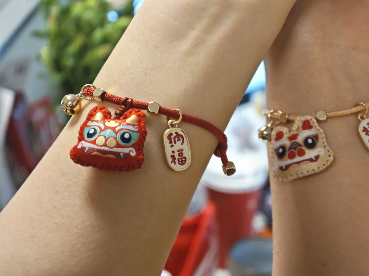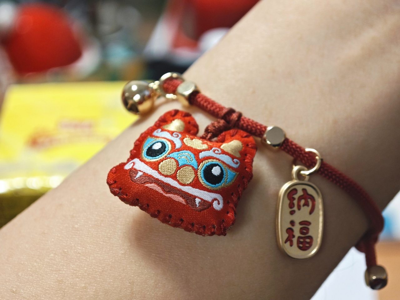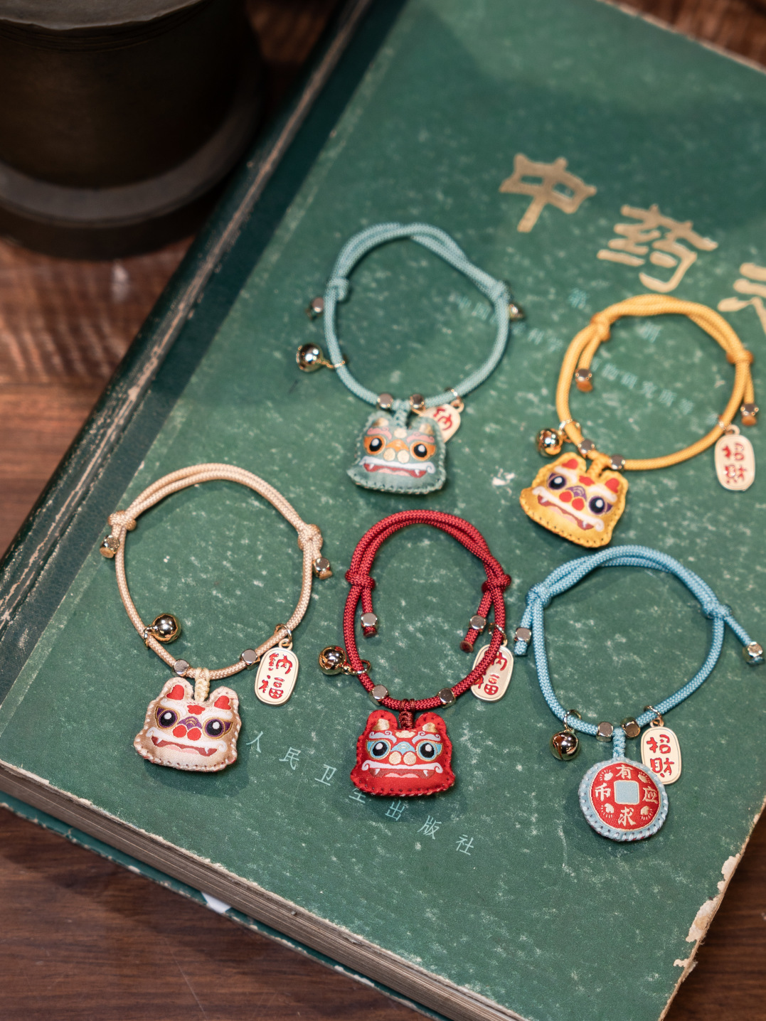 手链上的挂着一个可爱的卡通龙香囊,边上点缀加了一个小铃铛和福牌,好看又寓意满满。