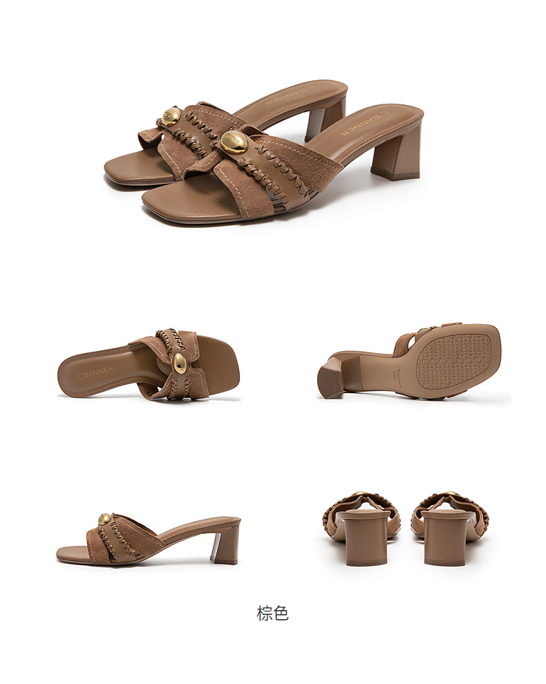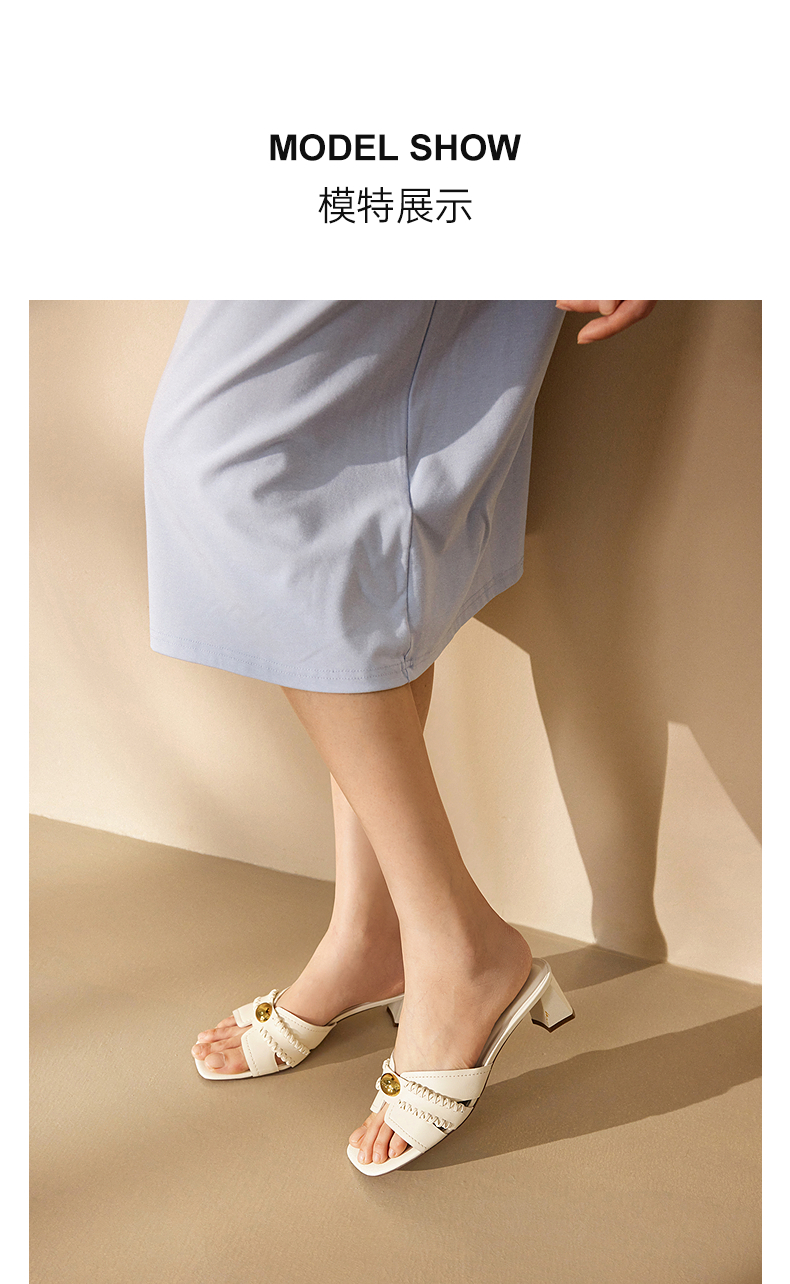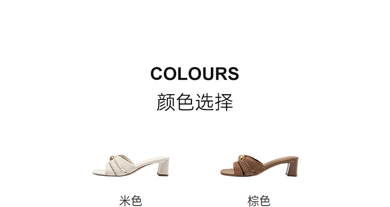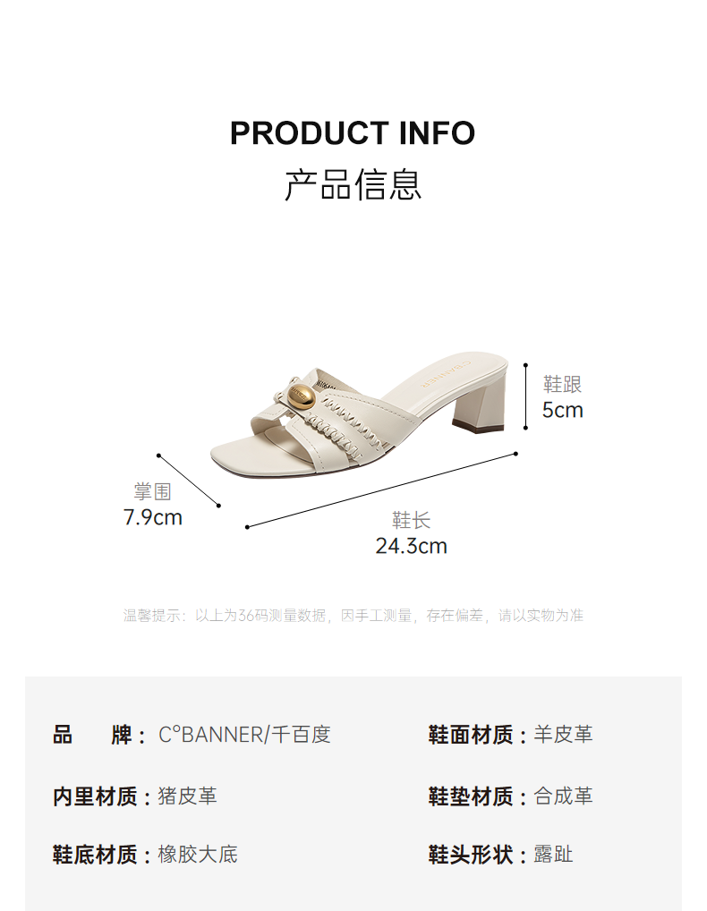 【静音系列】千百度粗高跟羊皮露趾凉拖鞋女款一字拖A25386106