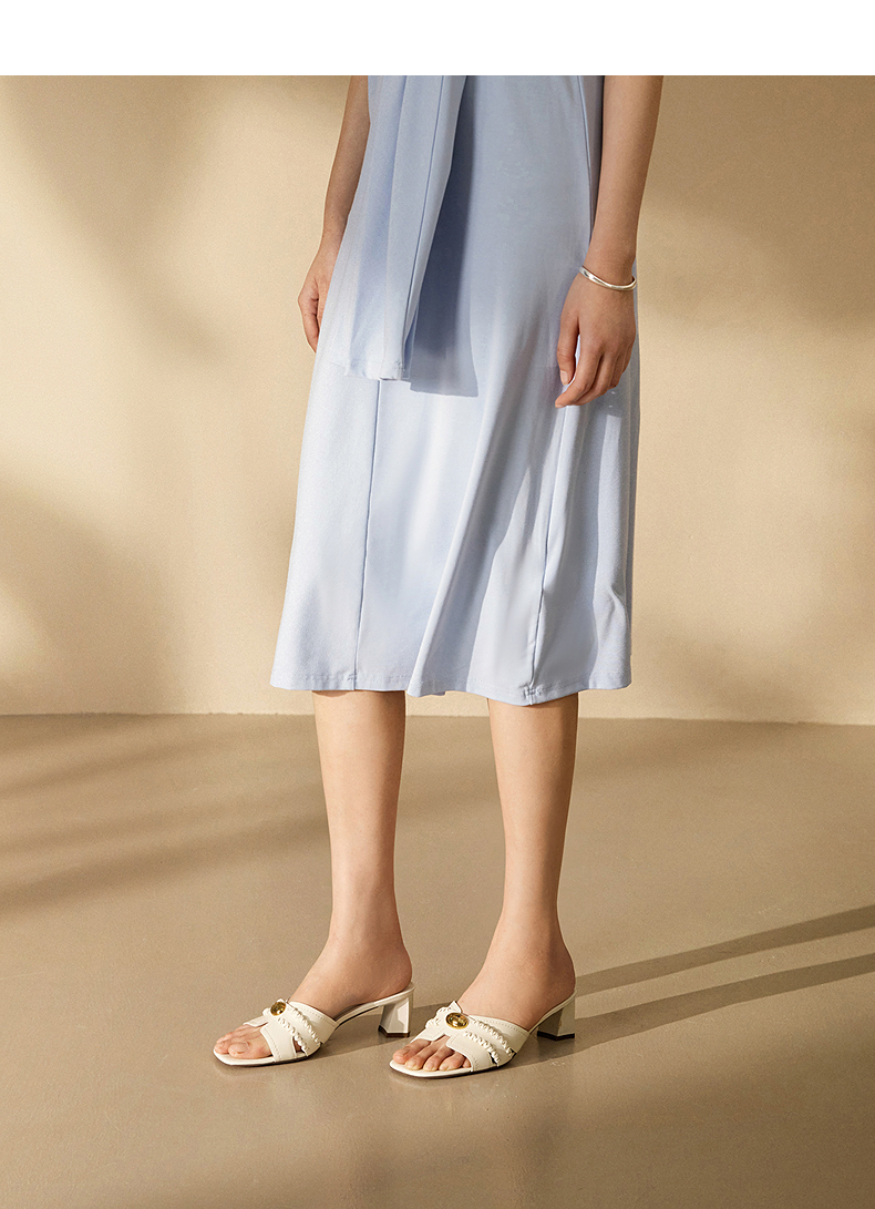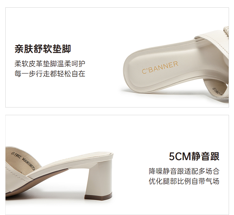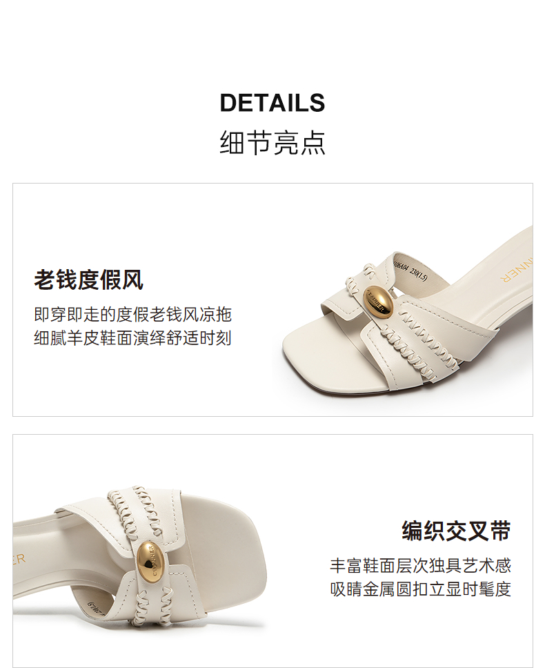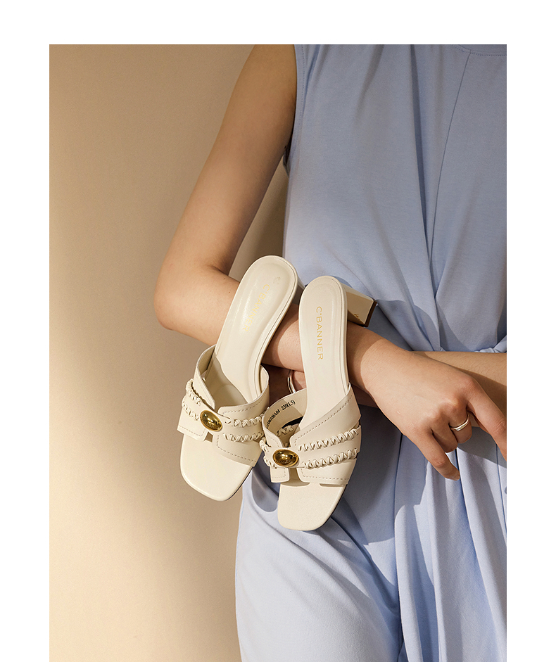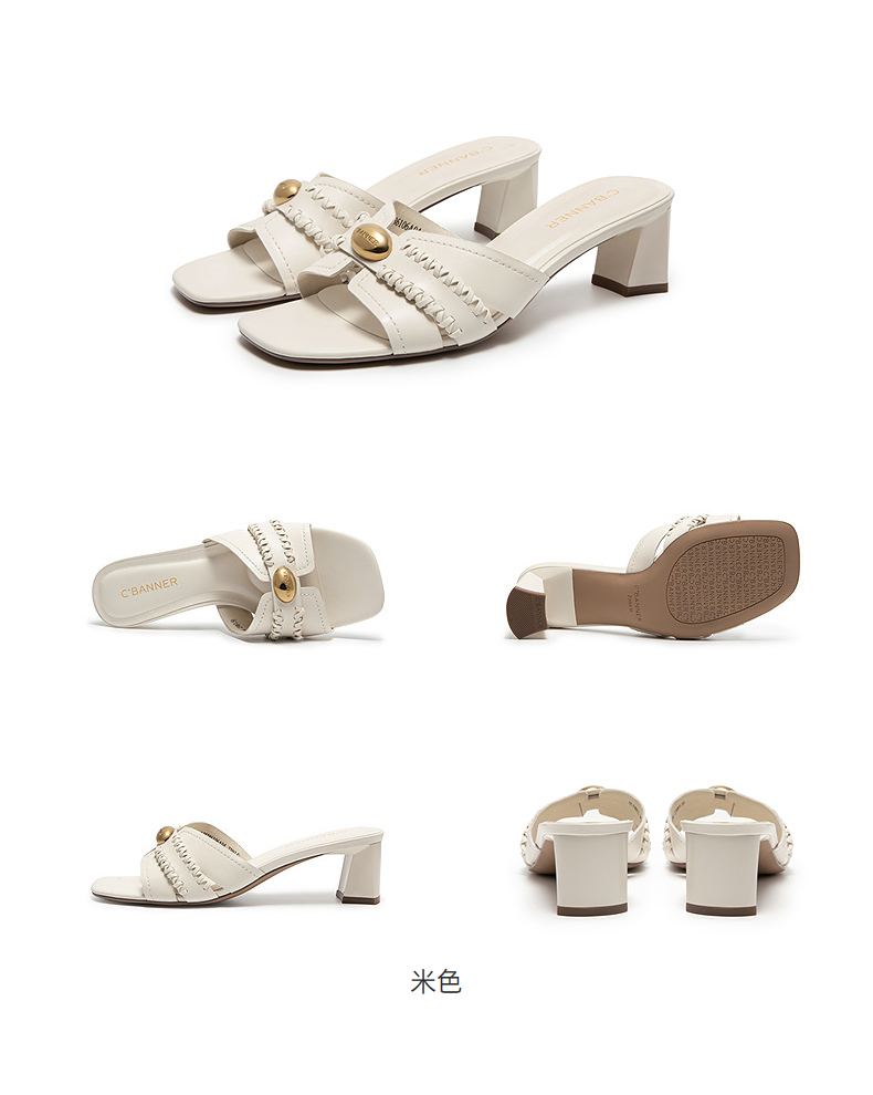 【静音系列】千百度粗高跟羊皮露趾凉拖鞋女款一字拖A25386106