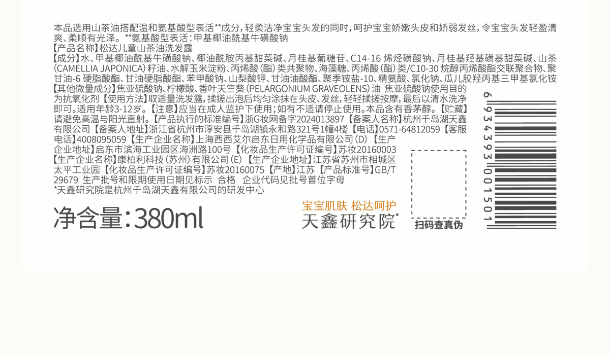 松达儿童洗发水儿380ml专用中大童洗发露氨基酸护发男女孩洗头膏