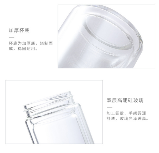 杯盖内盖采用304不锈钢材质设计 安全卫生更耐用 杯身采用双层高硼硅玻璃 防烫一体,耐急速温差不易炸裂 杯底是加厚水晶底 手托不烫手,手感也更圆润舒适
