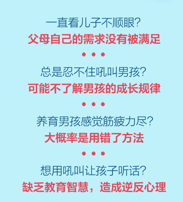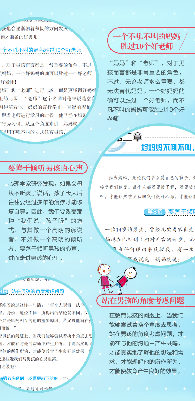 作为妈妈,无论我们多么爱自己的孩子,如果缺少了良好的教育方式,也无法让他接受我们的爱。每个人都渴望被了解,渴望被爱,男孩也不例外。其实,好妈妈不吼不叫,才能让男孩主动向我们敞开心扉,才能让我们了解男孩神秘而丰富的内心世界。