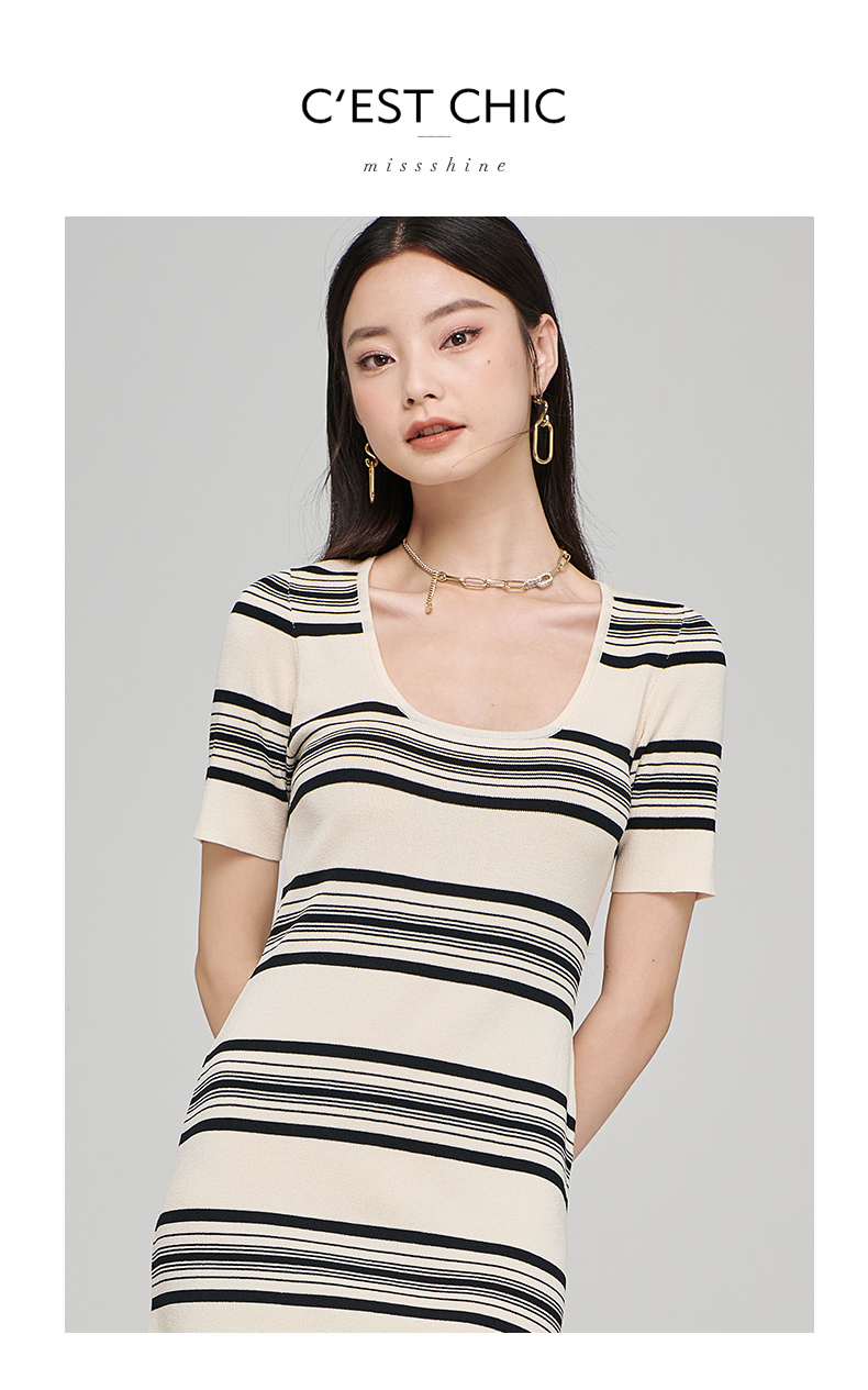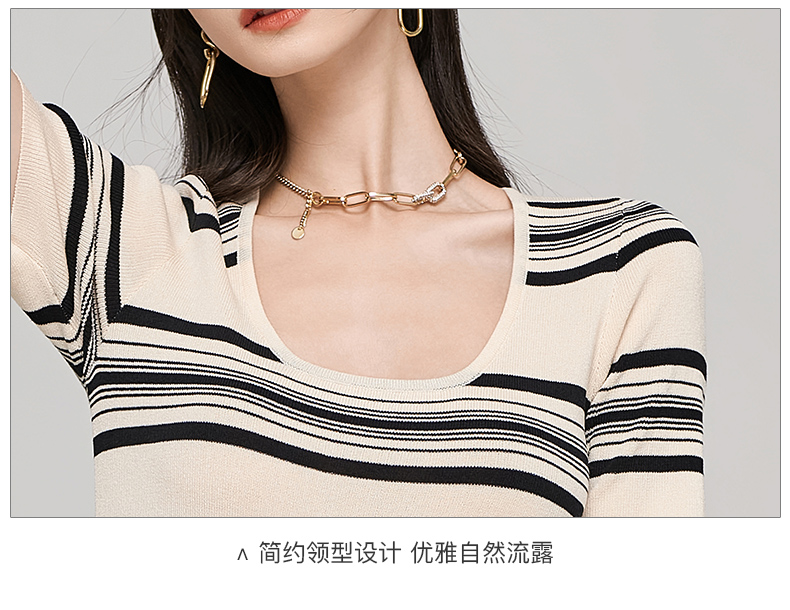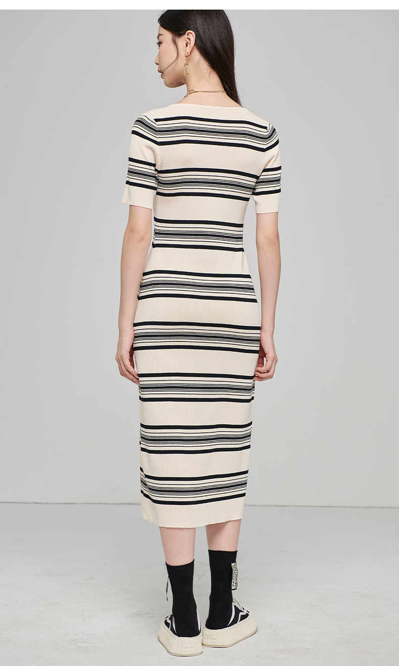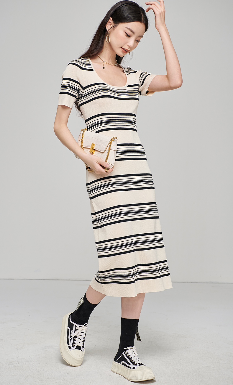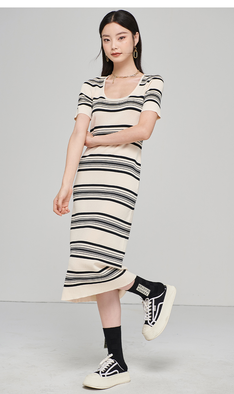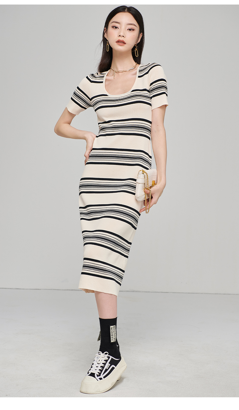 芳外秋季新款气质修身针织长裙时尚条纹露锁骨短袖连衣裙1728