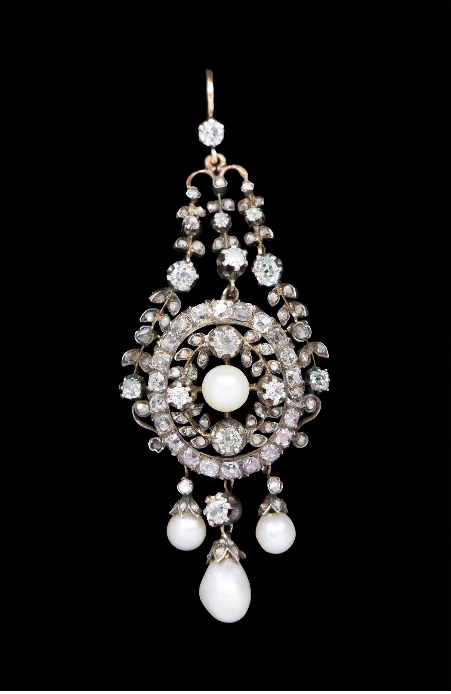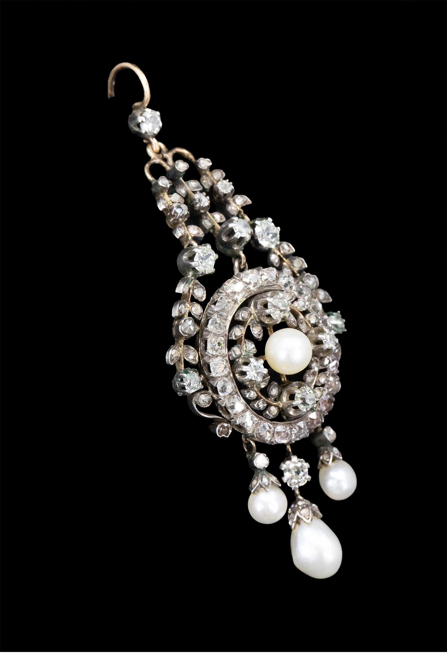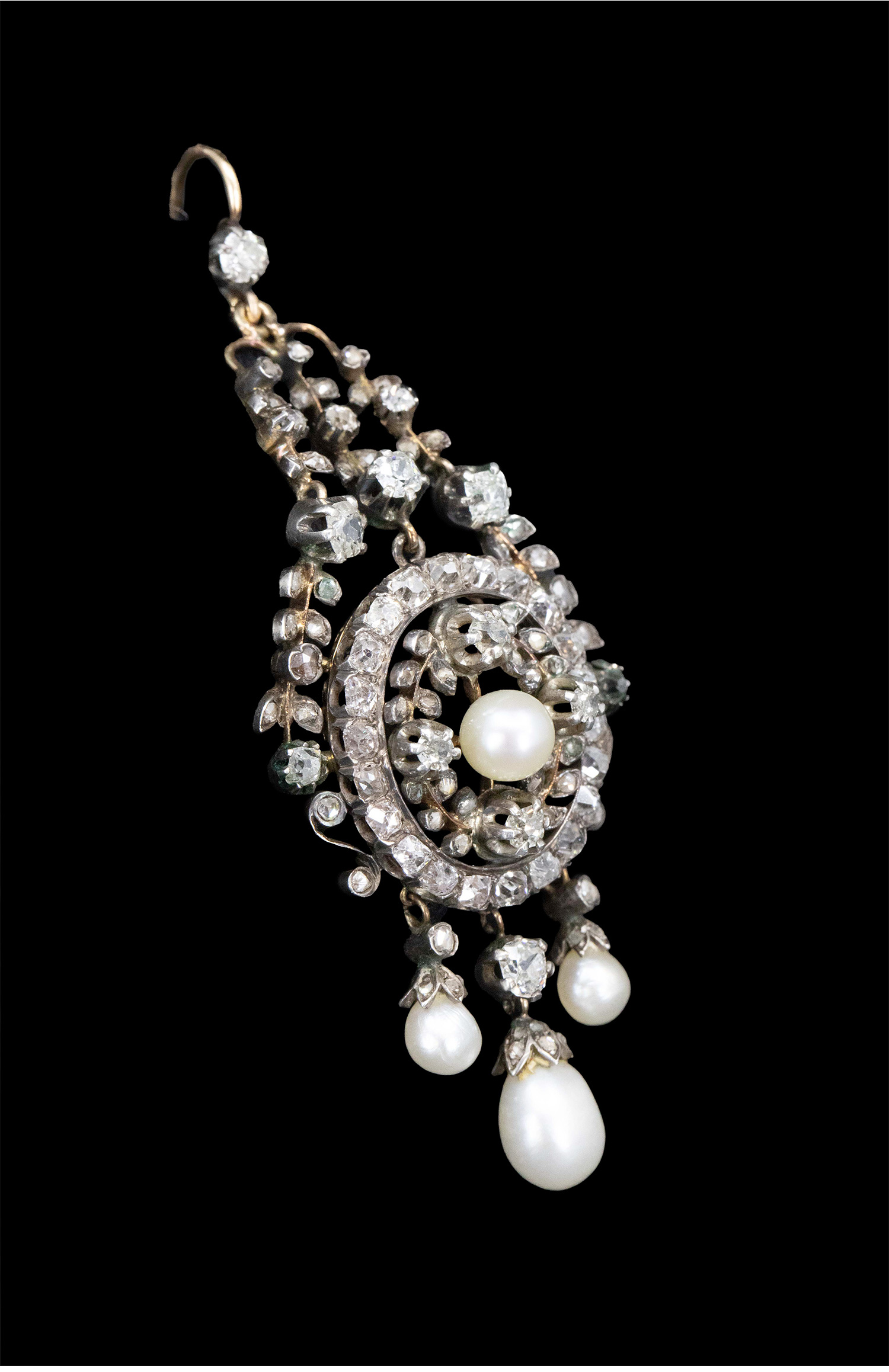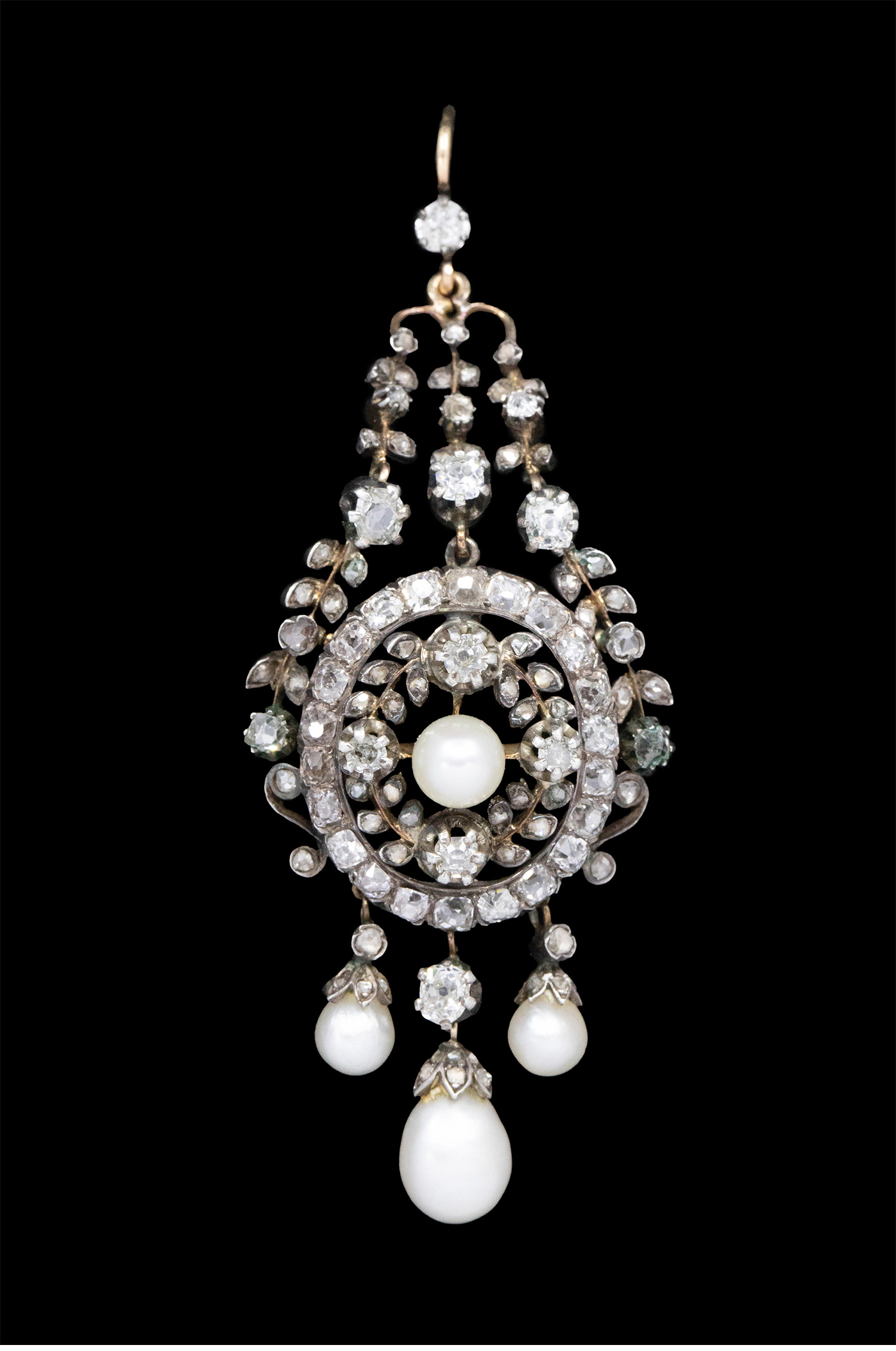 19世纪法国出品自然花叶主题黄金底纯银镶嵌钻石及天然海水珍珠流苏造型耳坠一对