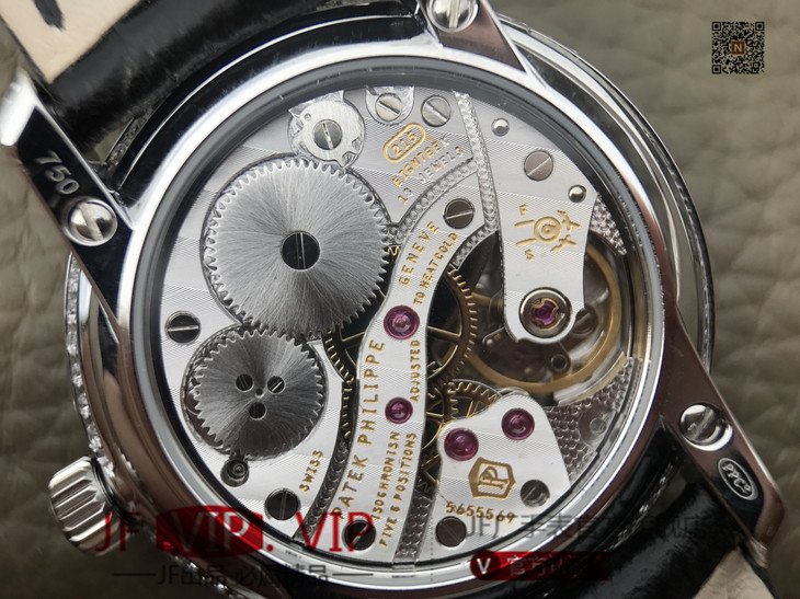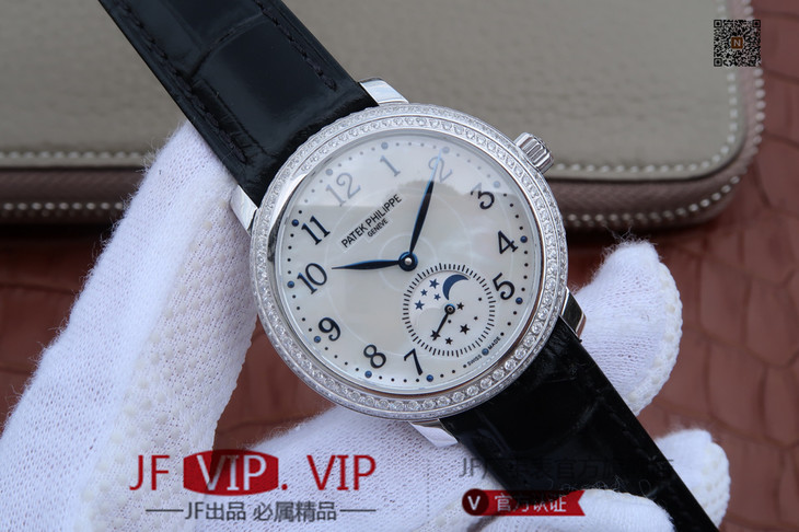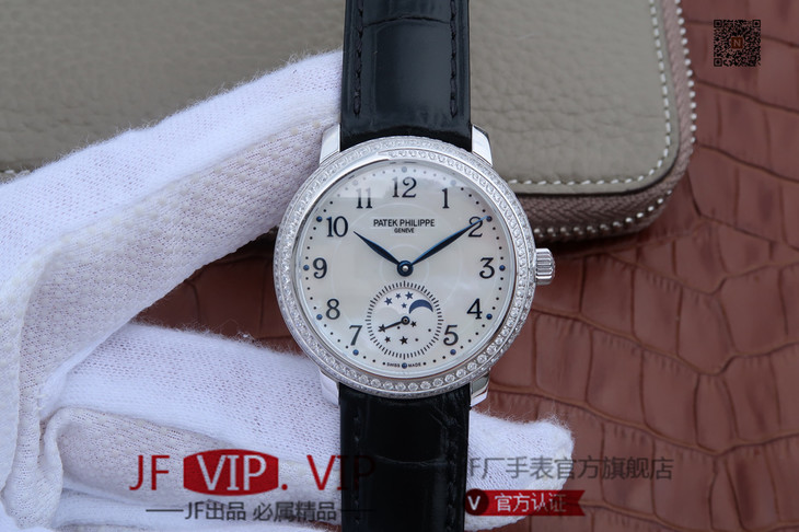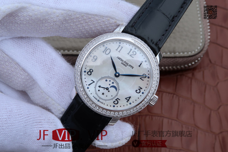 KG百达翡丽复杂功能系列4968女士手表。海鸥克隆组装215 PS LU手动机械机芯,33.3毫米直径,镶嵌施华洛世奇钻。