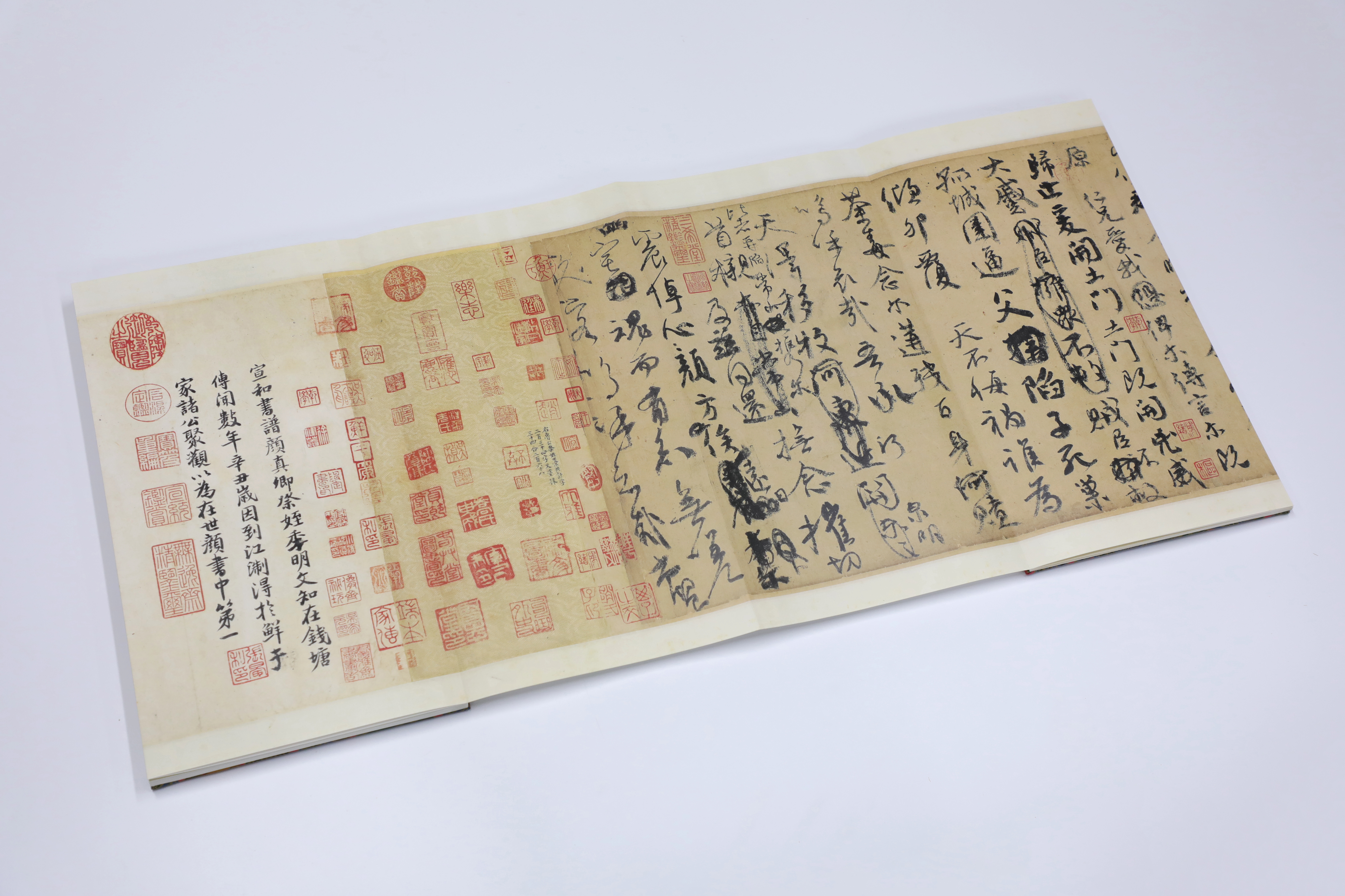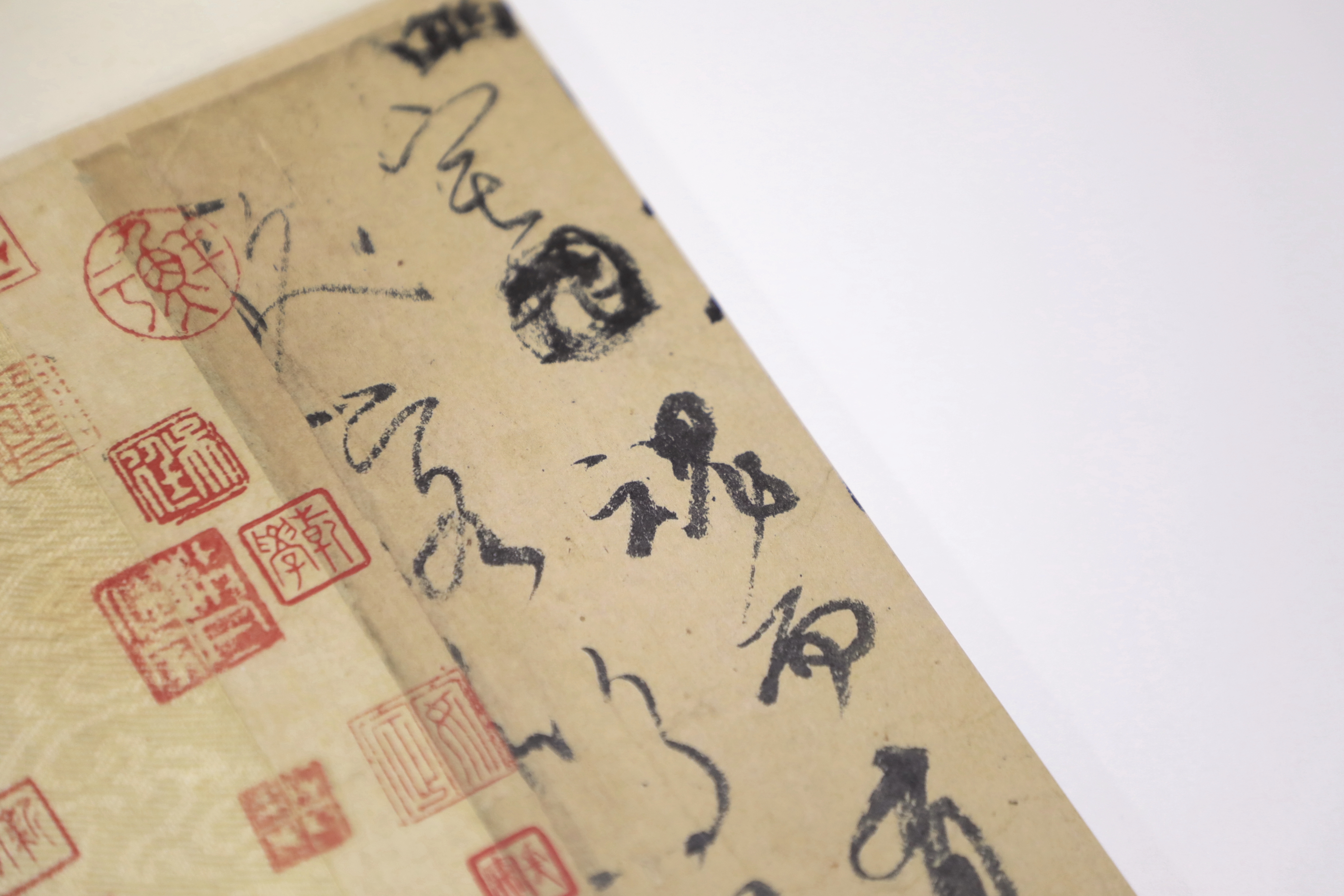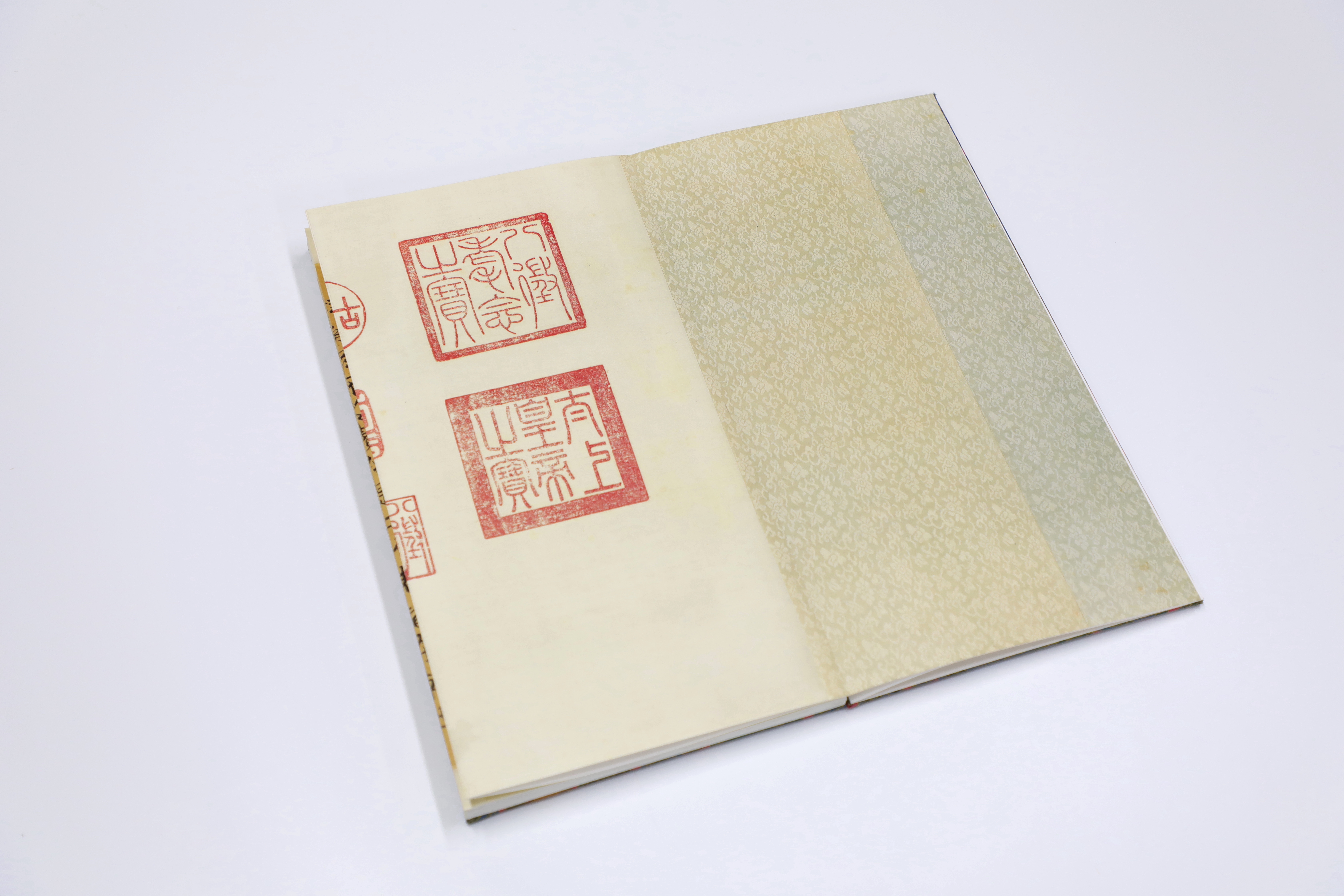 此次出版,也是《祭侄文稿》出版史上最完整的呈现,更完整地展现了作品现存状况的全貌。包括二玄社复制品中没有收录的手卷天头及隔水部分的同一纹样、不同色彩的几何花纹绫,《故宫法书新编》中没有收入的手卷天地绫边,以及便利堂复制品中鲜于枢跋后的所有题跋及尾纸,悉数收录呈现。