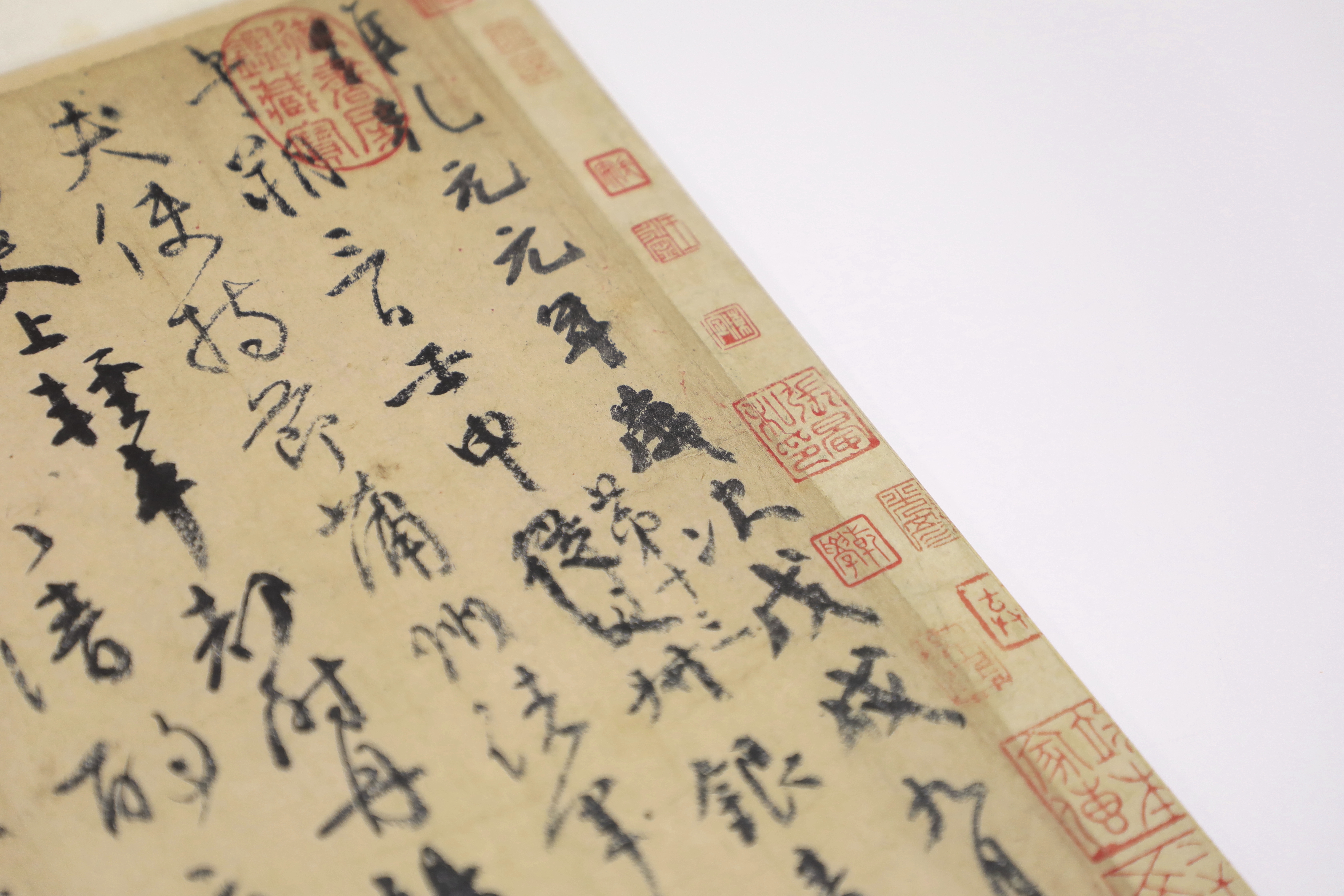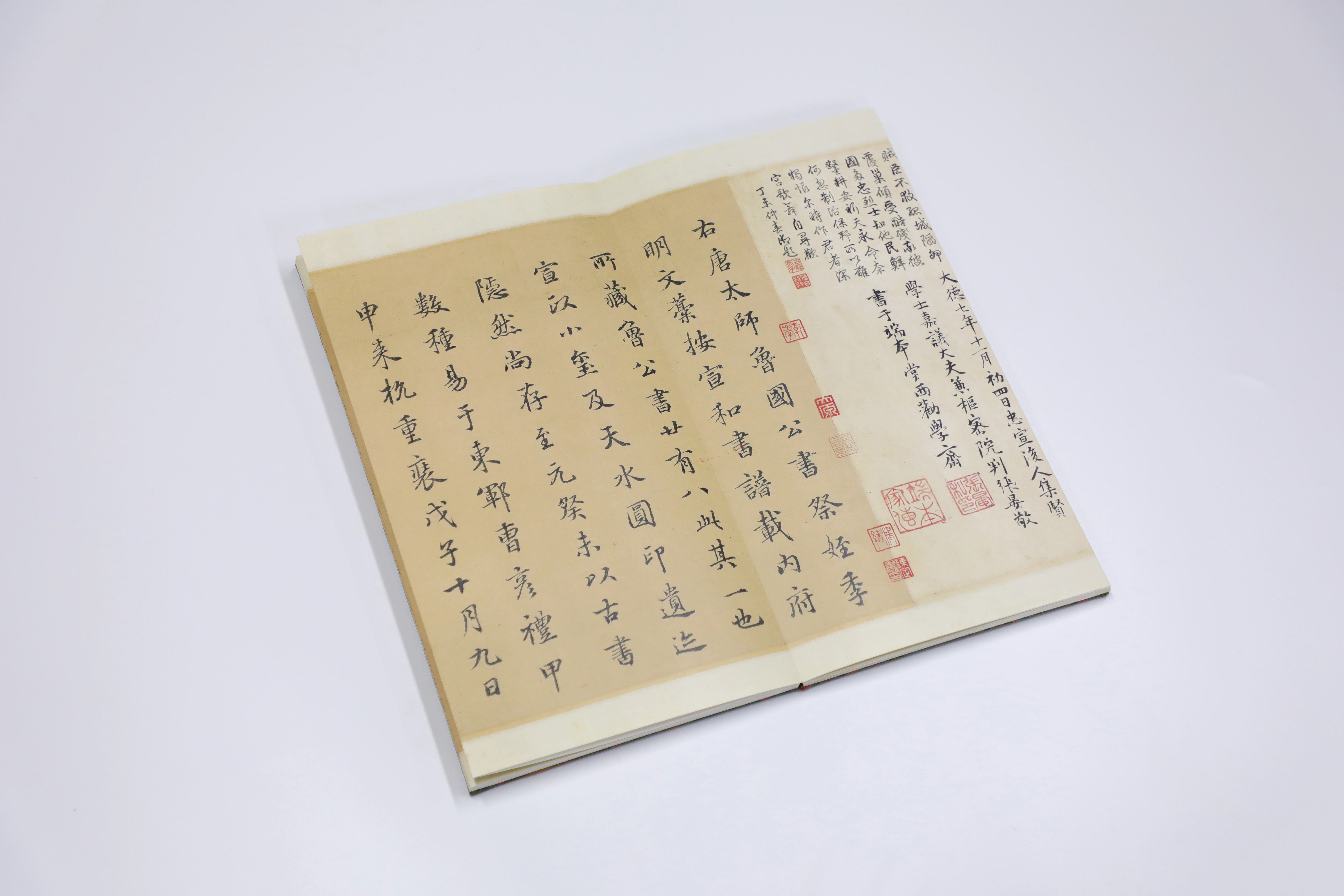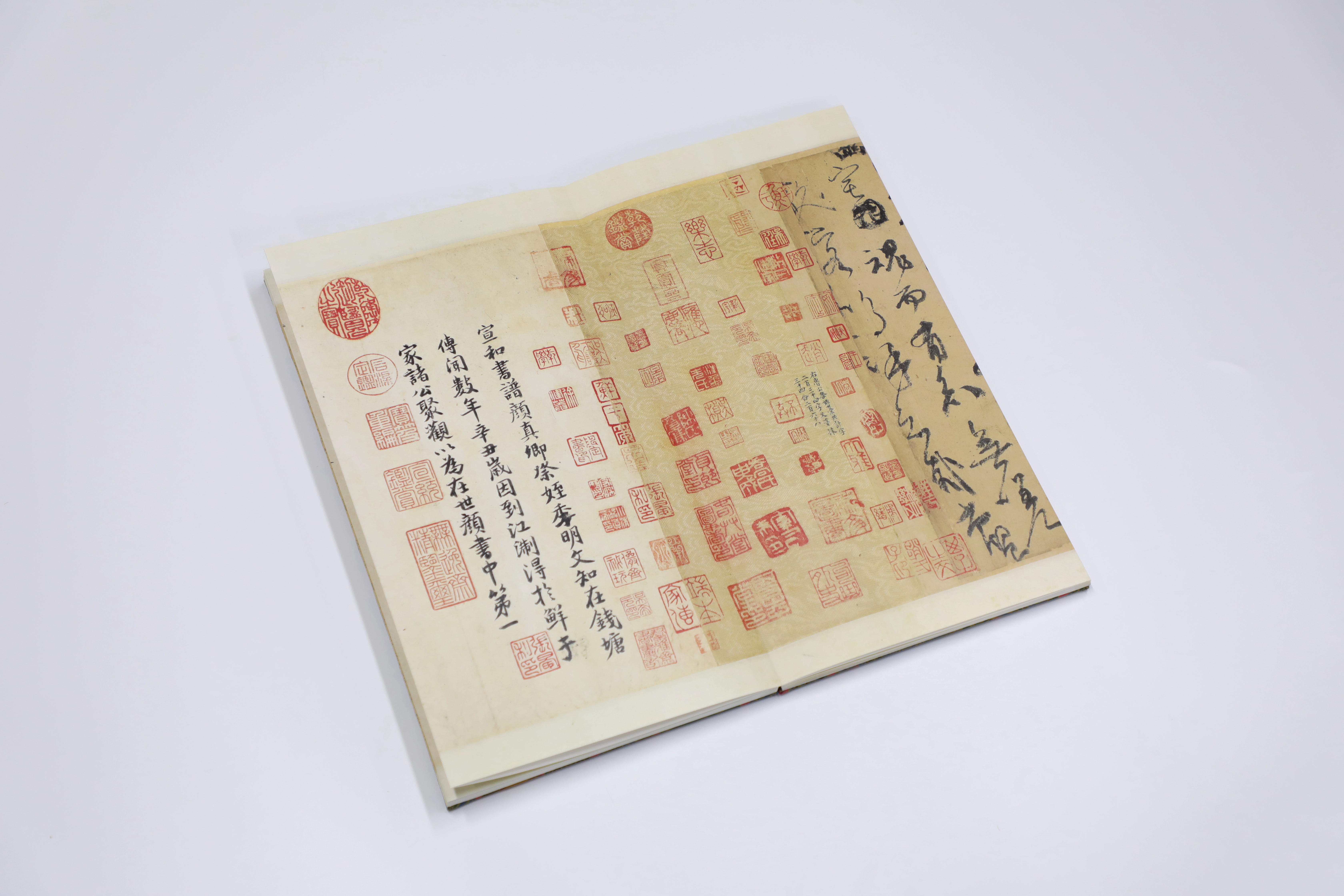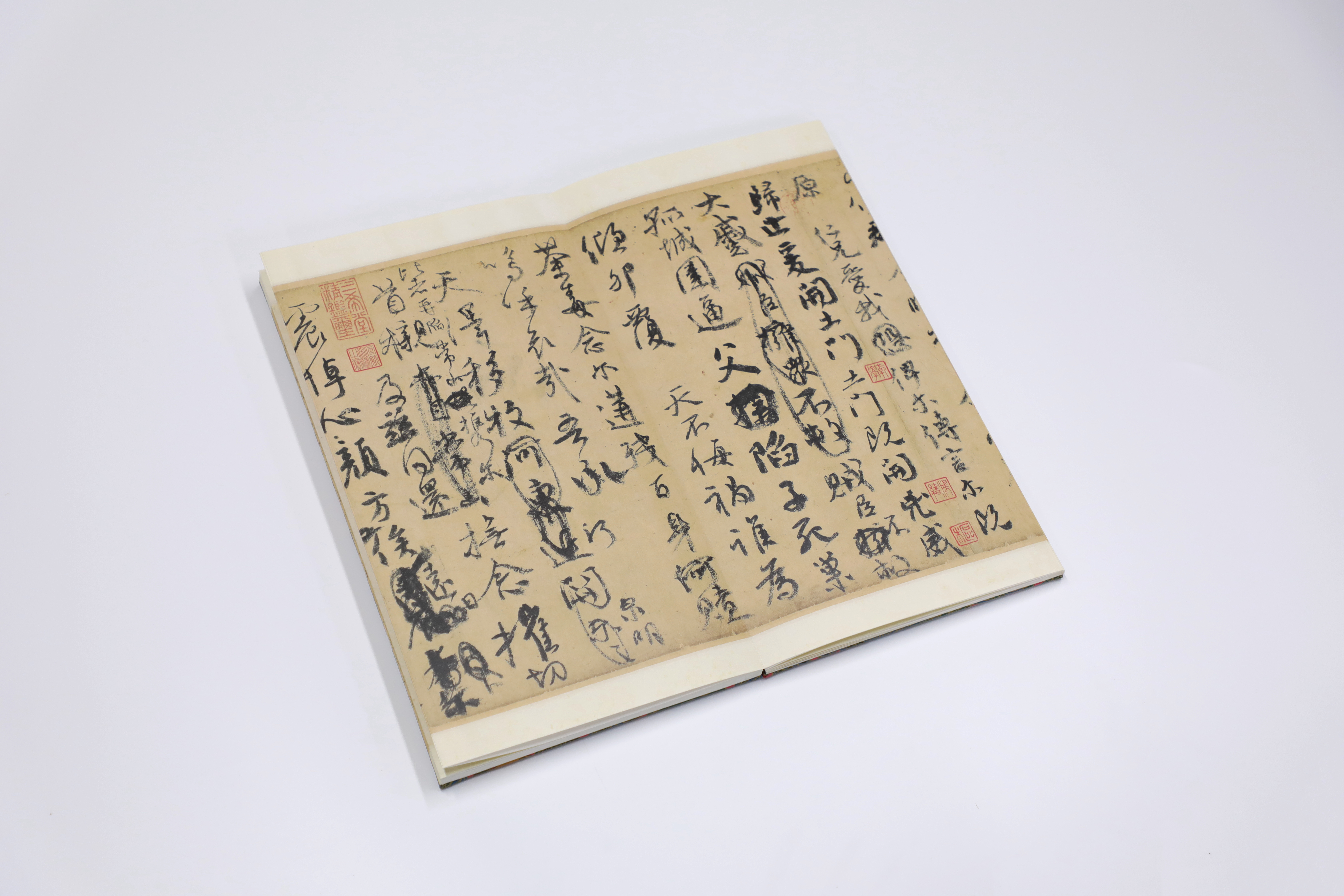 此次出版,也是《祭侄文稿》出版史上最完整的呈现,更完整地展现了作品现存状况的全貌。包括二玄社复制品中没有收录的手卷天头及隔水部分的同一纹样、不同色彩的几何花纹绫,《故宫法书新编》中没有收入的手卷天地绫边,以及便利堂复制品中鲜于枢跋后的所有题跋及尾纸,悉数收录呈现。