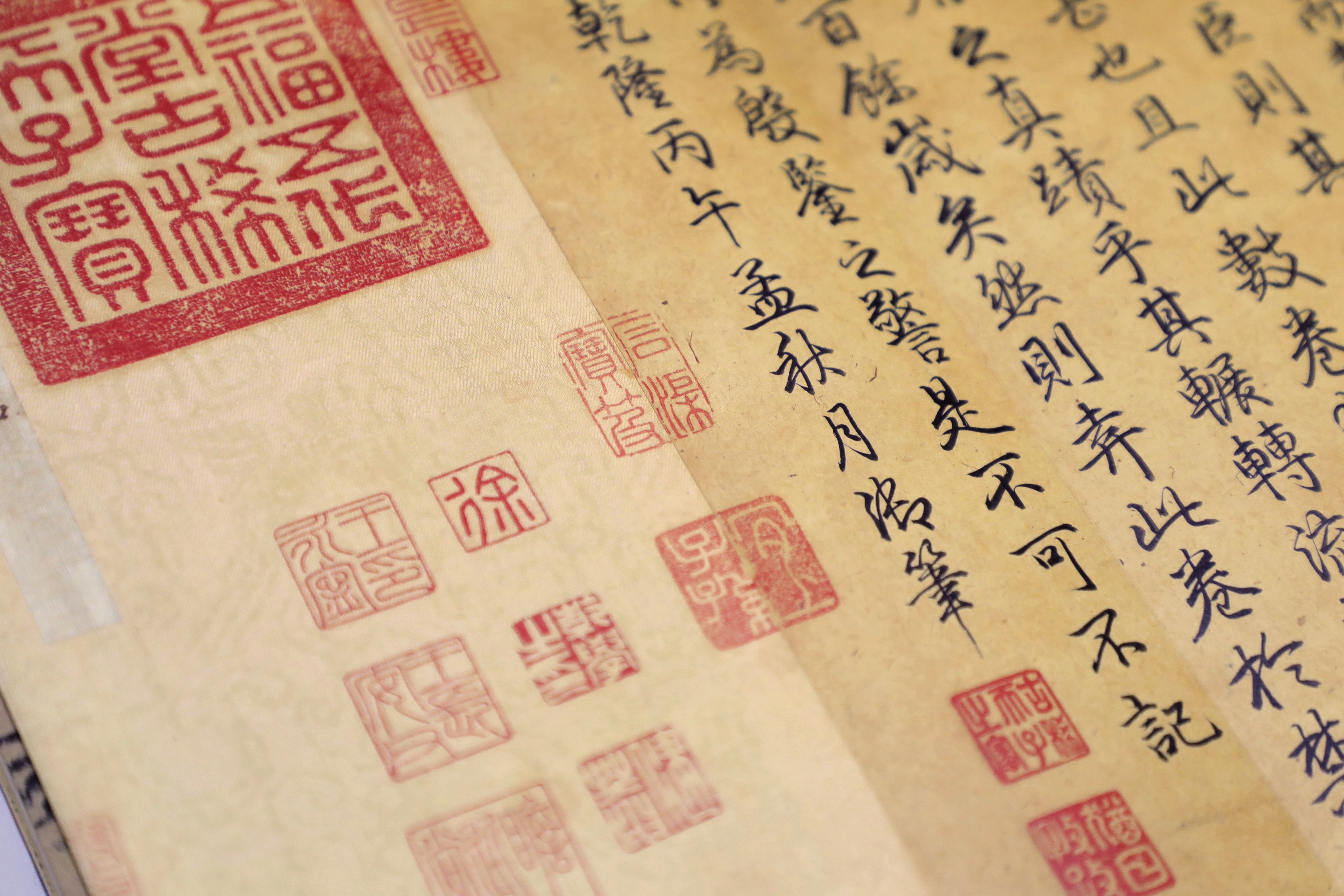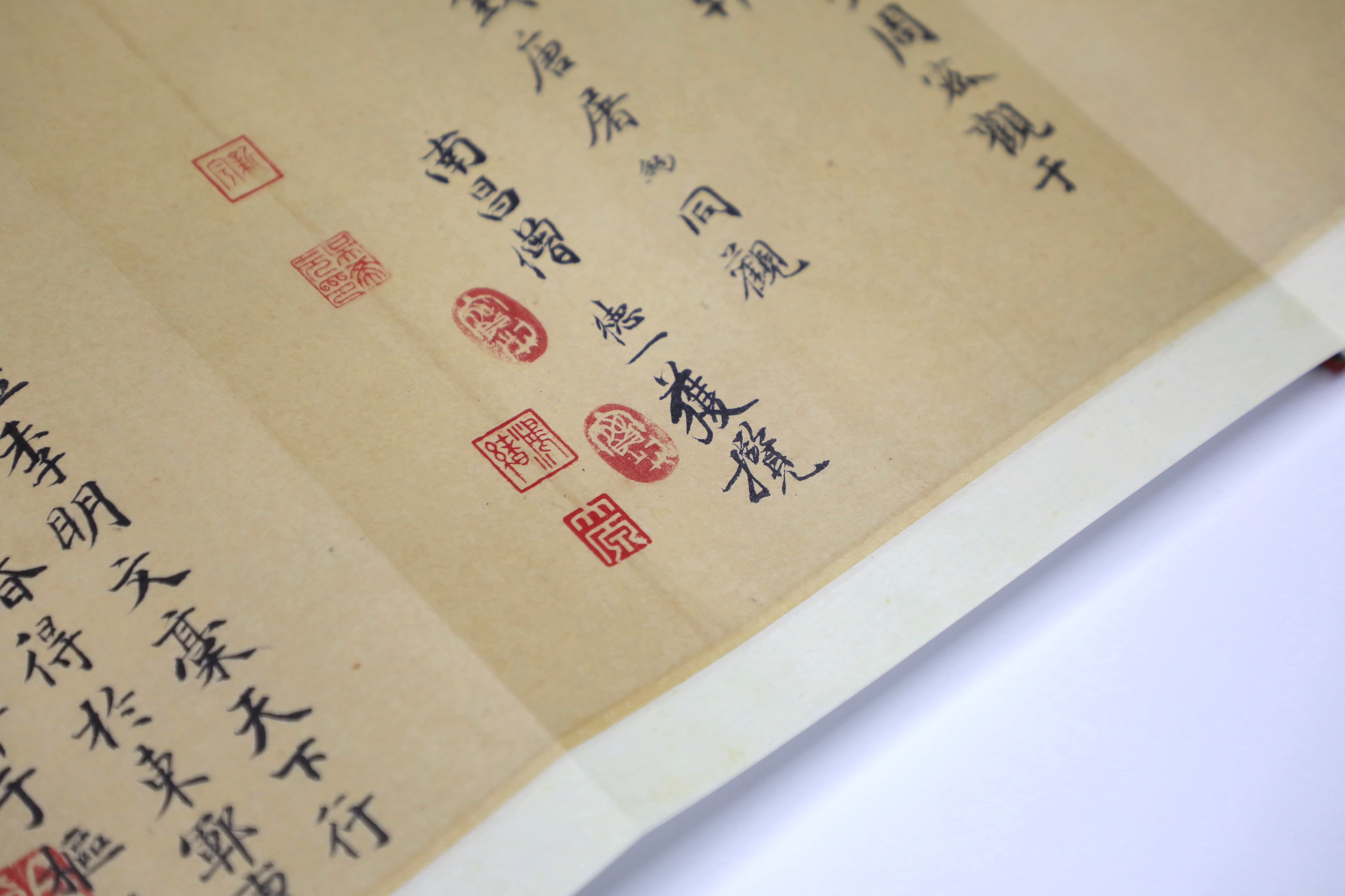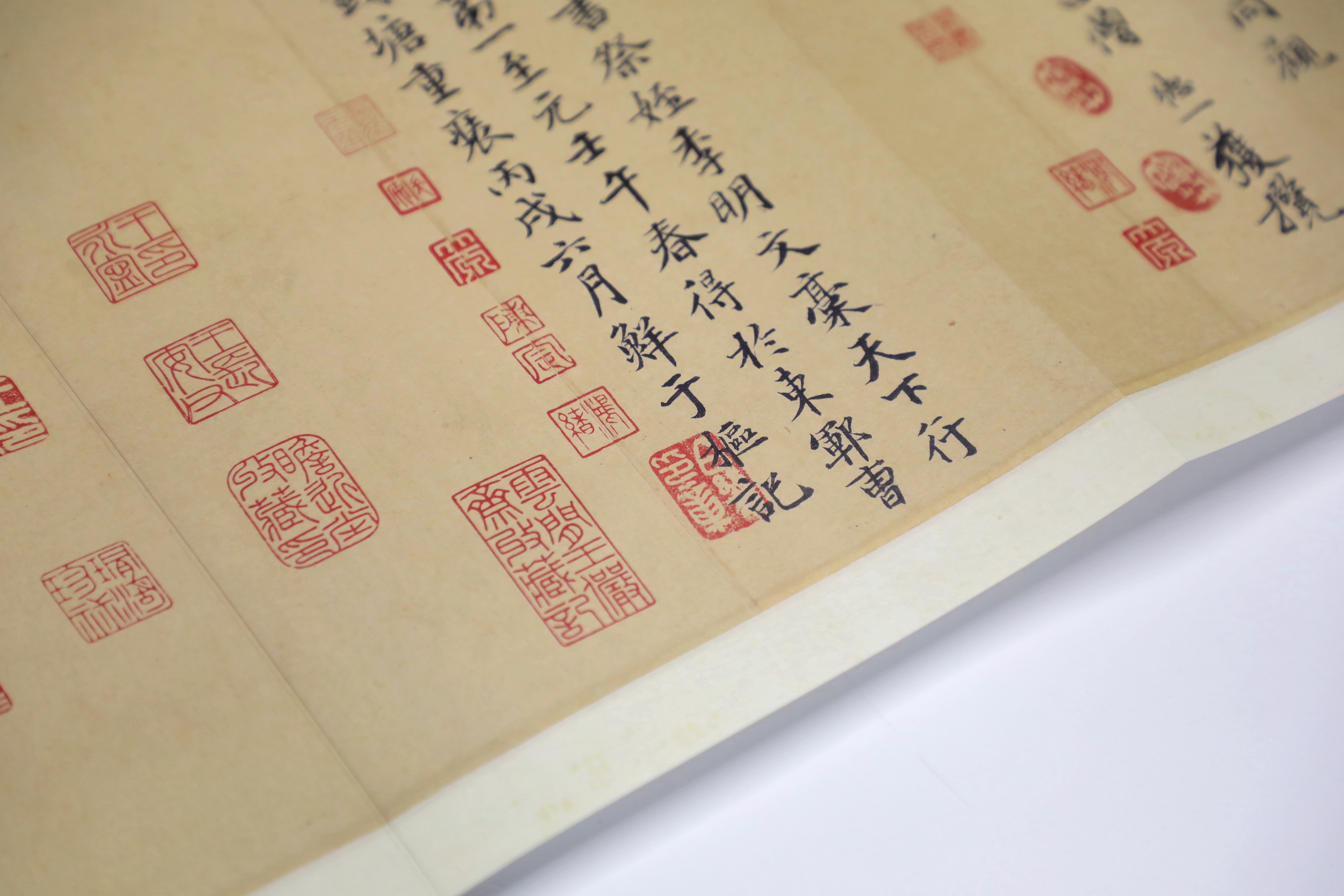 揽古堂主人袁宏浩根据2019年初日本东京国立博物馆的颜真卿大展现场对《祭侄文稿》原作的目鉴和现场笔记,精心调校还原本帖及前后题跋的墨色、不同年代不同纸张的质感与色彩,以及历代印鉴的印泥色彩。因为严谨认真,所以真实可信。