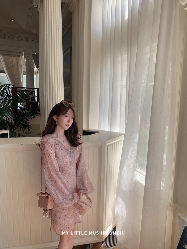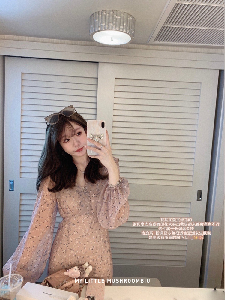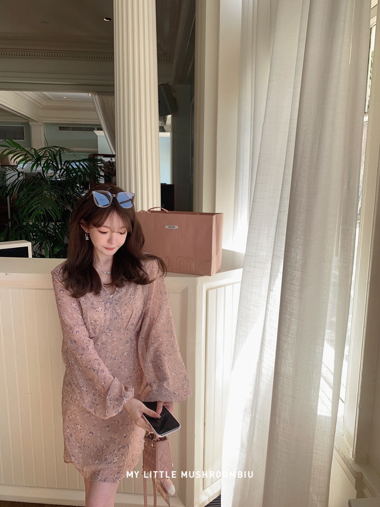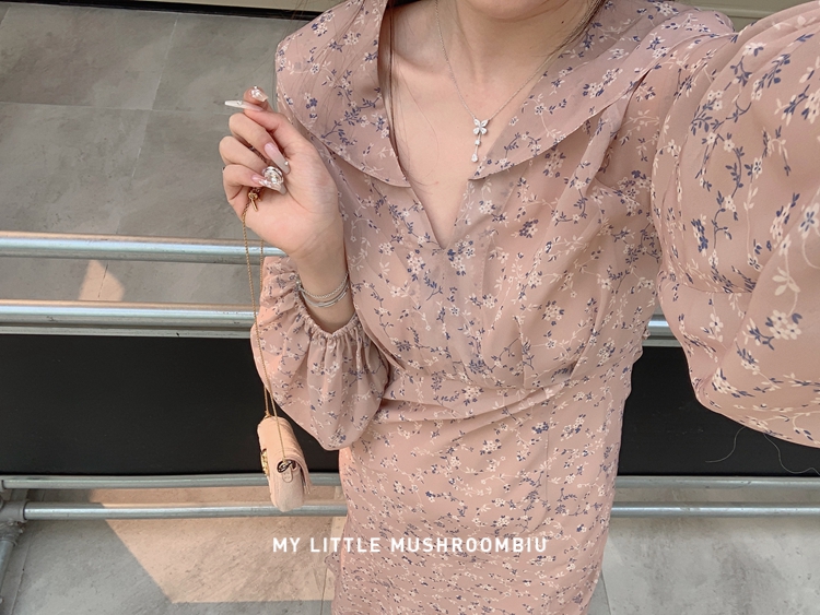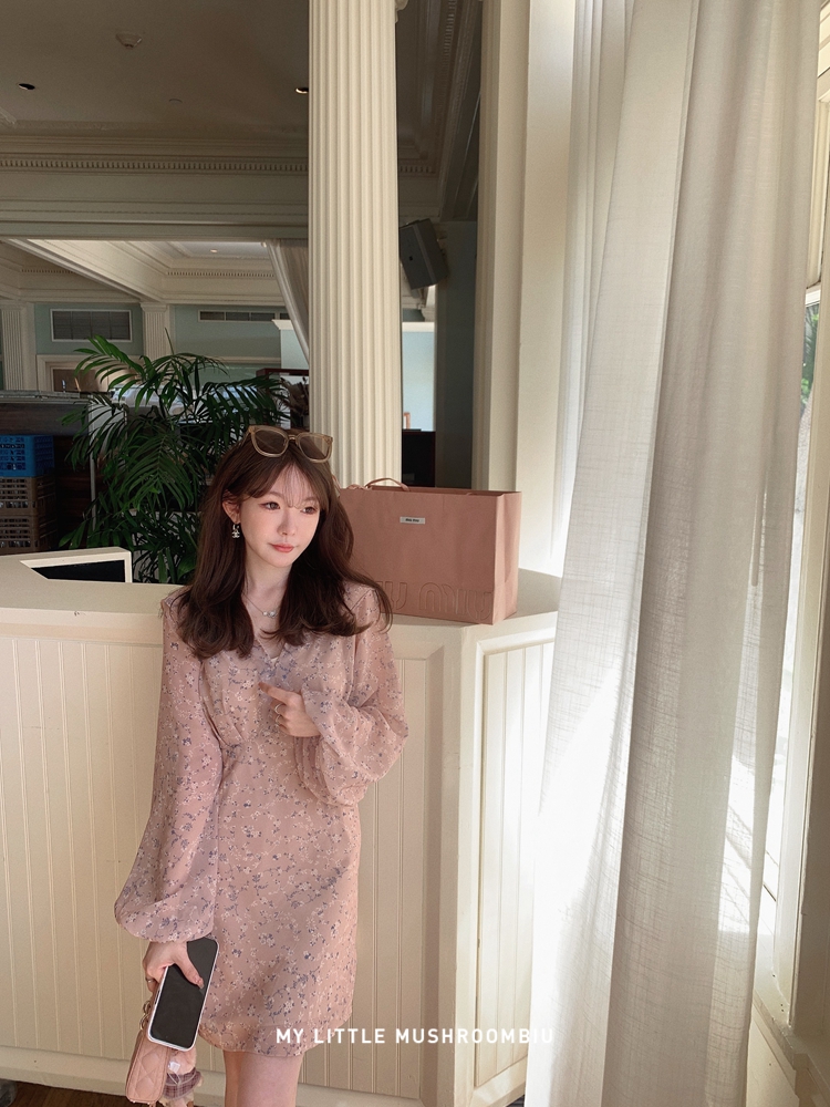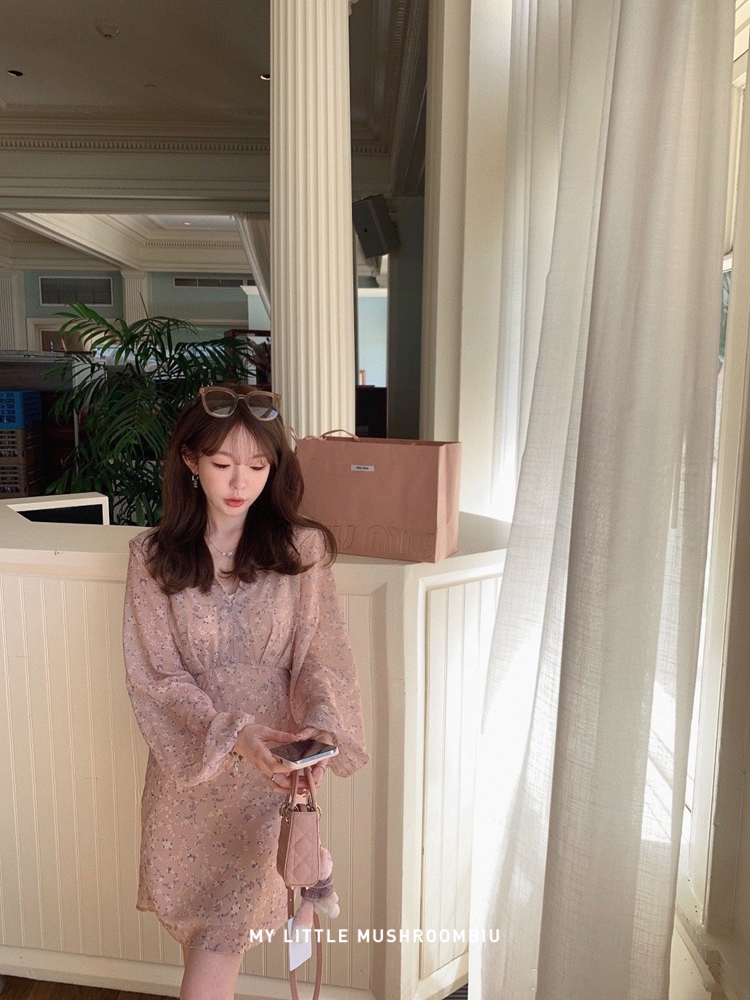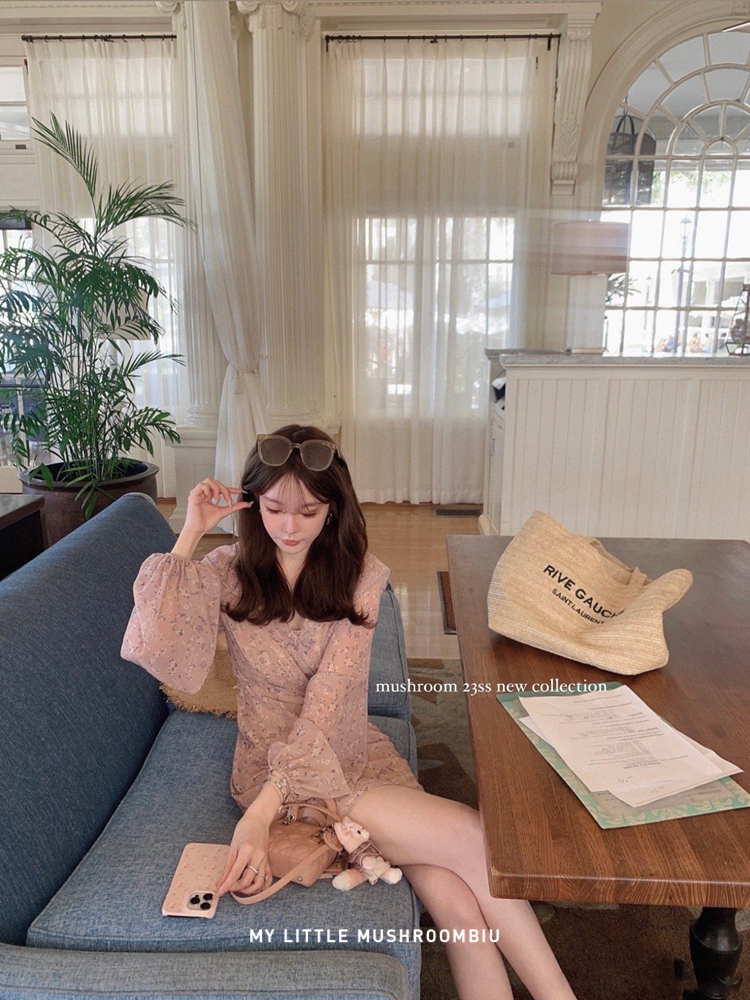 金蘑菇菇 crush 假日情诗 / 法式v领灯笼袖碎花裙高腰仙女连衣裙