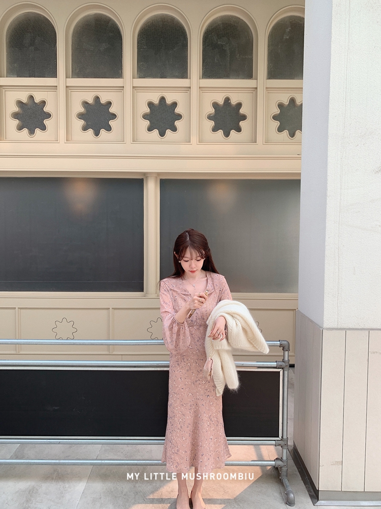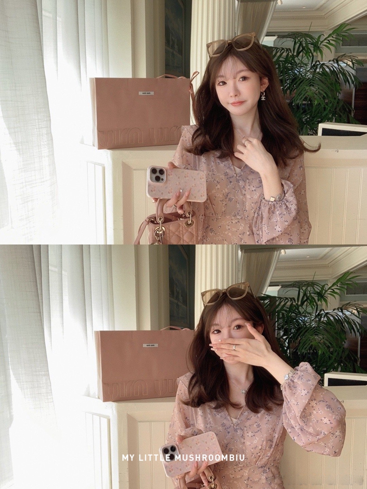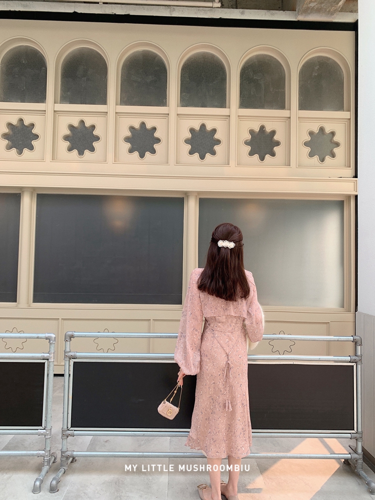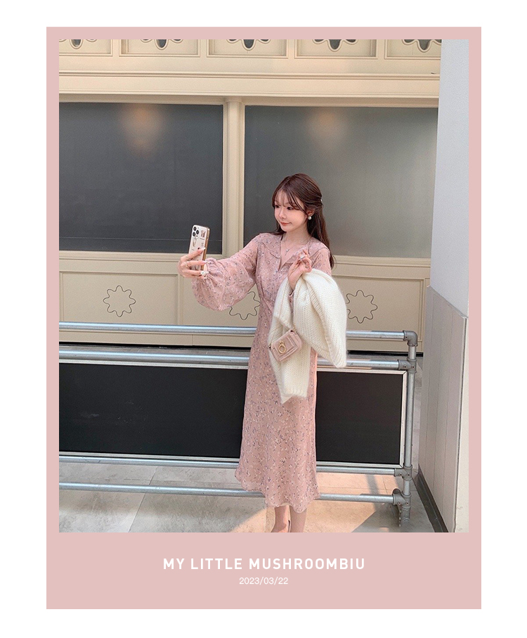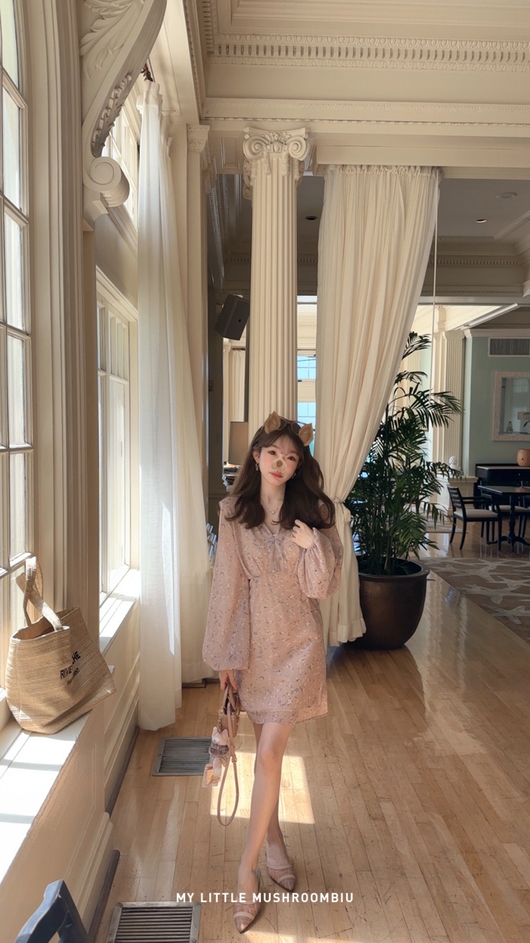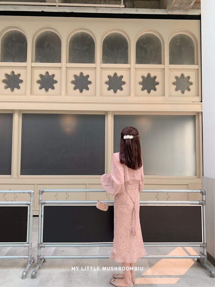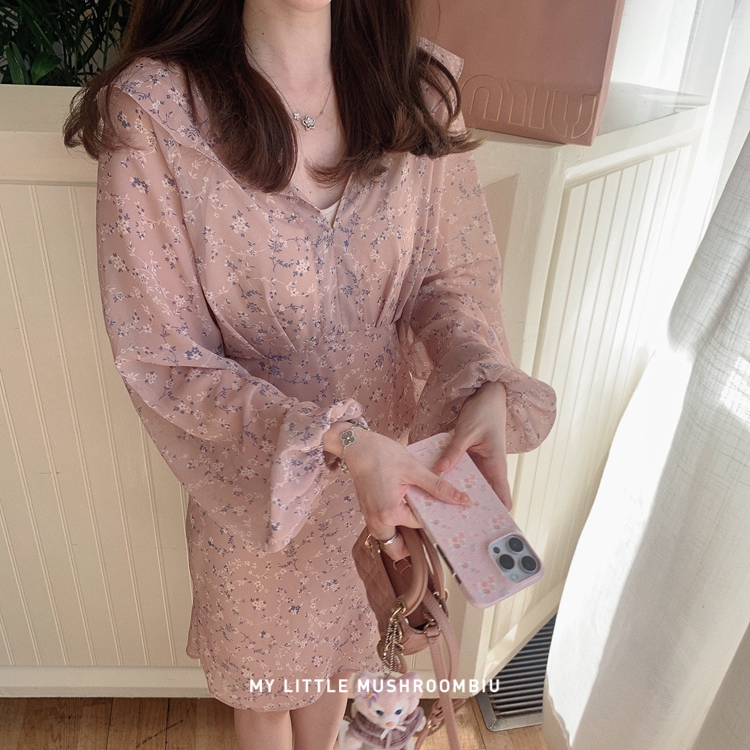 金蘑菇菇 crush 假日情诗 / 法式v领灯笼袖碎花裙高腰仙女连衣裙